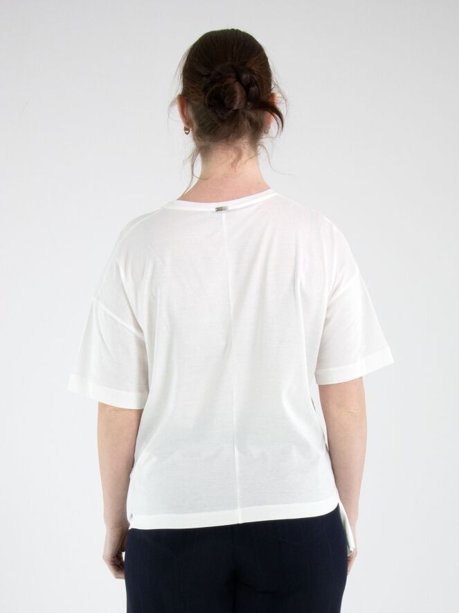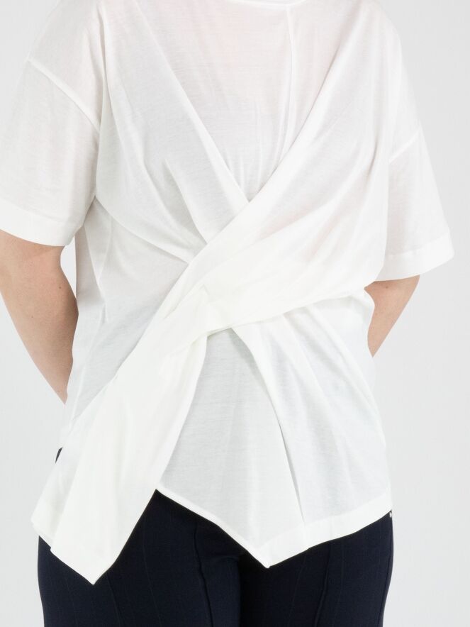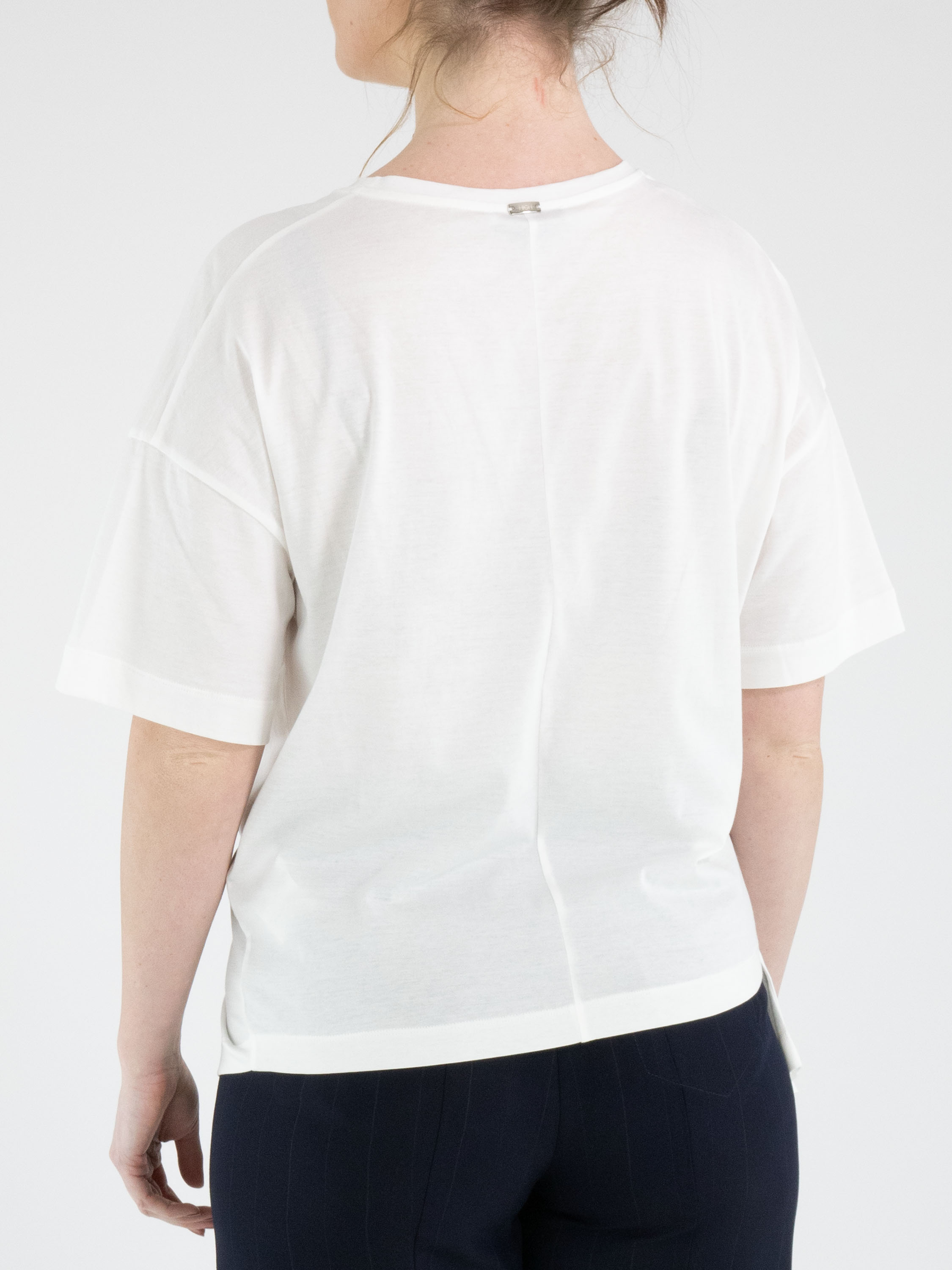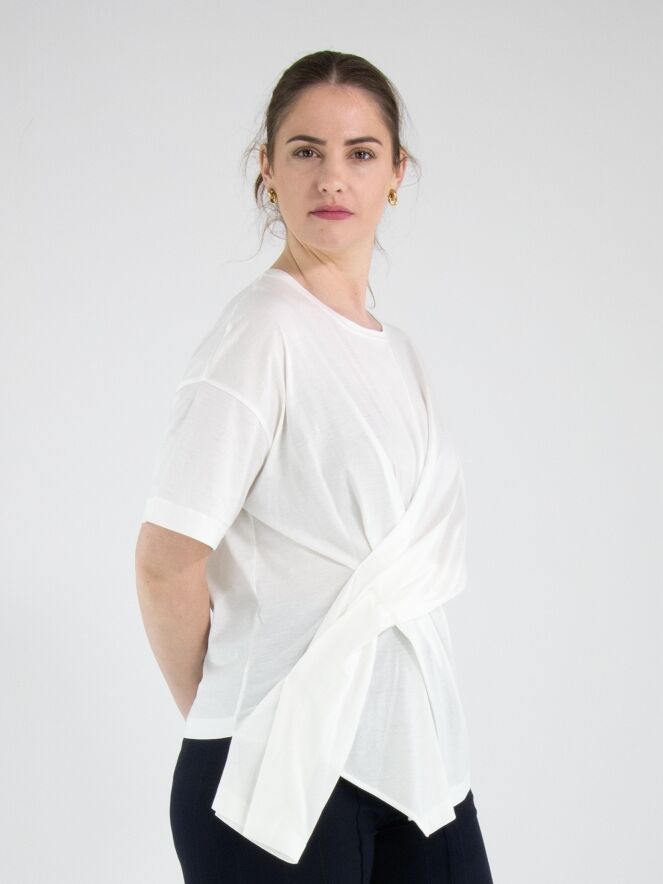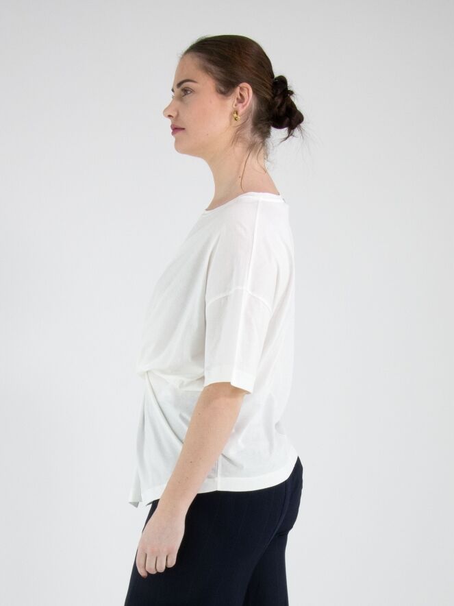 Een shirt van High in een roomwitte kleur. Optisch gezien is het een overslagshirt door het creëren van enkele plissés rechts van de taille. Het shirt heeft een ronde hals en korte mouwen. Dit shirt mag op de hand worden gewassen.