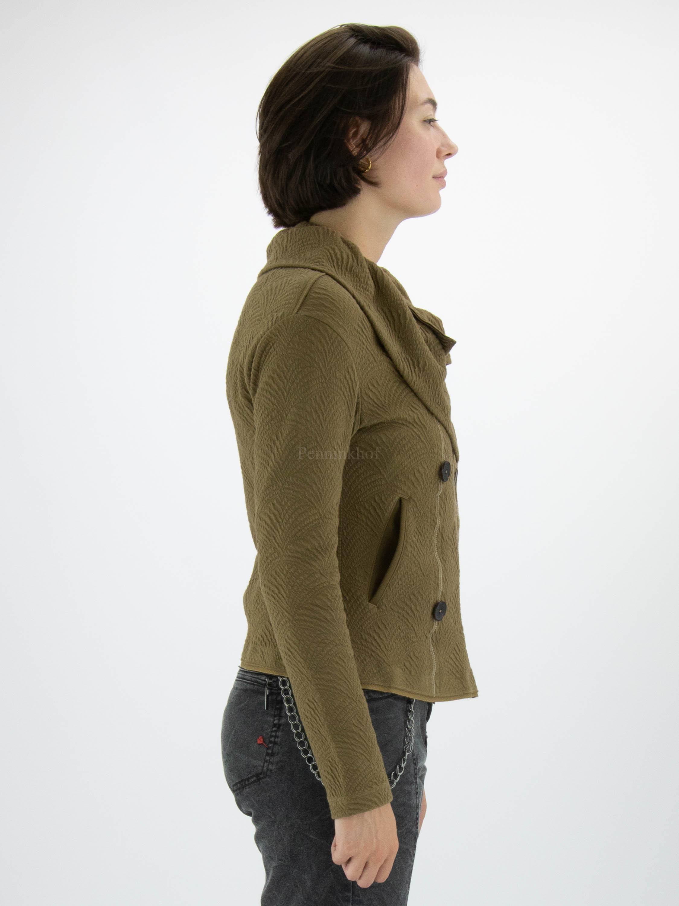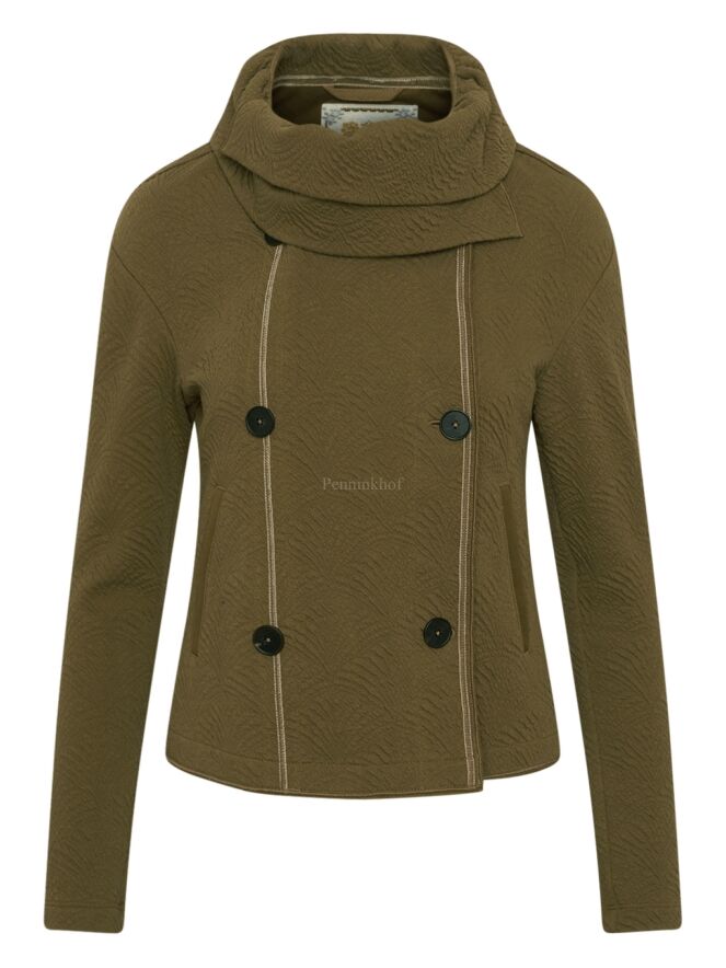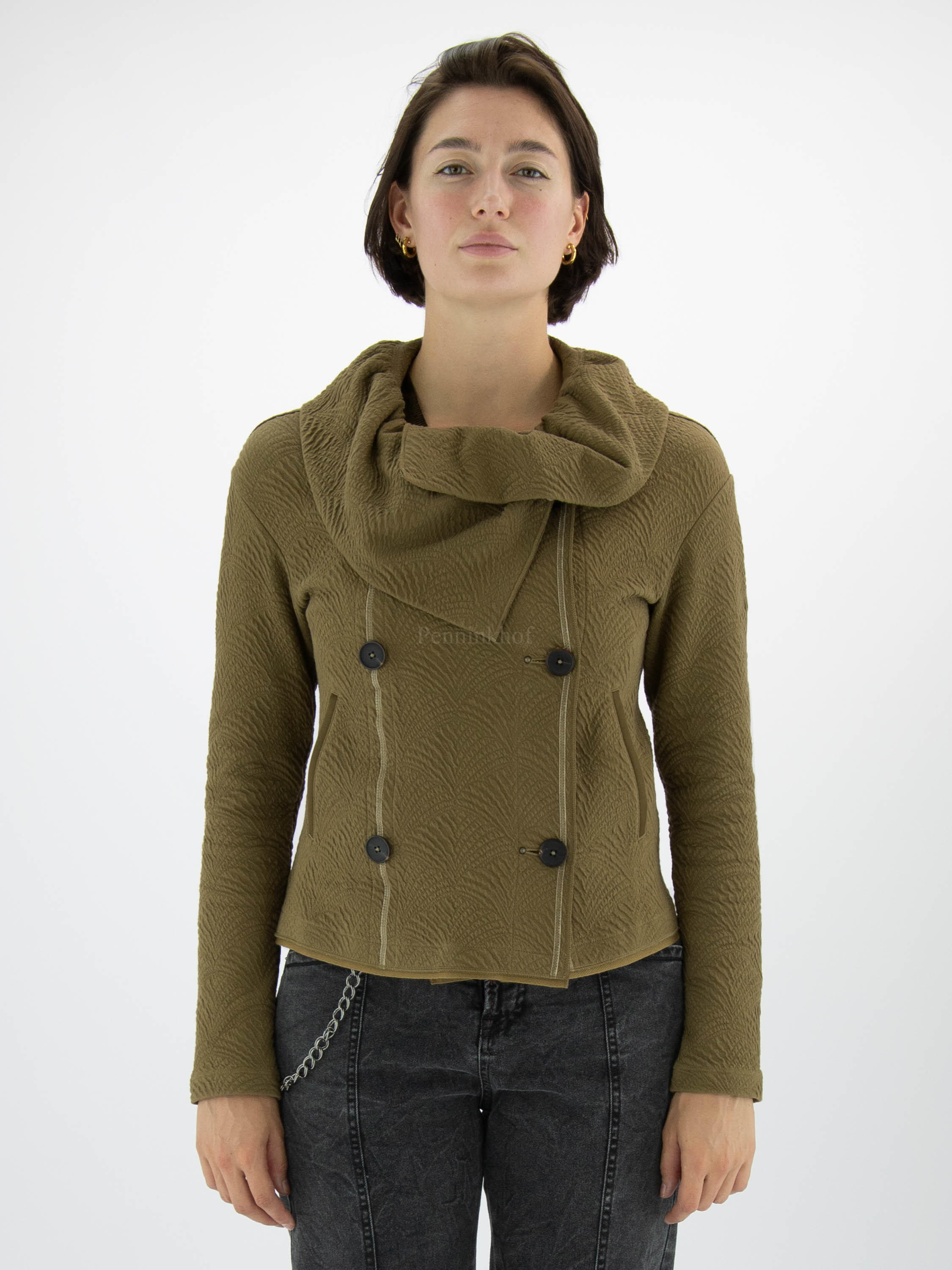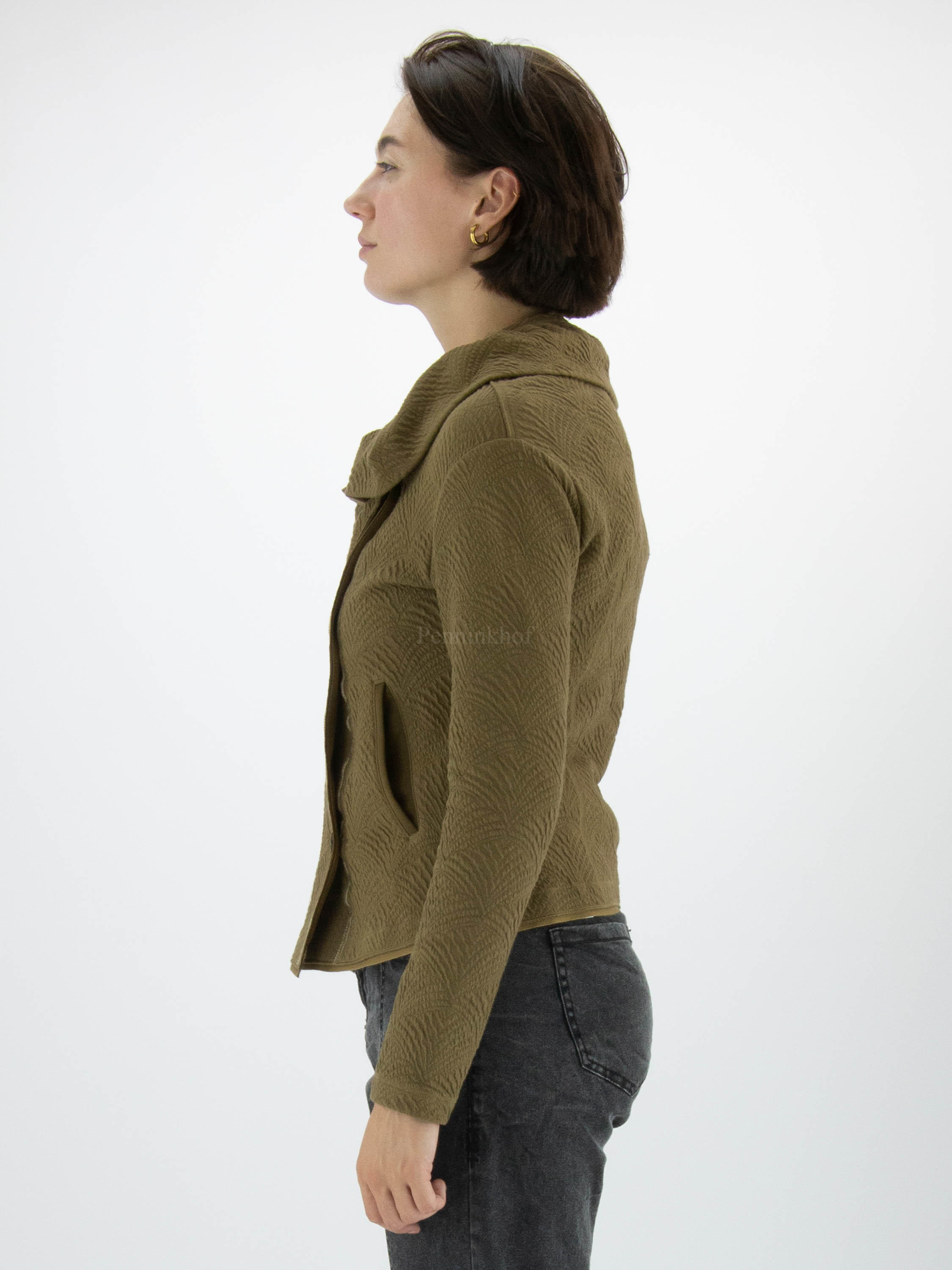 Een double breasted blazer van High in de kleur olijfgroen. De stof is in een barok structuur. De blazer heeft een brede overslag kraag. Ter hoogt evan de taille zijn steekzakken. deze blazer mag op de hand worden gewassen.