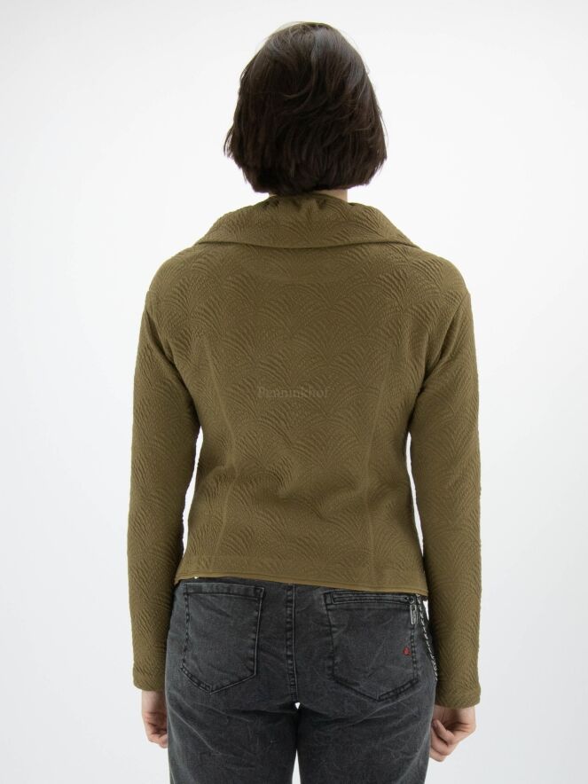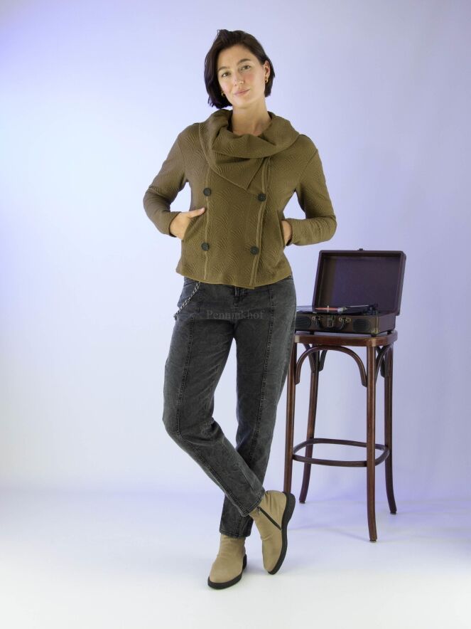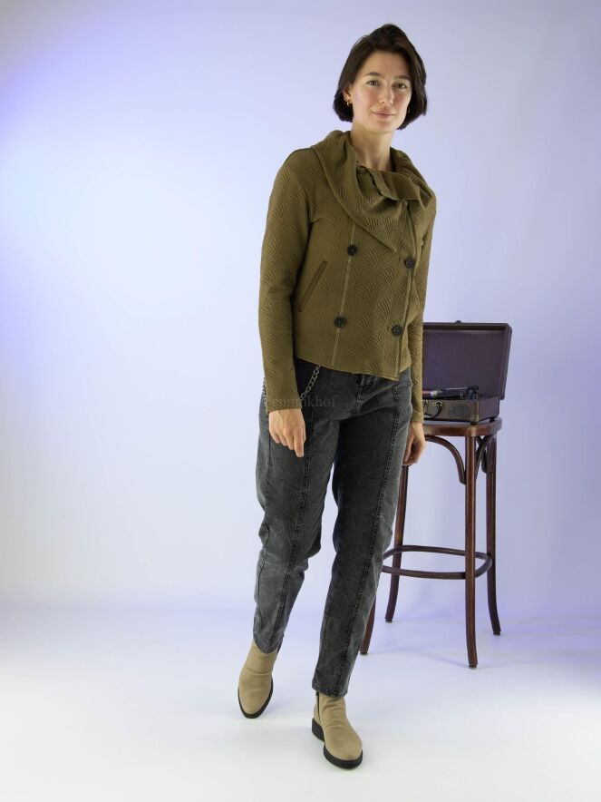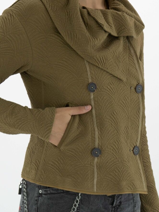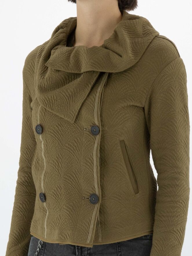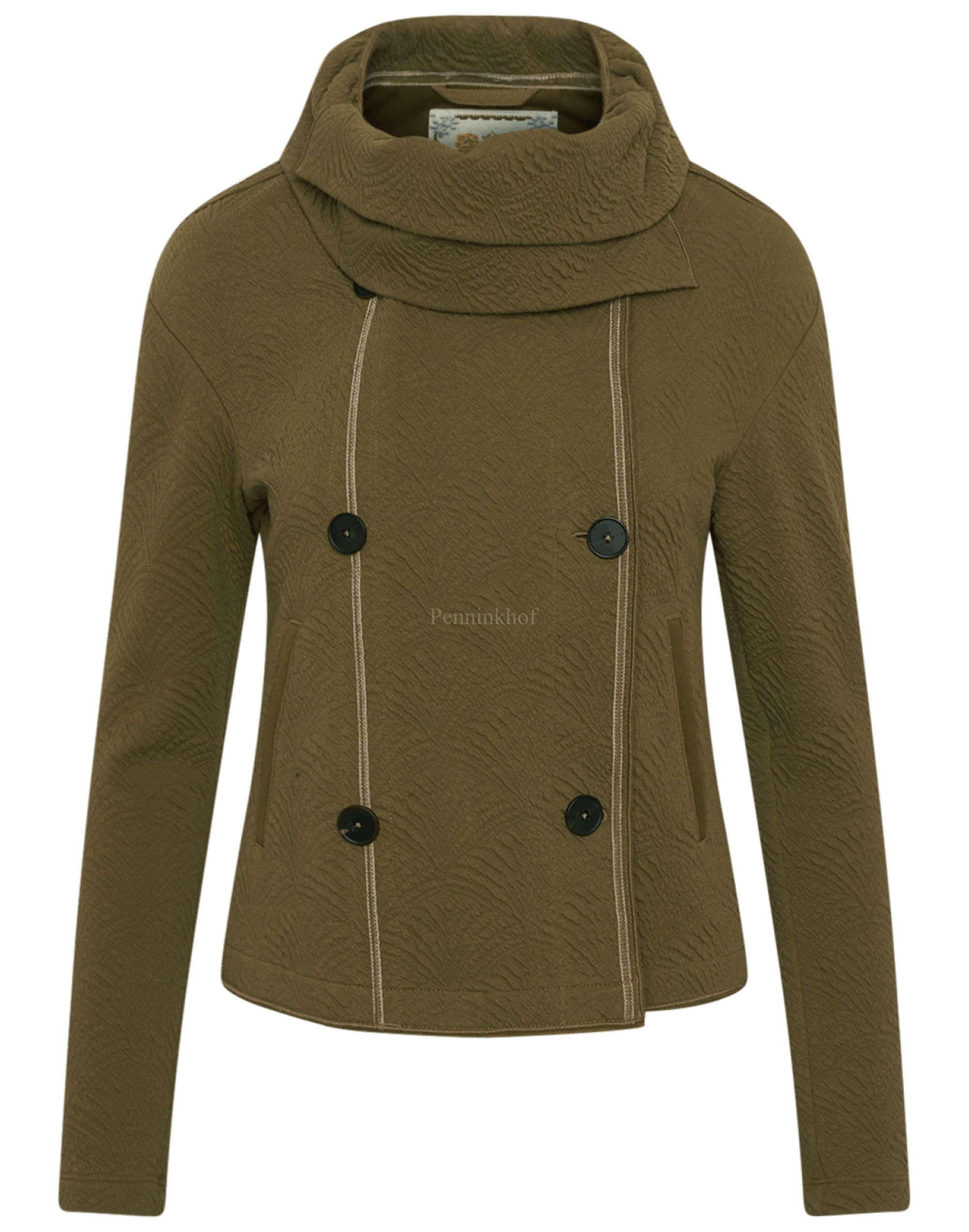 Een double breasted blazer van High in de kleur olijfgroen. De stof is in een barok structuur. De blazer heeft een brede overslag kraag. Ter hoogt evan de taille zijn steekzakken. deze blazer mag op de hand worden gewassen.