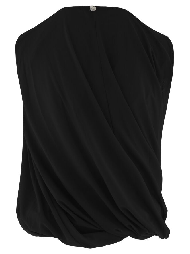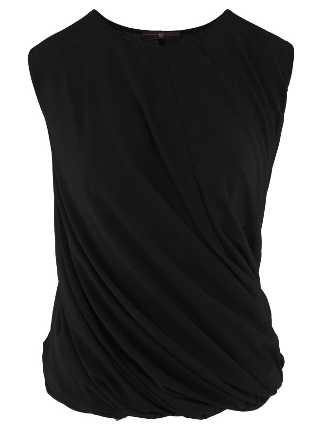 Een top van High in de kleur zwart. De top is uitgevoerd met een dubbele stof die aan de binnenzijde is gedraaid, wat zorgt voor een uniek drapeereffect. De top heeft een ronde hals en kan met de hand worden gewassen.