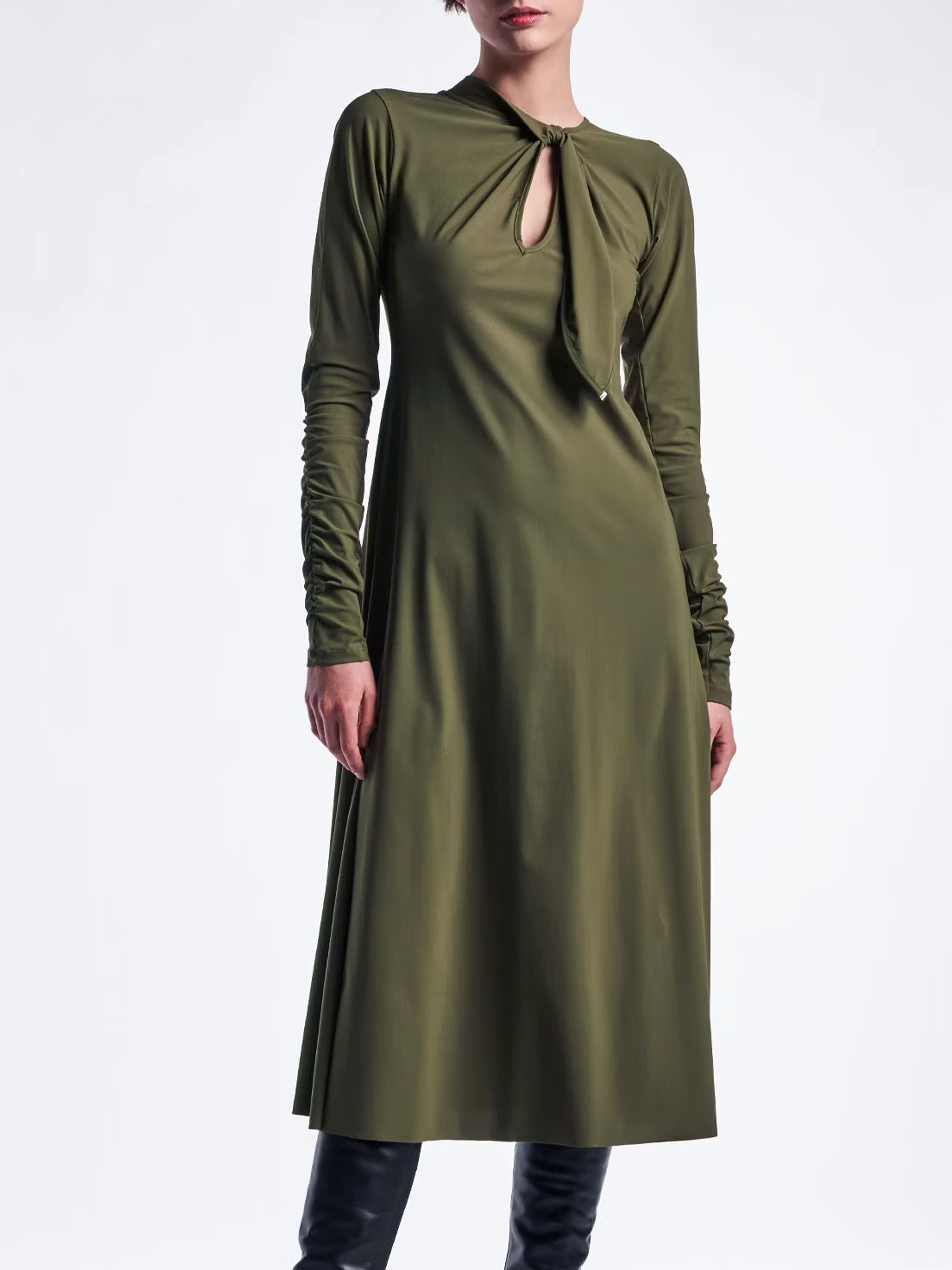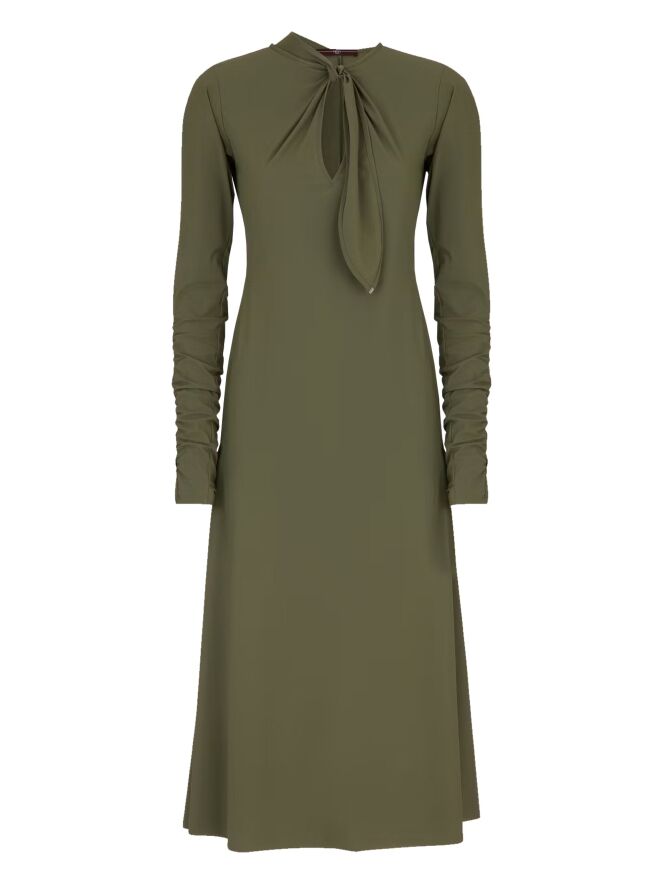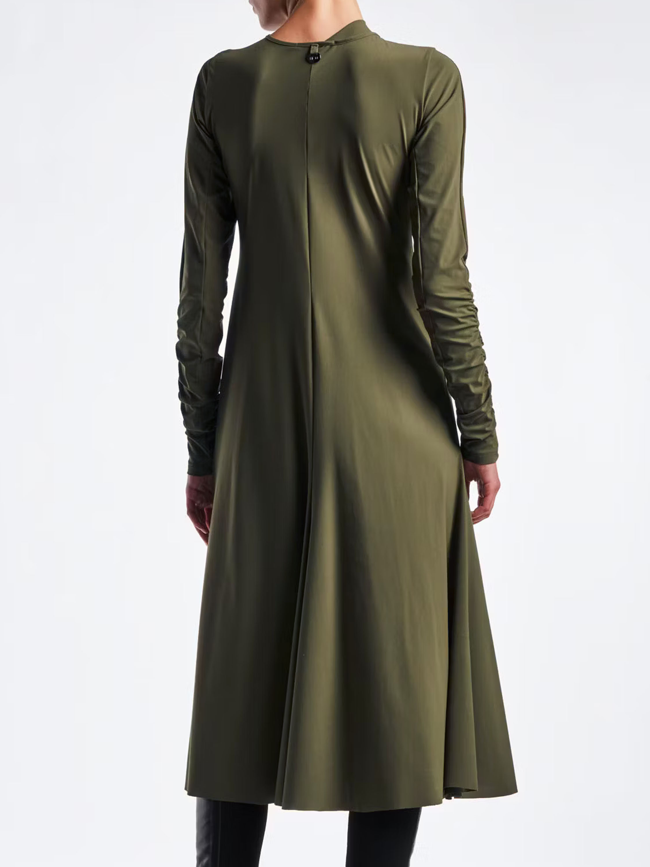 Een jurk van High in de kleur olijfgroen. In het midden van de hoge ronde hals is een overslag met een uitsnijding tot de buste. De stof van de lange mouwen is vanaf de elleboog fijn geplooid langs de stiknaad. Vanuit de taille heeft de jurk een lichte A-lijn. Deze jurk mag met de hand worden gewassen.