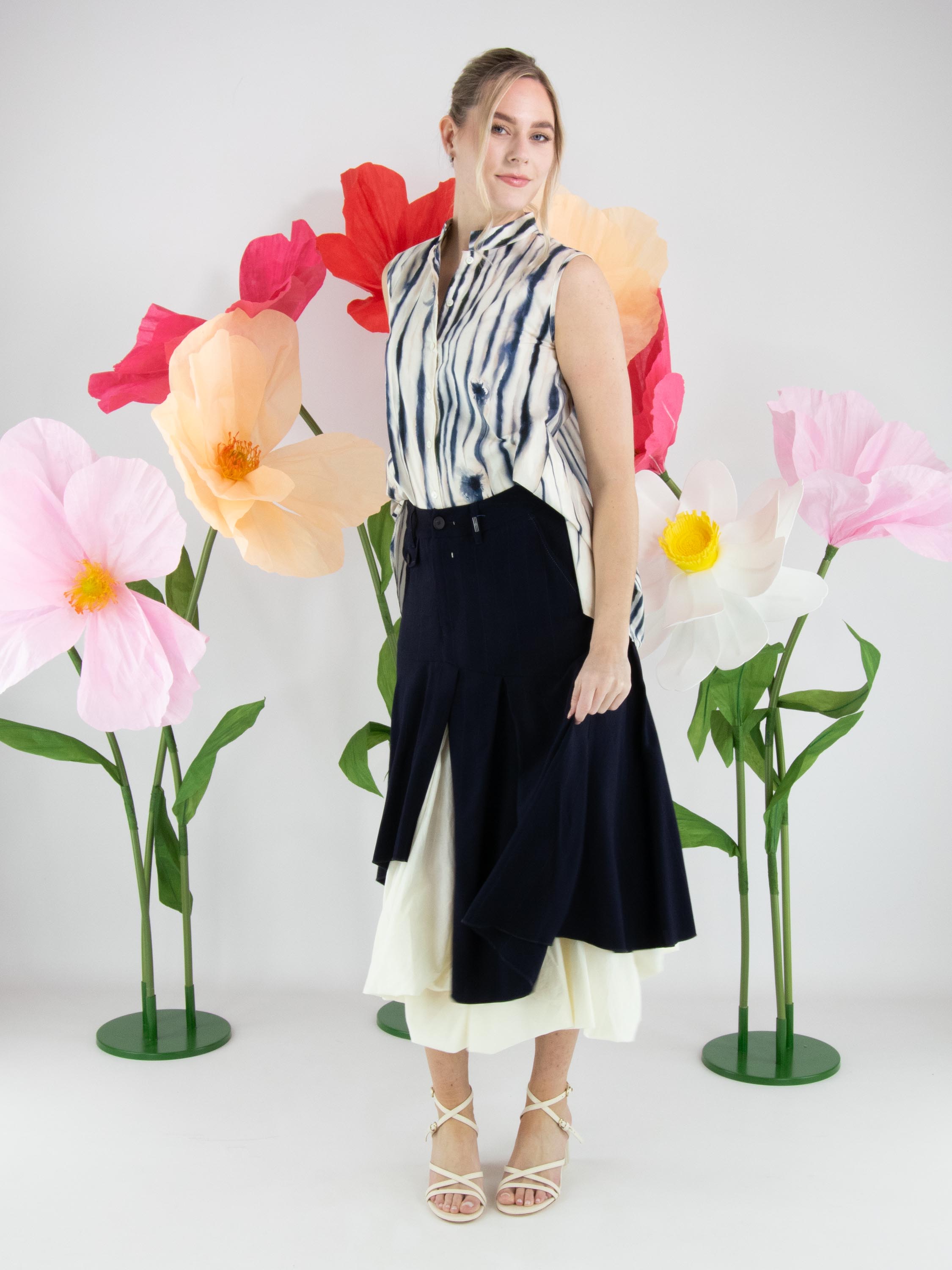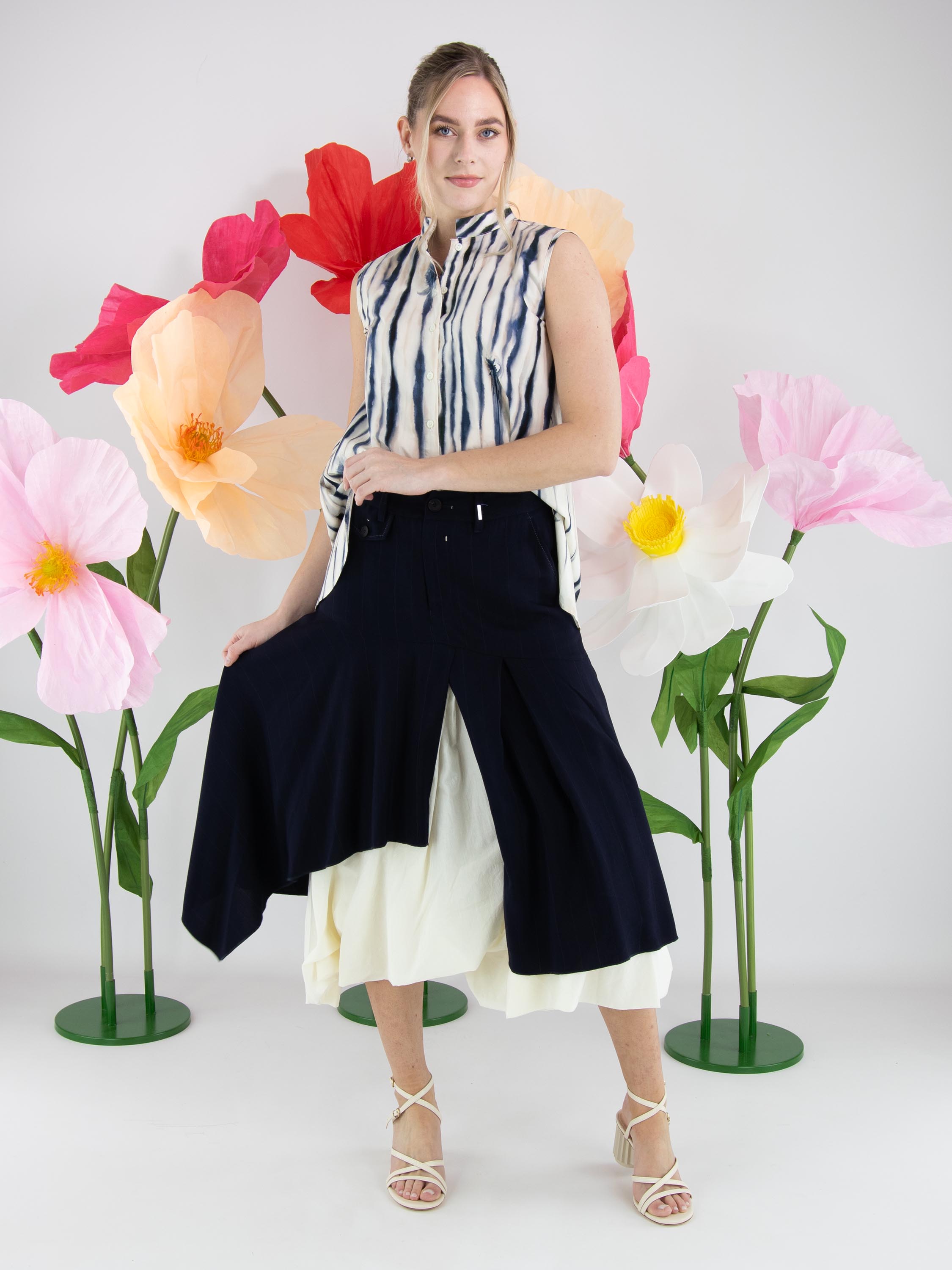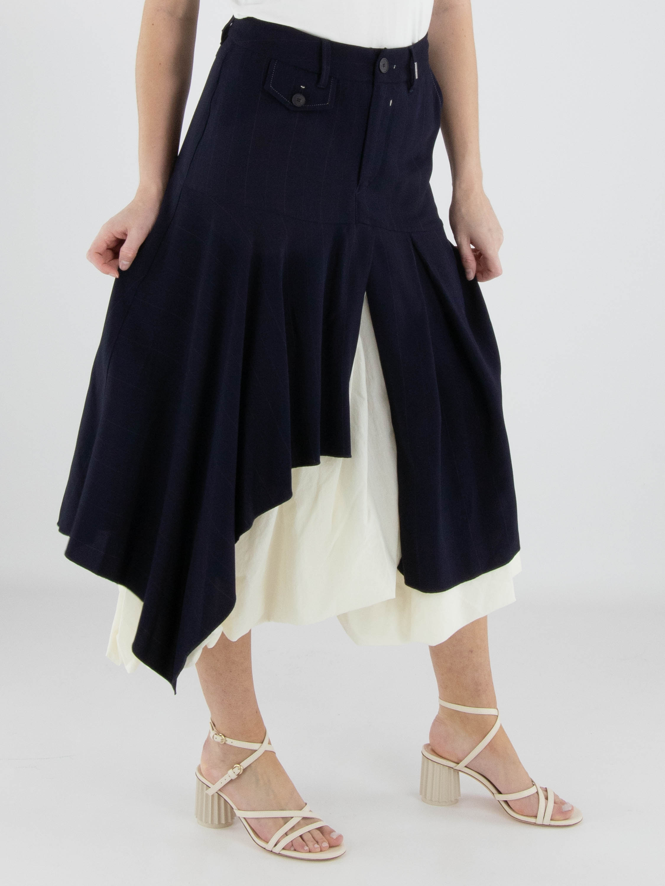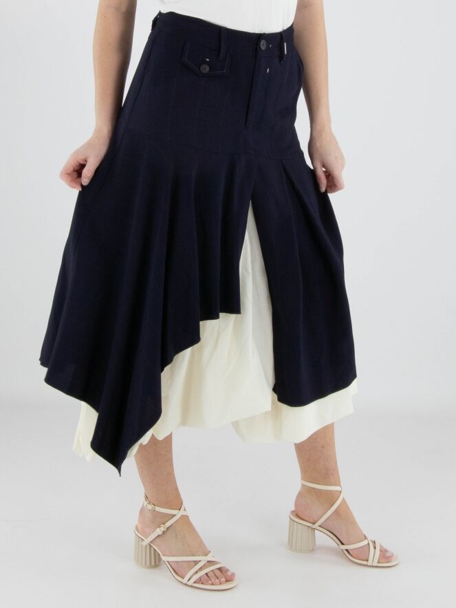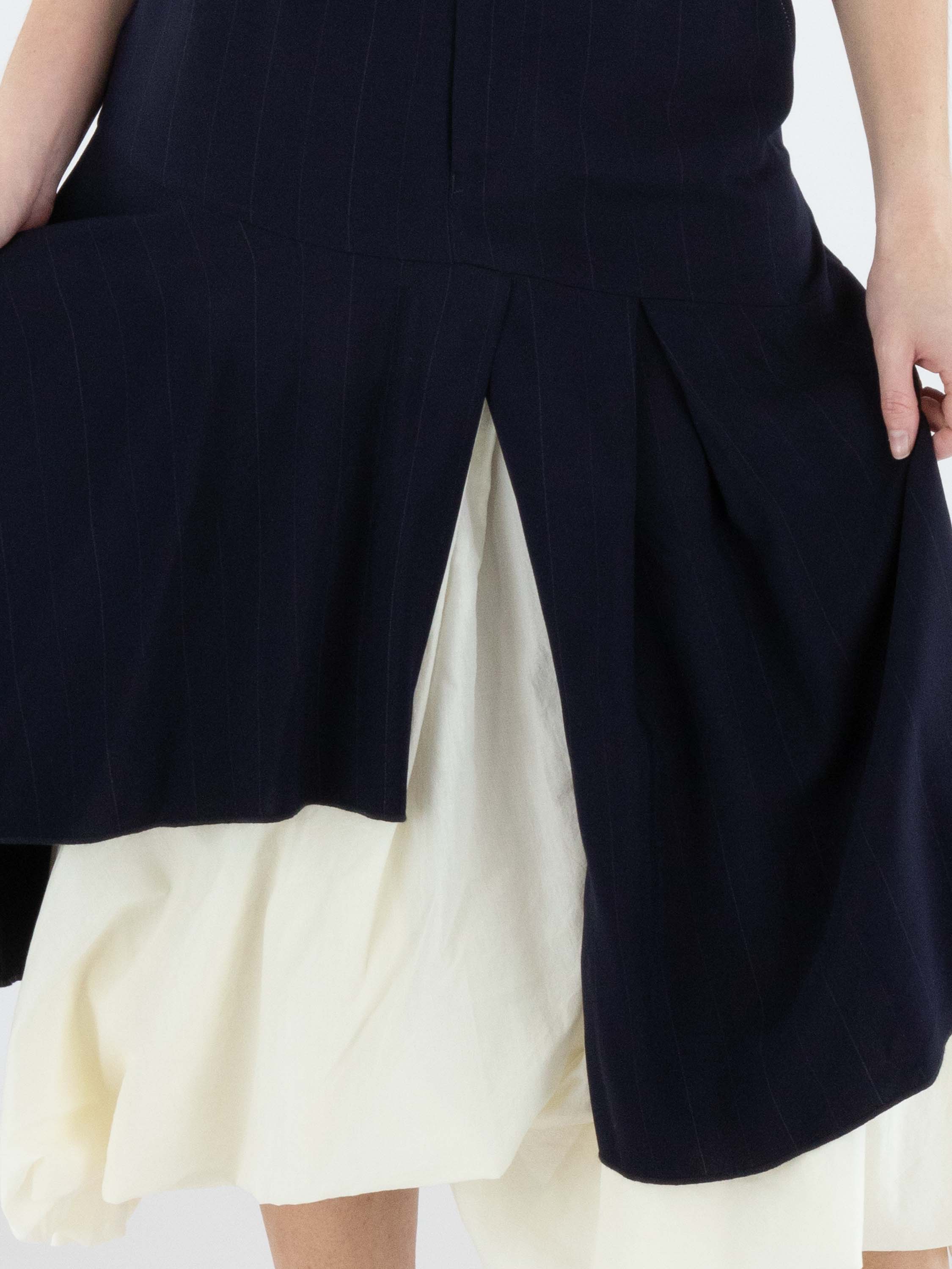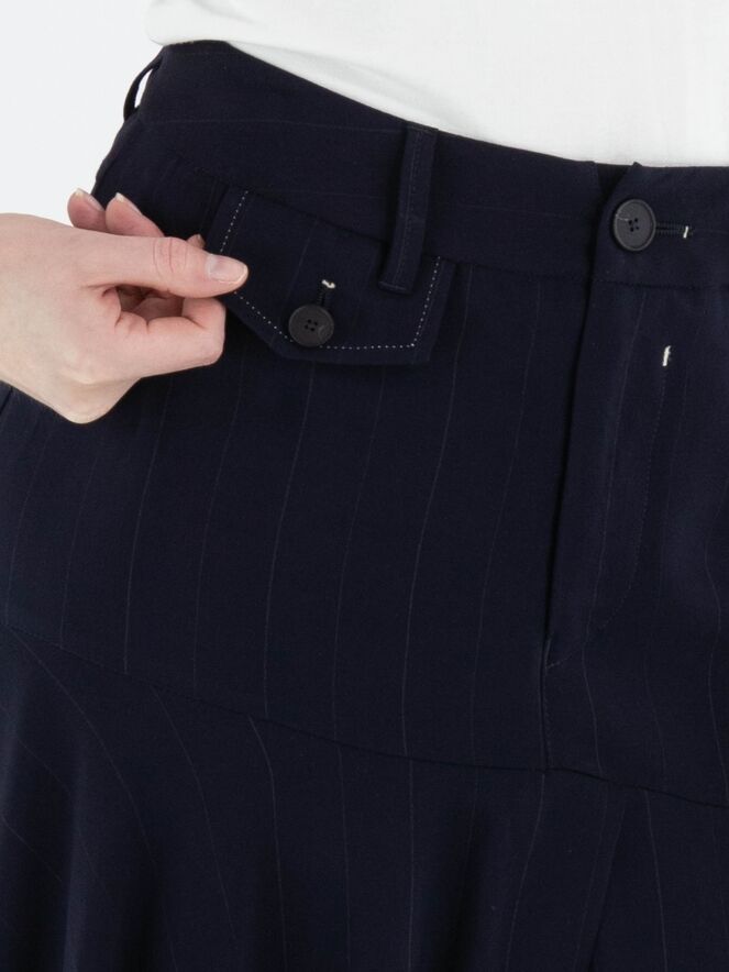 Rok van High in een verfijnd krijtstreeppatroon in marineblauw en roomwit. Ter hoogte van de heup loopt een diagonale stiknaad, waaronder meerdere plissés zijn aangebracht die zorgen voor een speels en dynamisch effect. Vanuit deze naad bevindt zich middenvoor een split, waaronder een effen tweede stof zichtbaar wordt, wat een subtiel gelaagd contrast creëert. De rok heeft een flatterende A-lijn en mag niet worden gewassen.