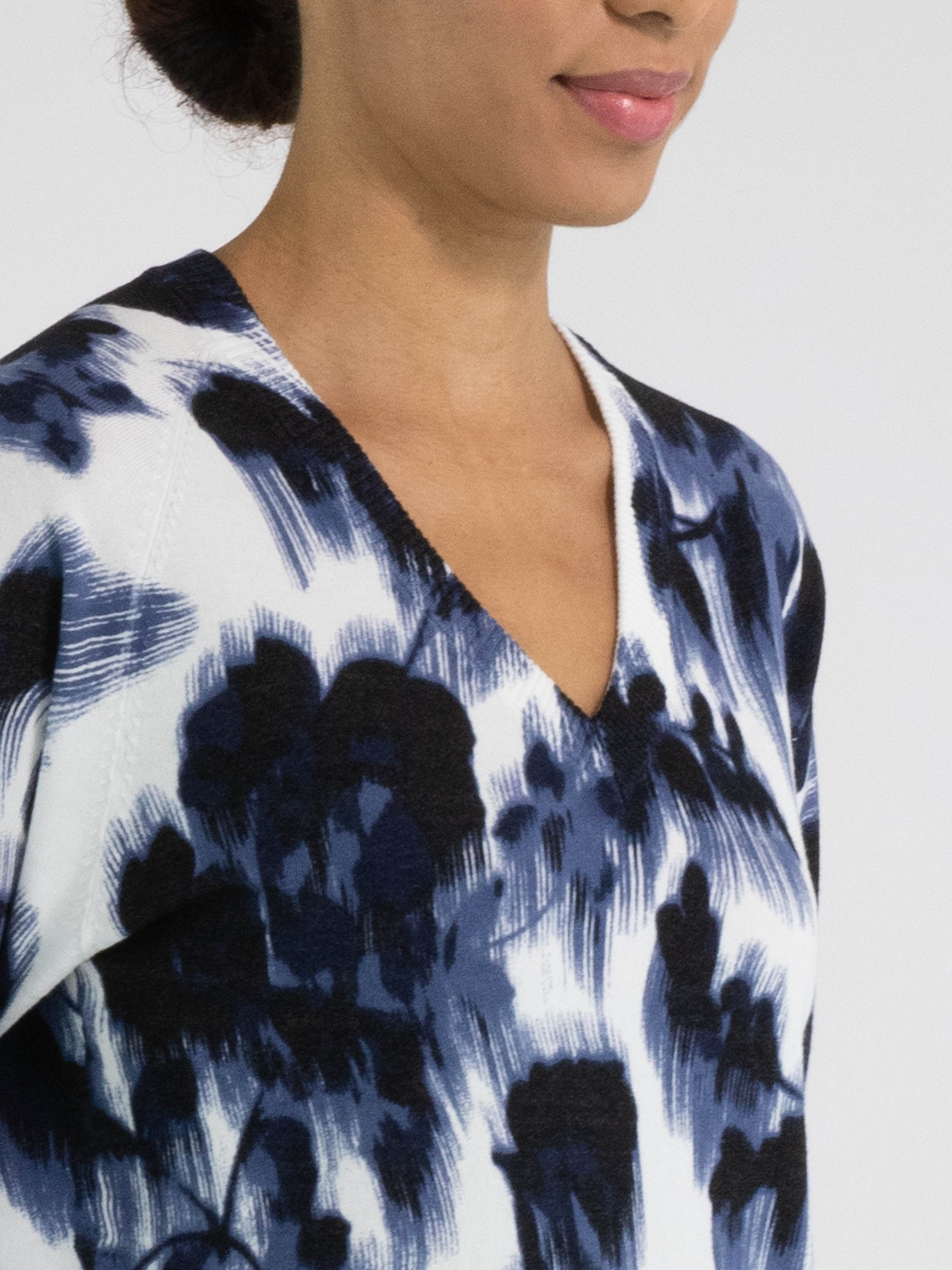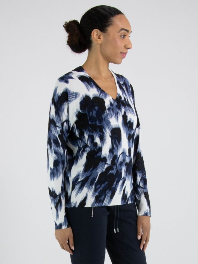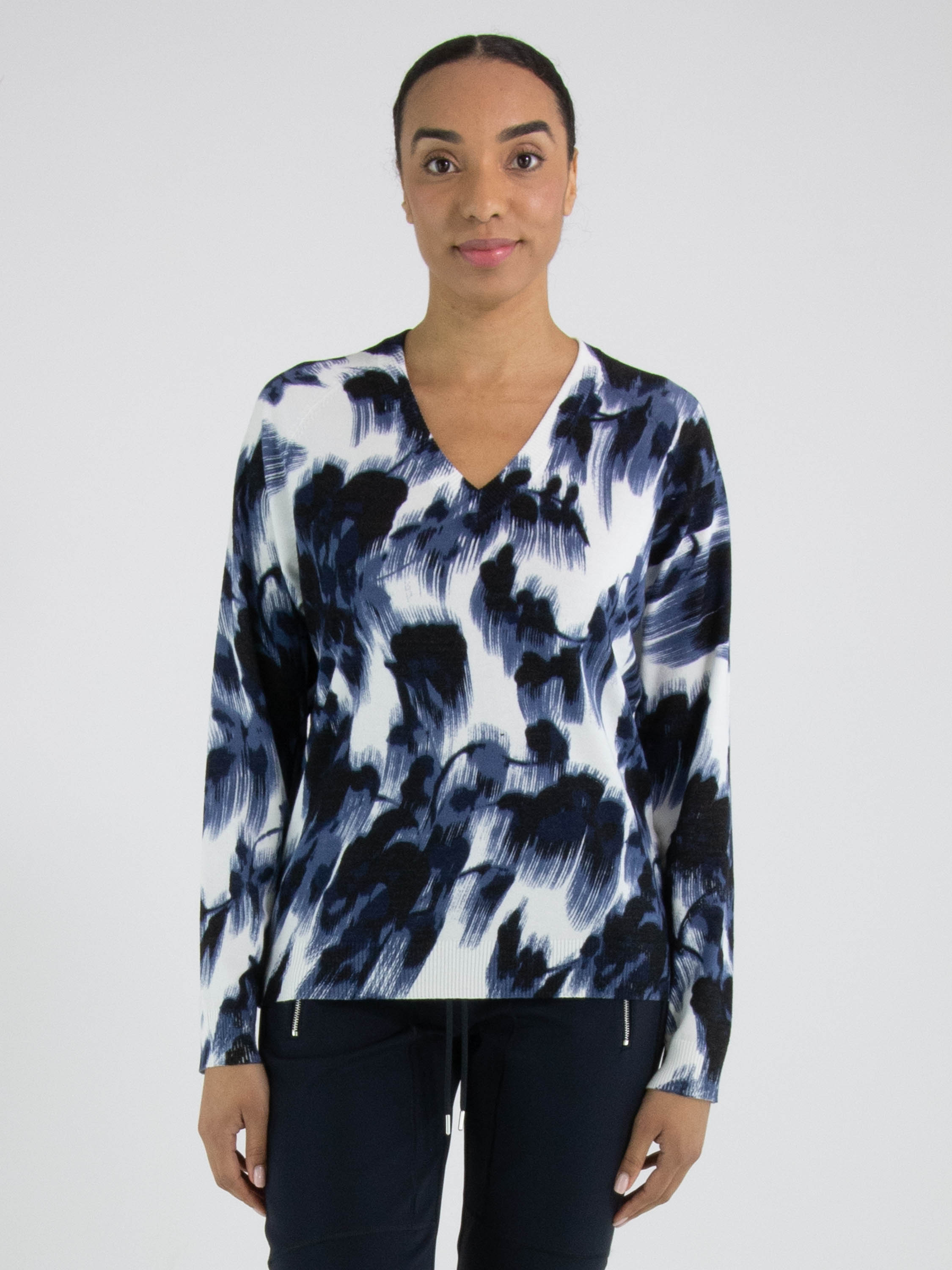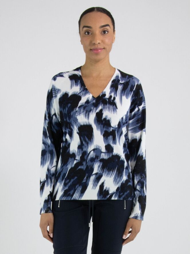 Een pullover van High Tech in een grafische print met meerdere tinten blauw. Langs de rand van de V-hals, de uiteinden van de lange mouwen en de onderkant is een fijn geribbelde tricot boord. Deze pullover mag niet worden gewassen.
