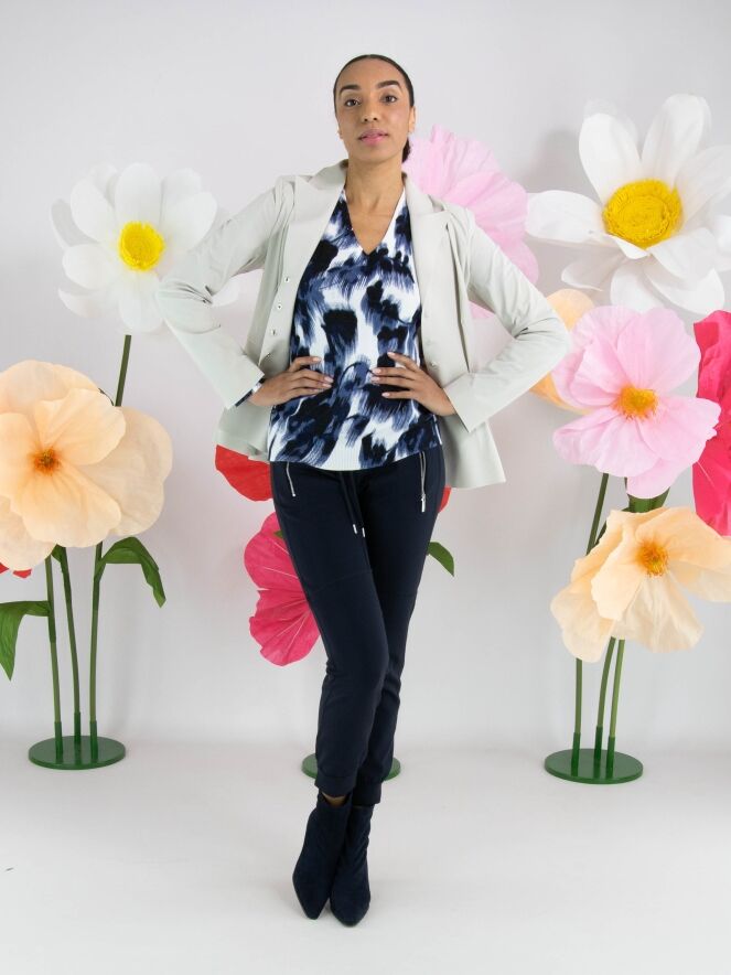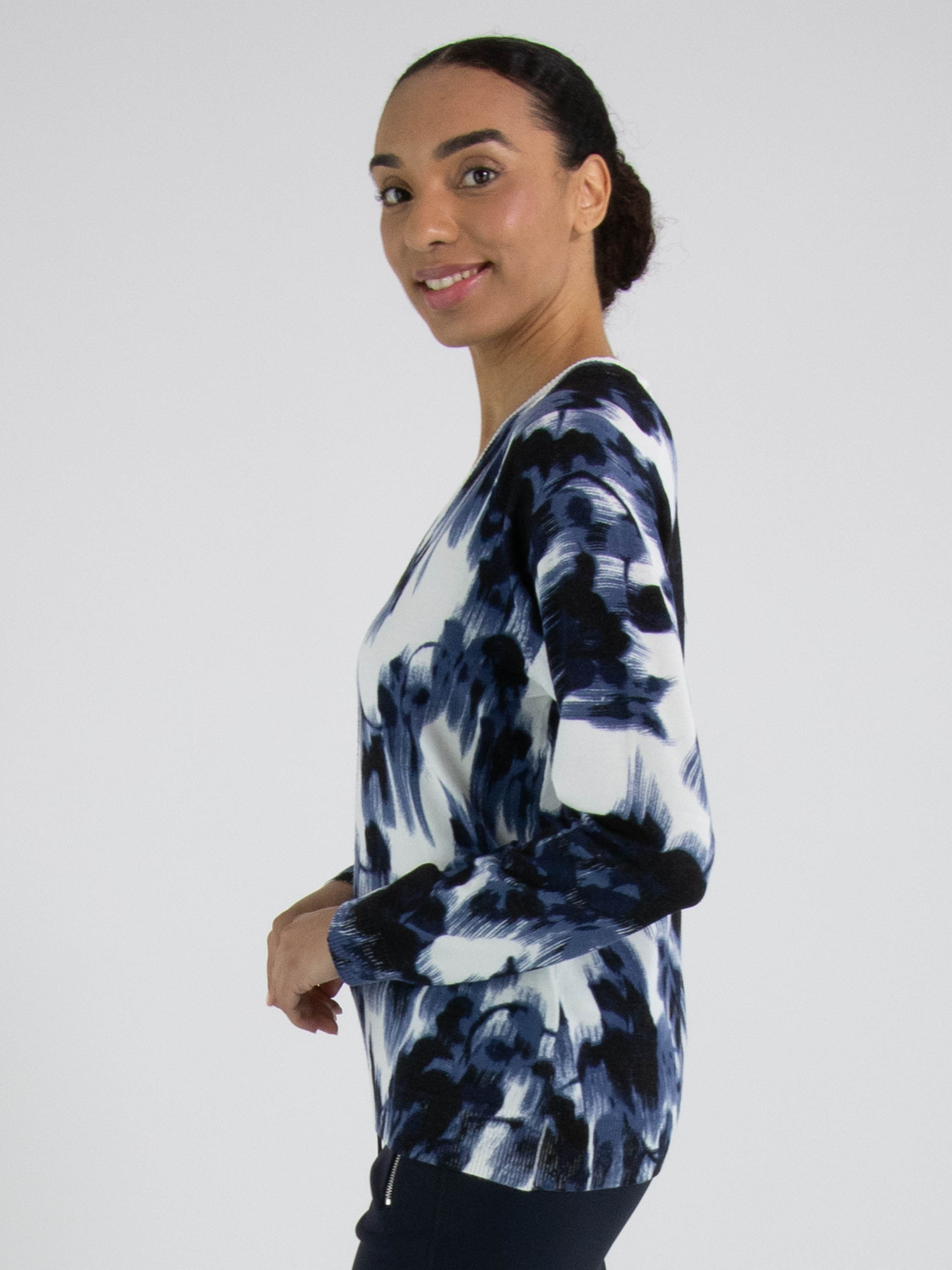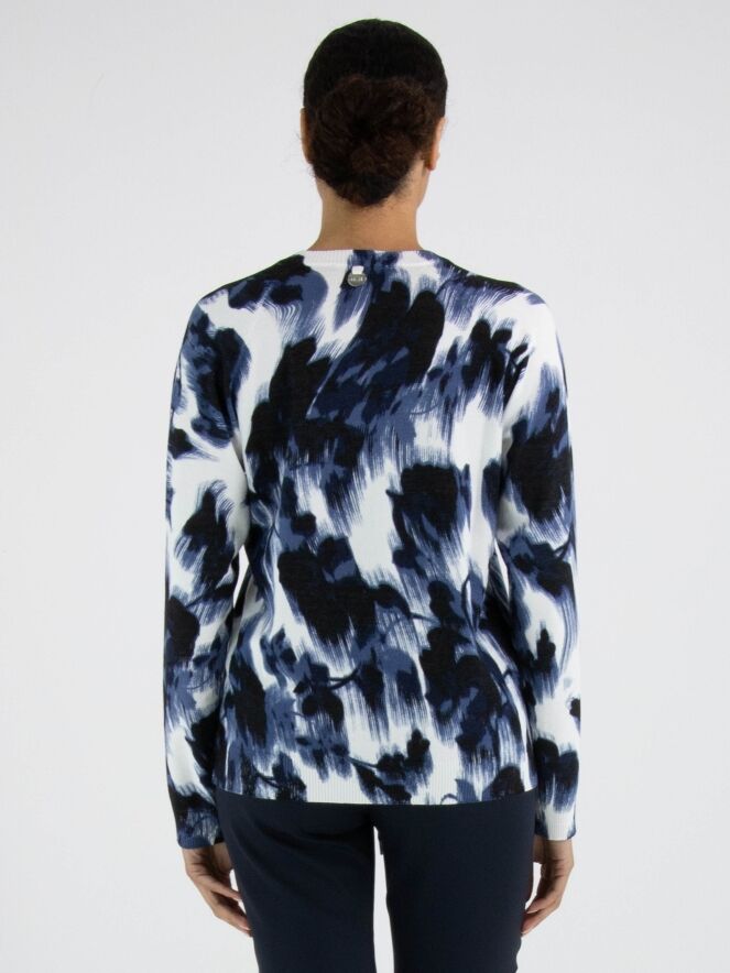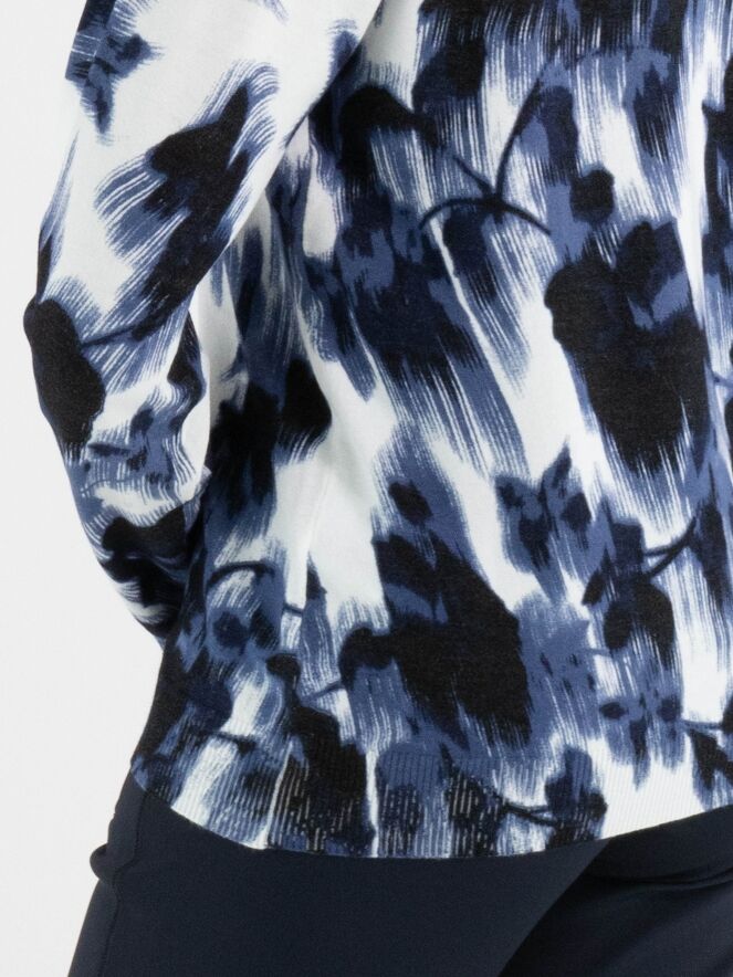 Een pullover van High Tech in een grafische print met meerdere tinten blauw. Langs de rand van de V-hals, de uiteinden van de lange mouwen en de onderkant is een fijn geribbelde tricot boord. Deze pullover mag niet worden gewassen.