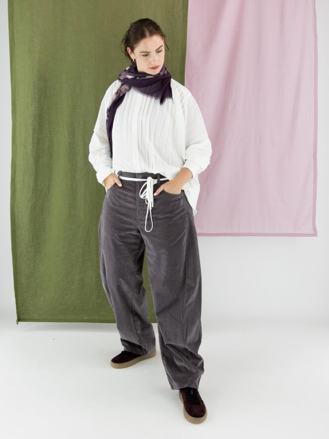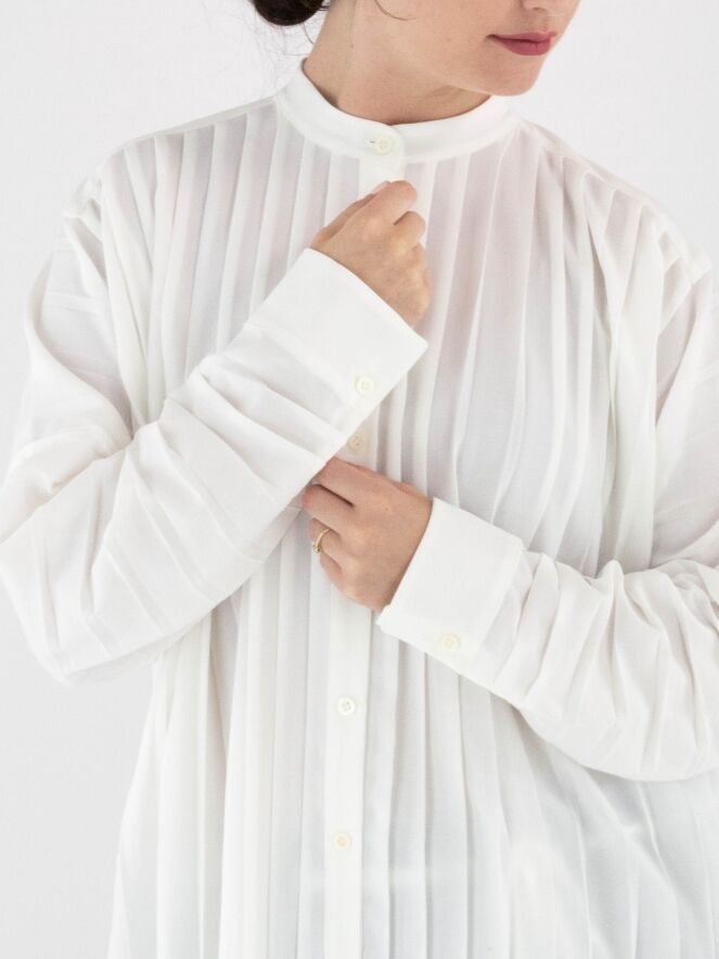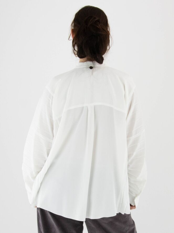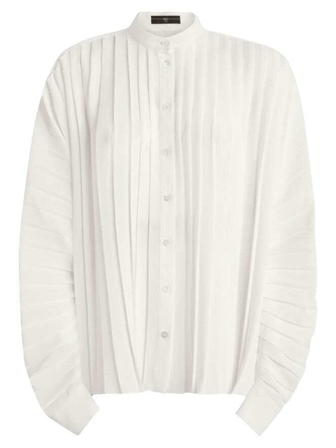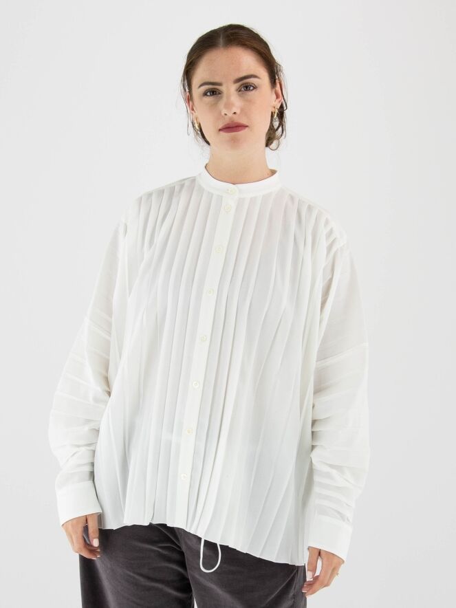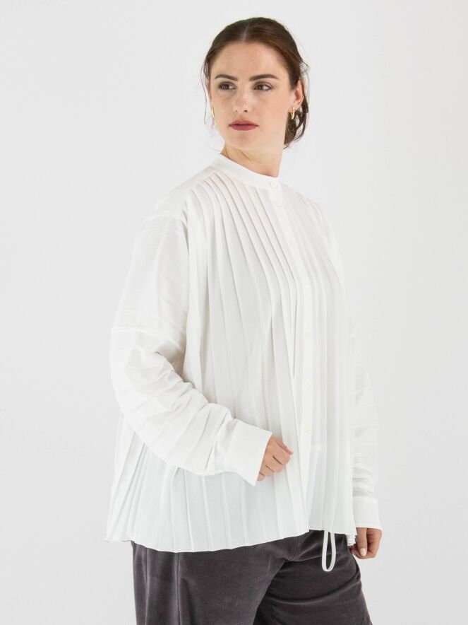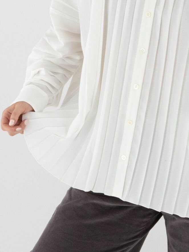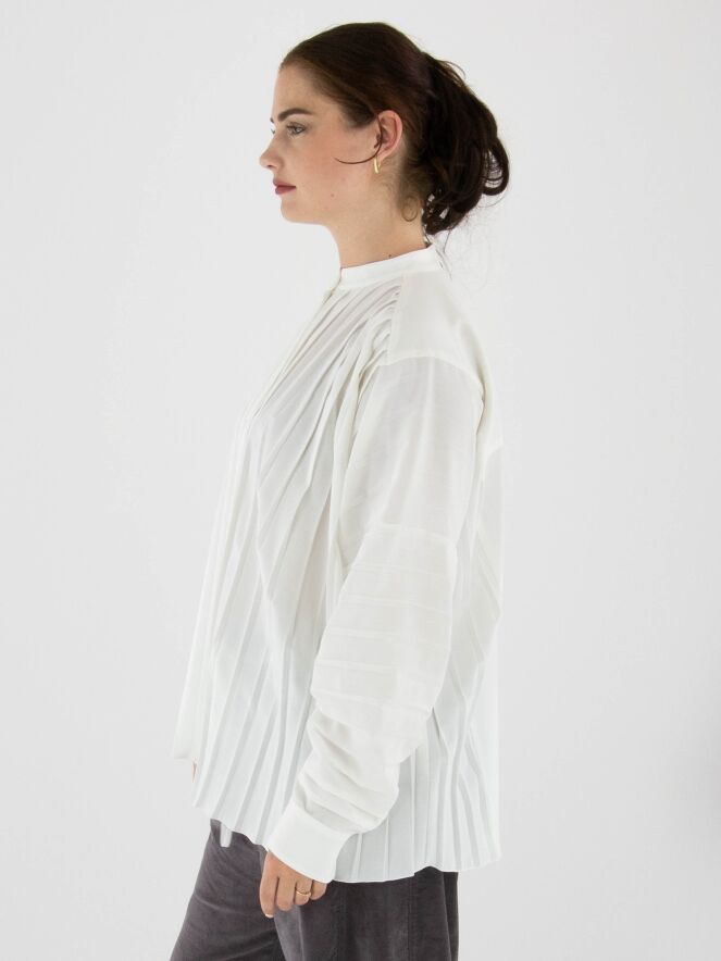 Een blouse van High in de kleur roomwit. De voorzijde van de blouse is uitgevoerd in een plisséstructuur. Langs de stiknaad aan de onderkant van de lange mouwen is de stof geplooid in een plissé-effect richting de mouwen. Deze blouse mag met de hand worden gewassen.