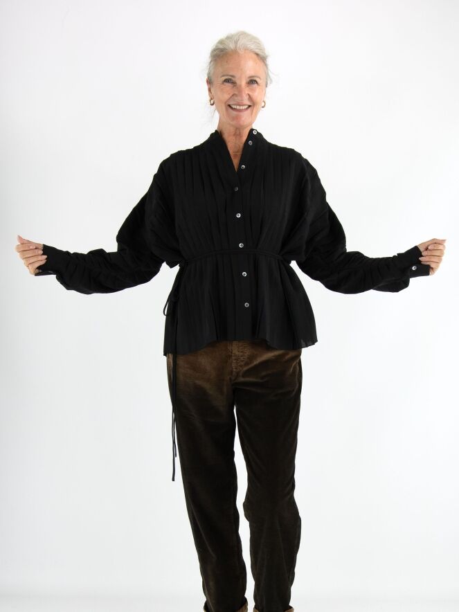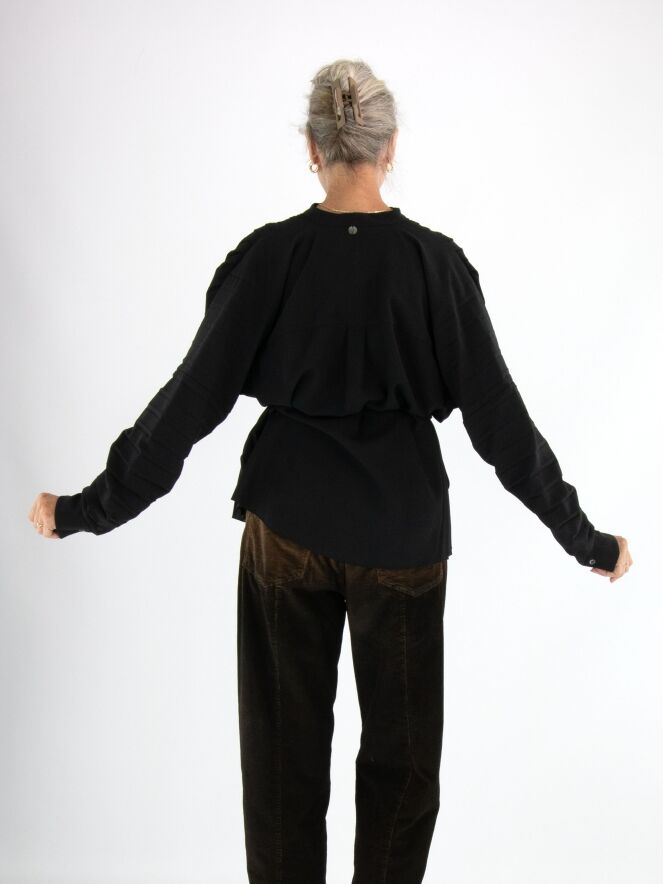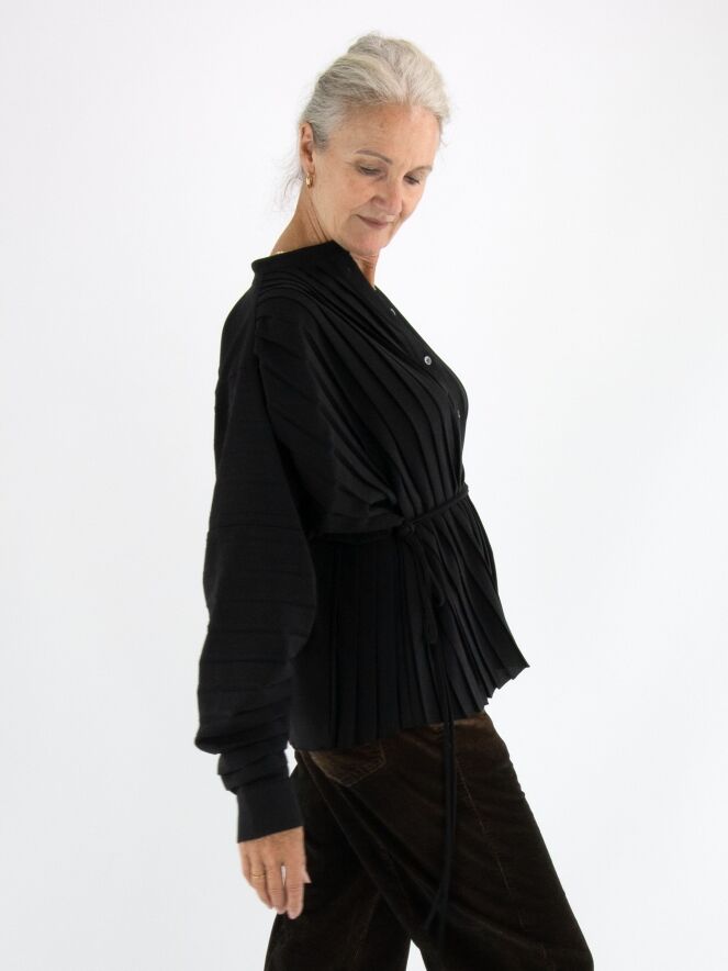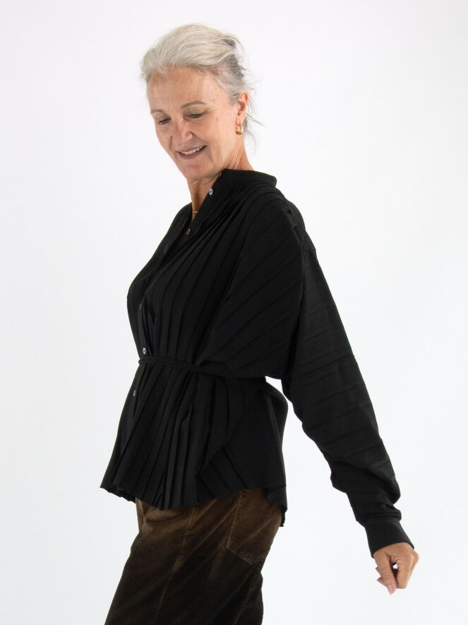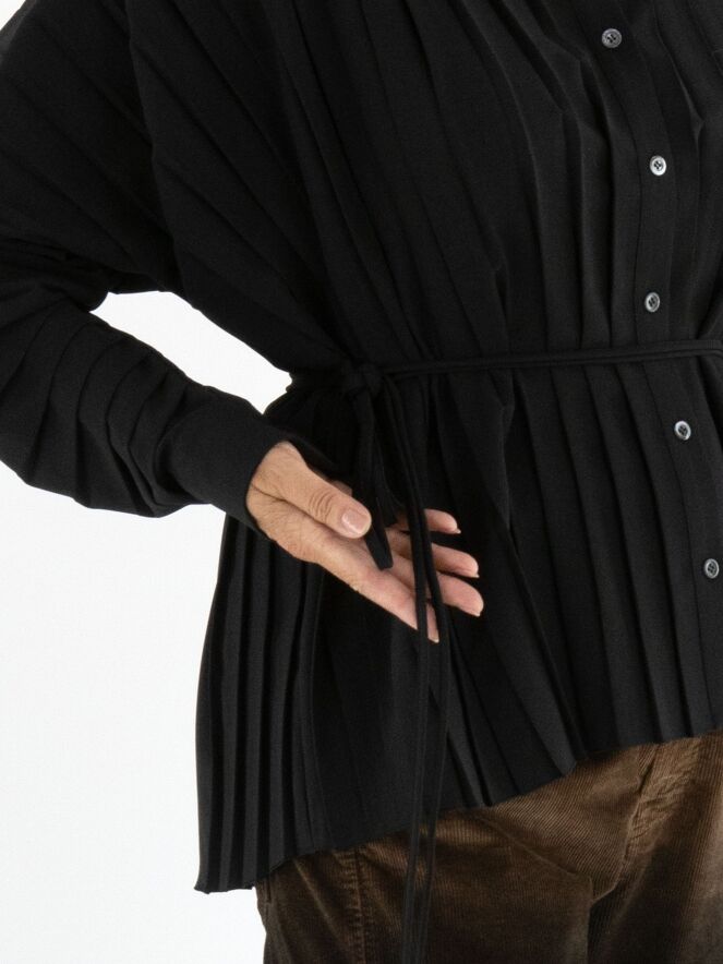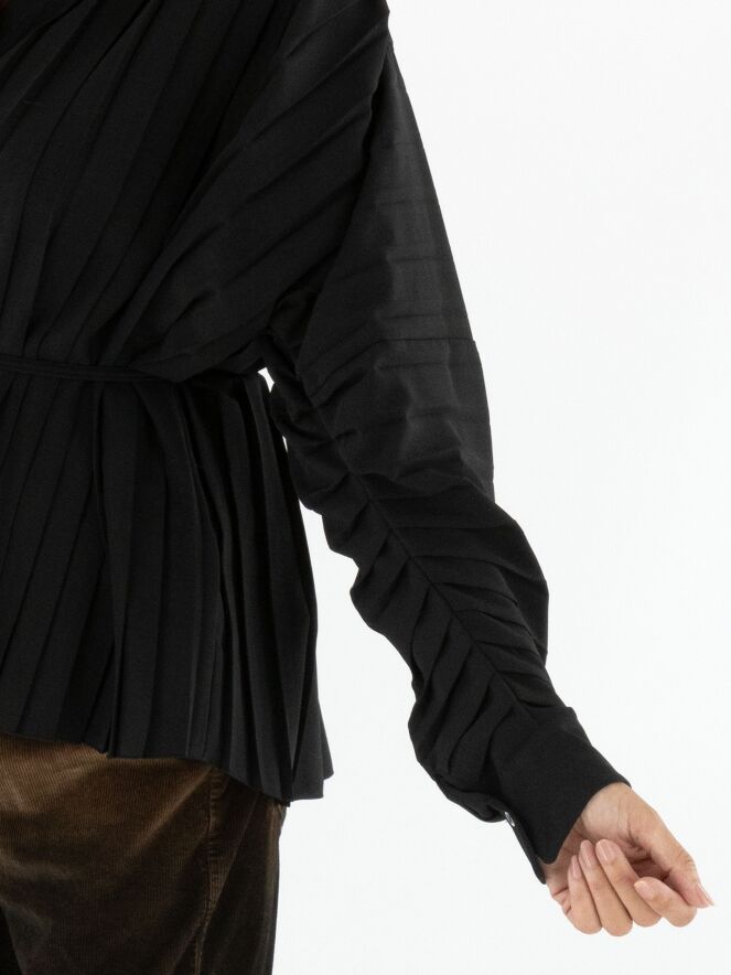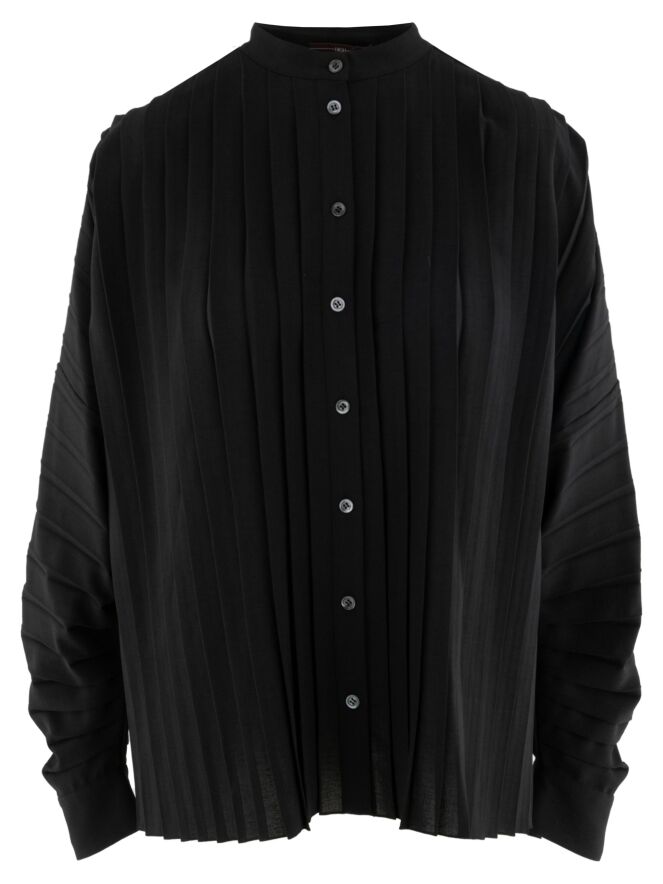 Een blouse van High in de kleur zwart. De voorzijde van de blouse is uitgevoerd in een plisséstructuur. Langs de stiknaad aan de onderkant van de lange mouwen is de stof geplooid in een plissé-effect richting de mouwen. Deze blouse mag met de hand worden gewassen.
