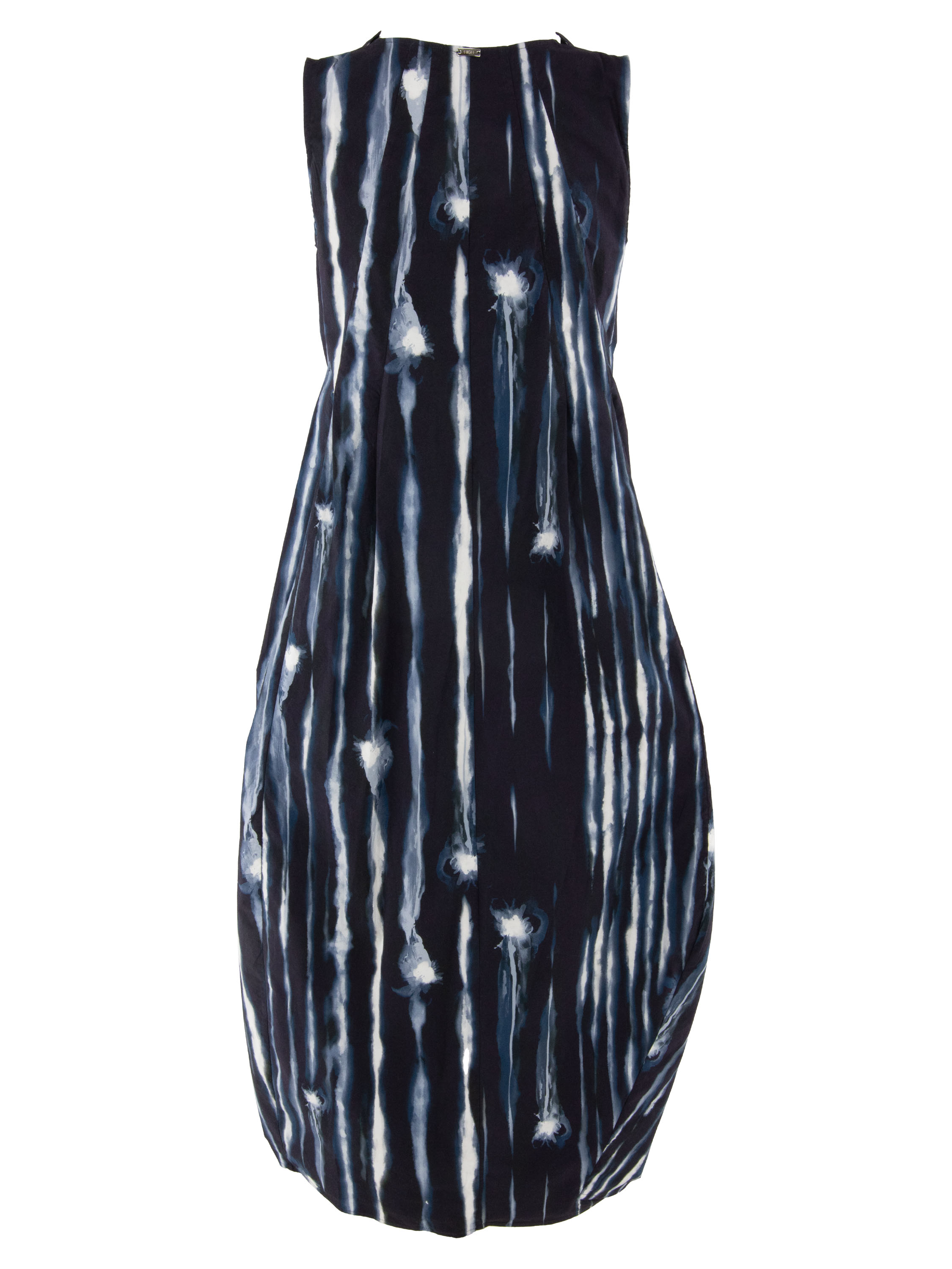 Jurk van High in een grafische paintprint met verticale roomwitte lijnen op een achtergrond van meerdere tinten marineblauw. Ter hoogte van de taille is een ceintuur in dezelfde stof als de jurk verwerkt, die aan de achterzijde via de binnenzijde doorloopt. Vanaf de taille ontwikkelt de jurk een lichte ballonvorm, wat zorgt voor een eigentijds en vrouwelijk silhouet. Ter hoogte van de taille zijn steekzakken aangebracht. Deze jurk kan op 30 graden worden gewassen.