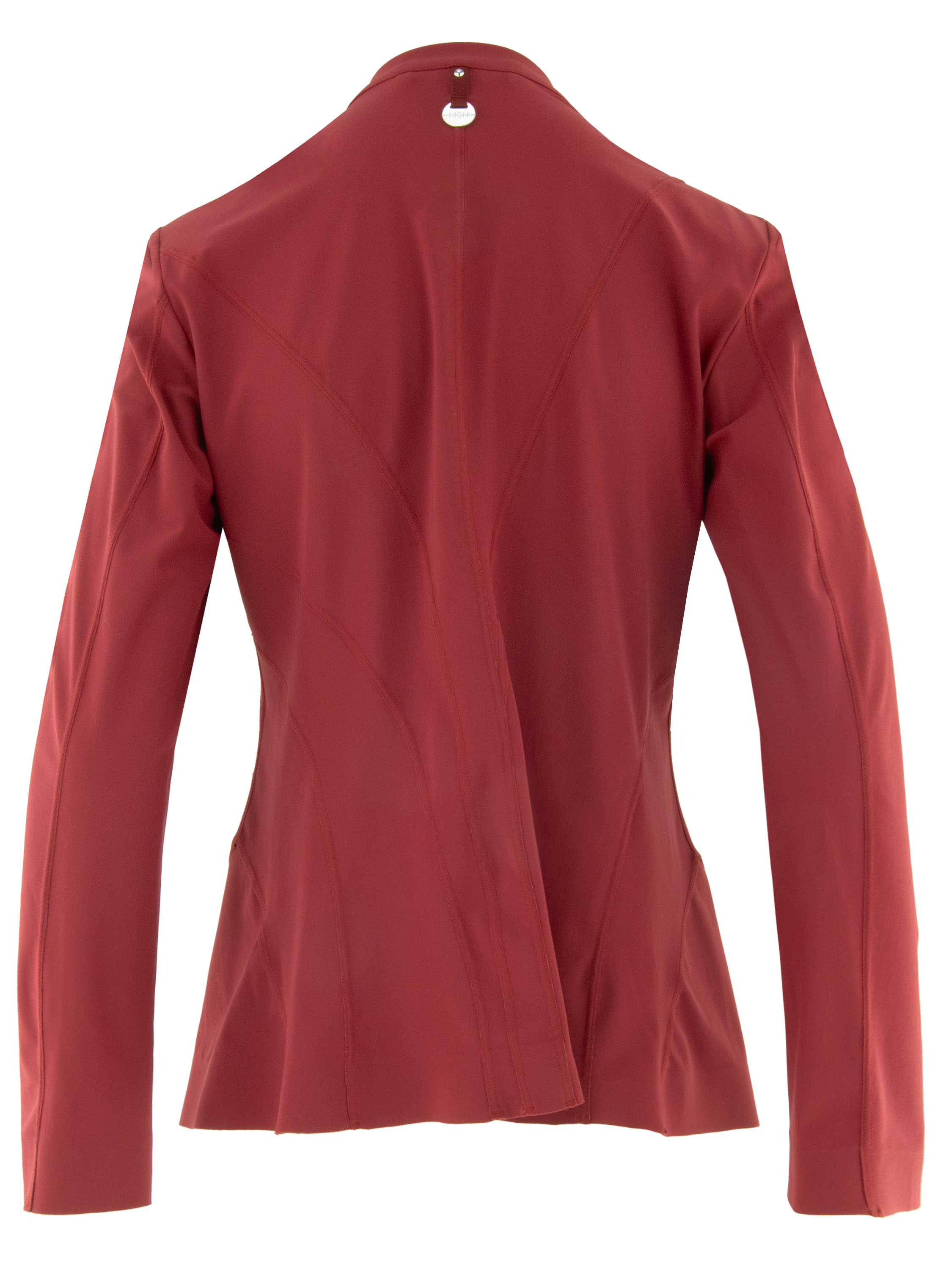 Blazer van High in een volle framboosrode tint. De blazer heeft een druppelvormige V-hals en een sluiting met drie drukknopen. De stiknaden lopen diagonaal en geven het model een mooi getailleerde uitstraling. De blazer is ongevoerd, wat zorgt voor een lichte en soepele valling. Deze blazer kan met de hand worden gewassen.