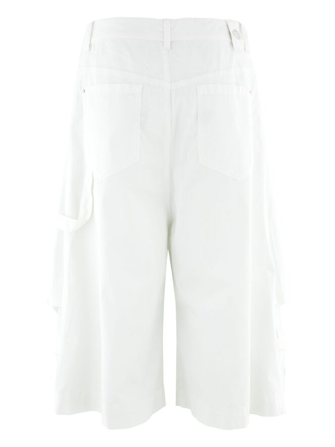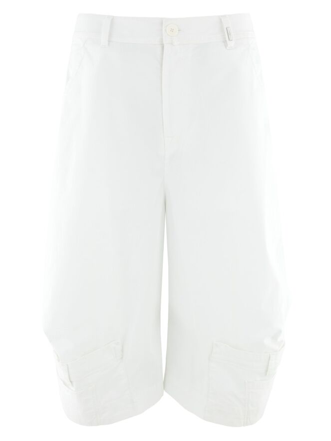 Capribroek van High in de kleur wit. Aan de onderzijde van de pijpen is een speels designdetail verwerkt dat de indruk wekt van een omgekeerde broek met zakken. Dit geeft het model een verrassend en eigentijds karakter. Deze broek kan op 30 graden worden gewassen.