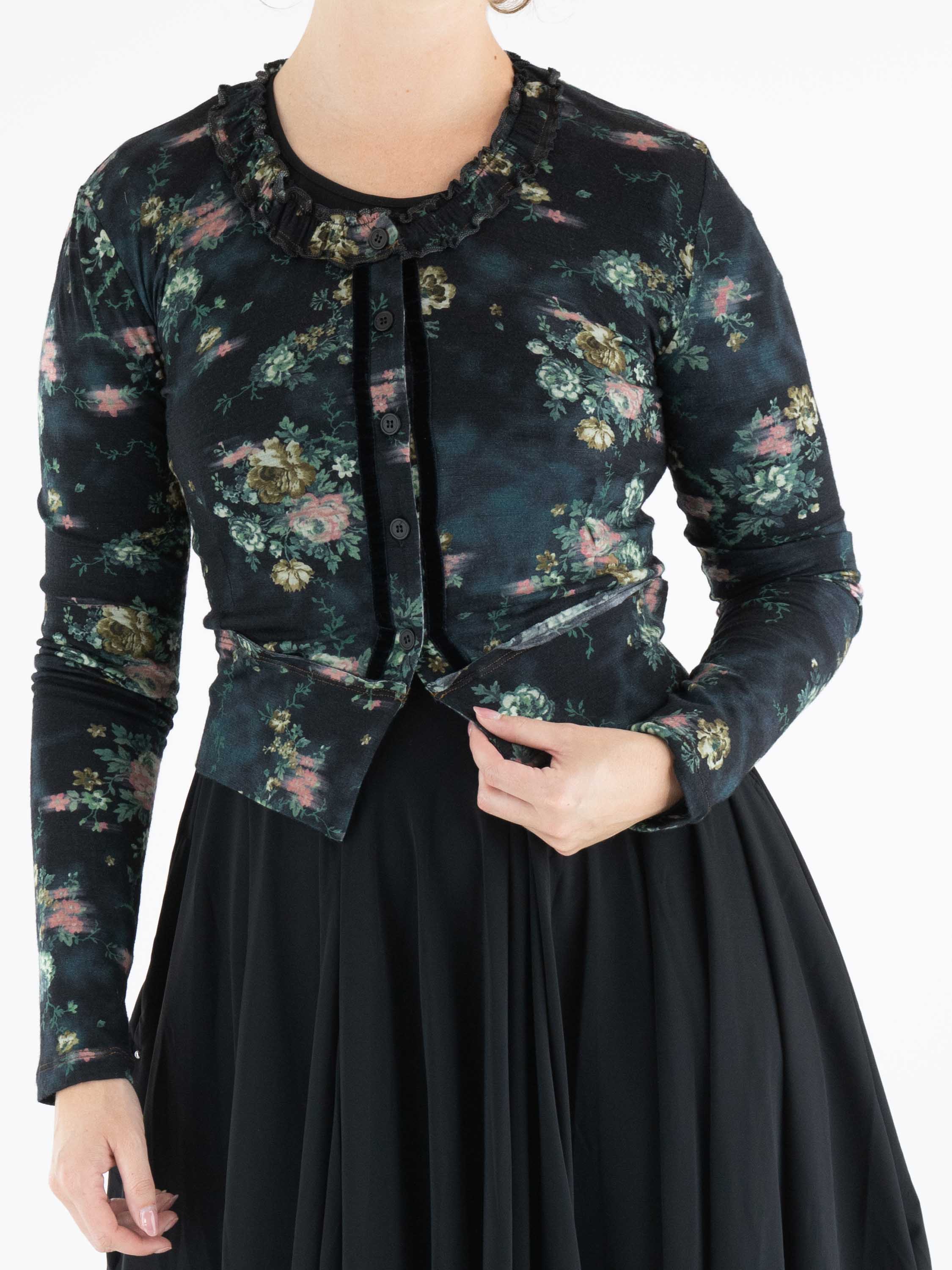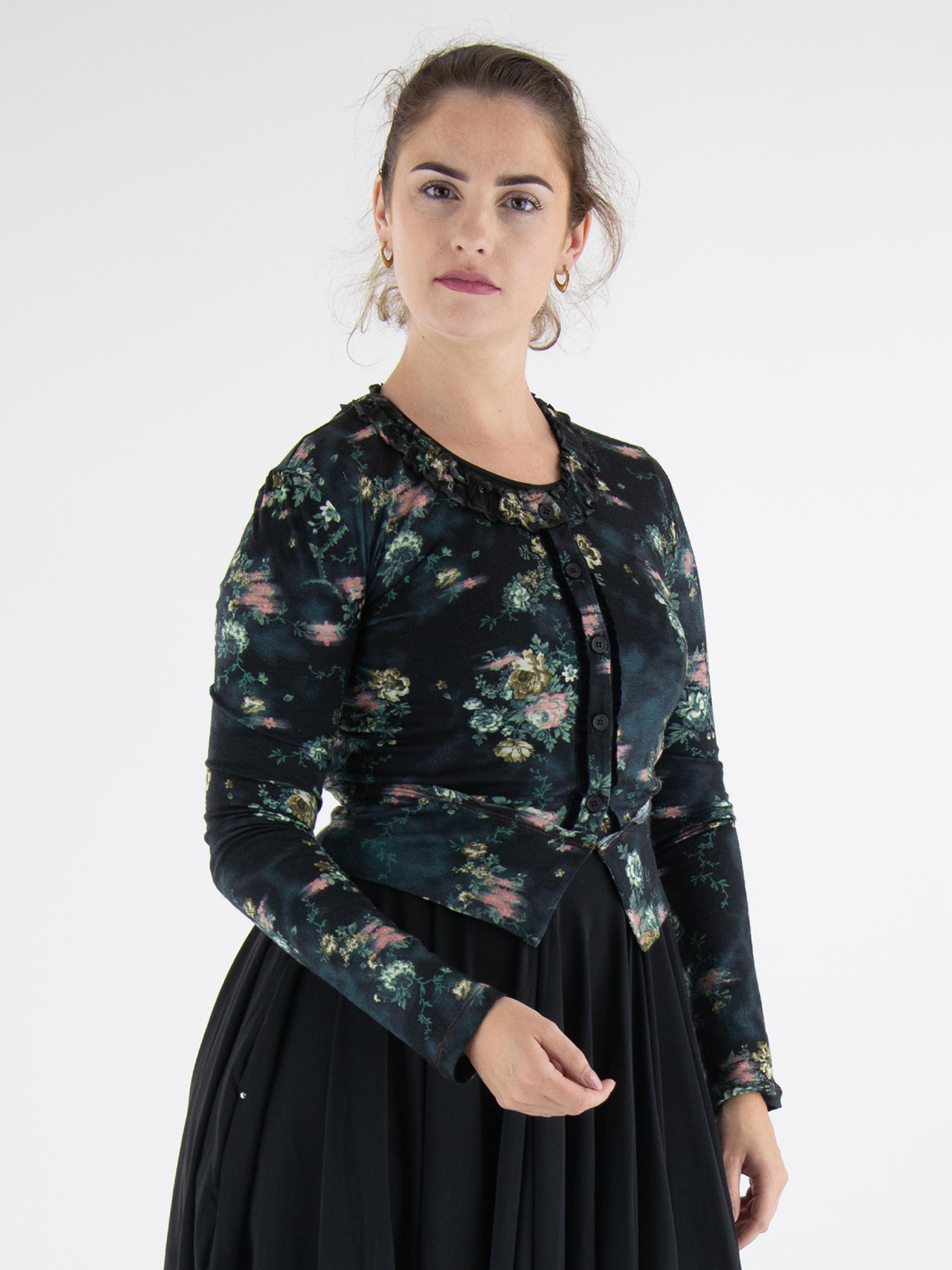 Een kort vest van High in een bloemetjesprint met meerdere tinten groen taupe en rood op een marineblauwe achtergrond. Langs de ronde hals is een bies waarvan de stof langs beide randen fijn geplooid is. Langs de knoops sluiting is aan beide kanten een fluwelen bies. Dit vest mag op de hand worden gewassen.