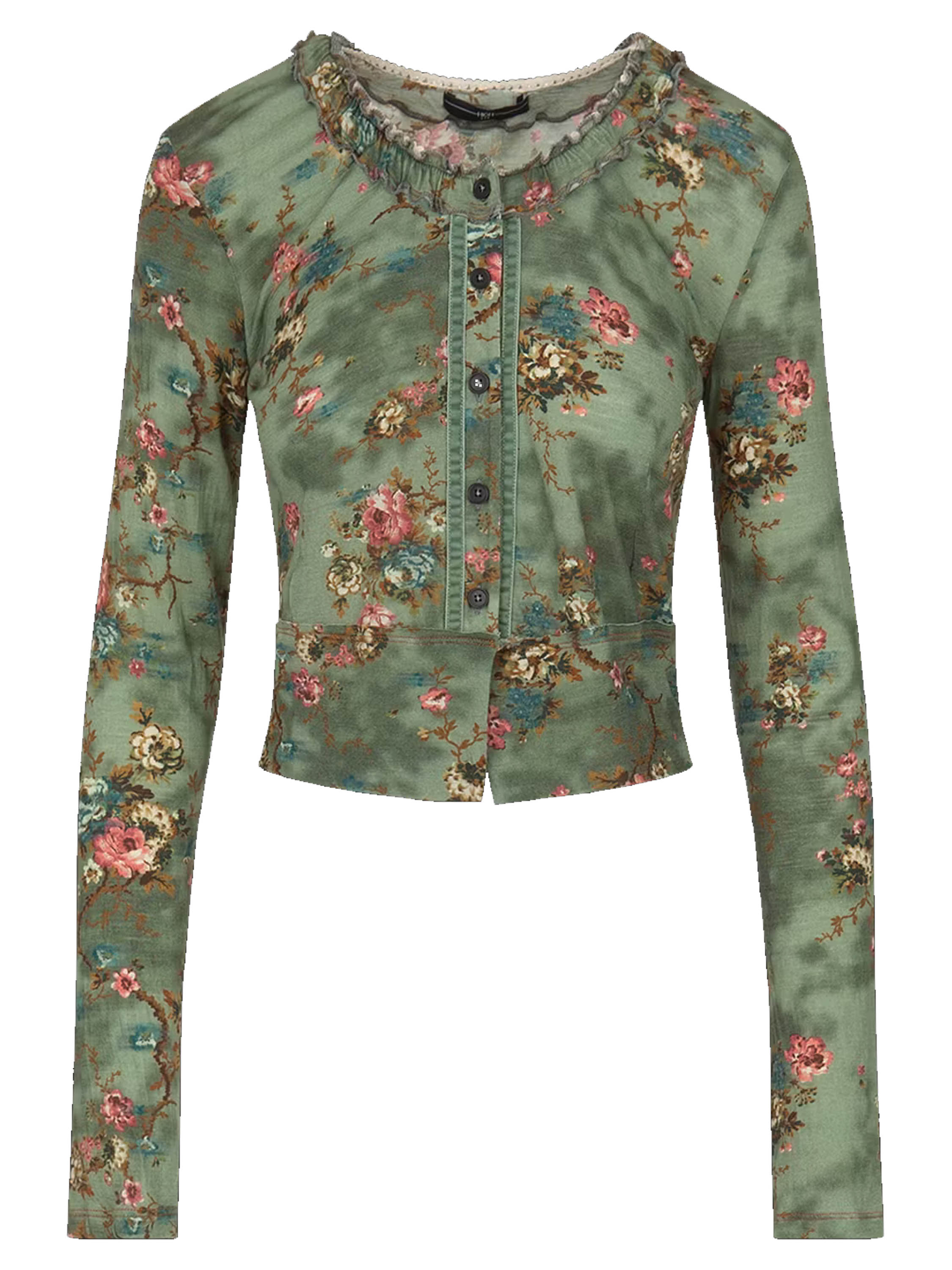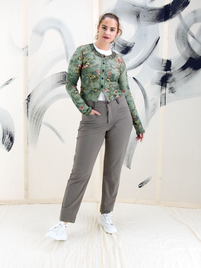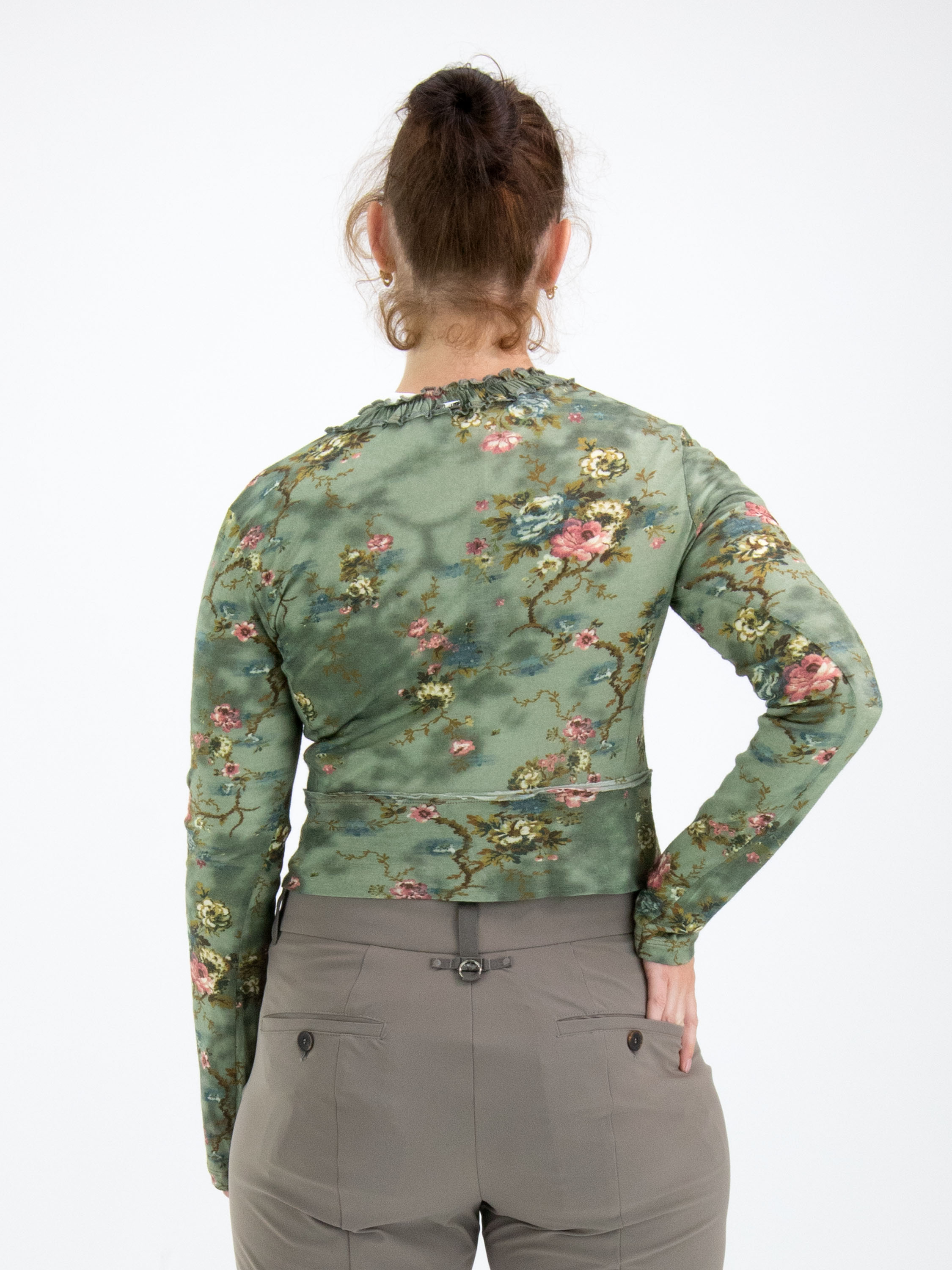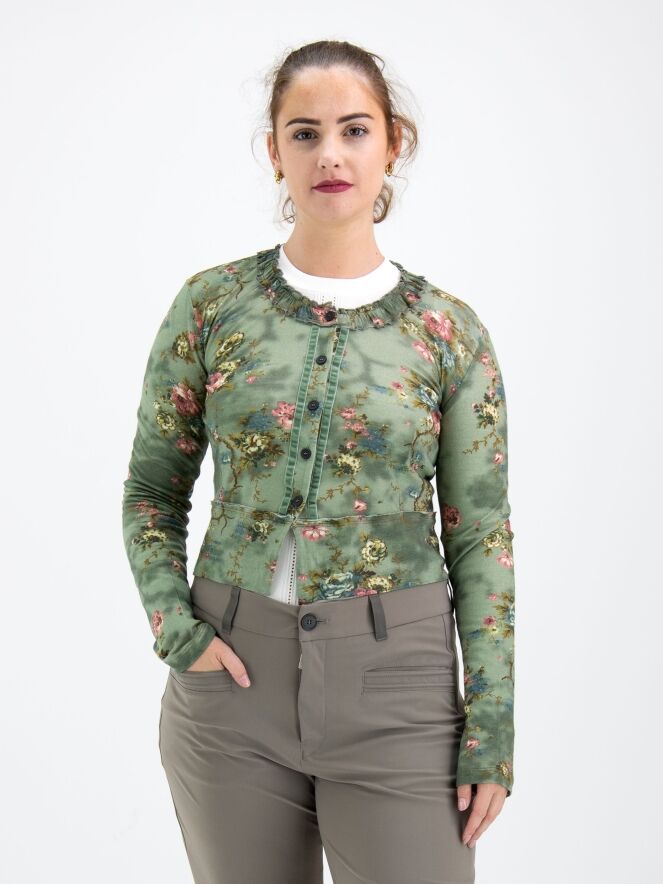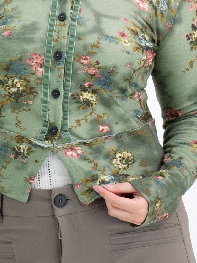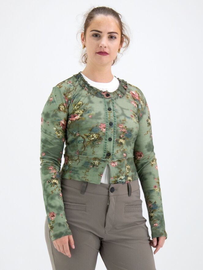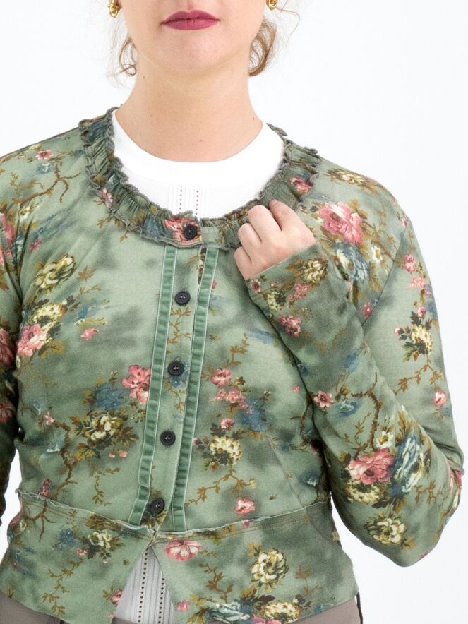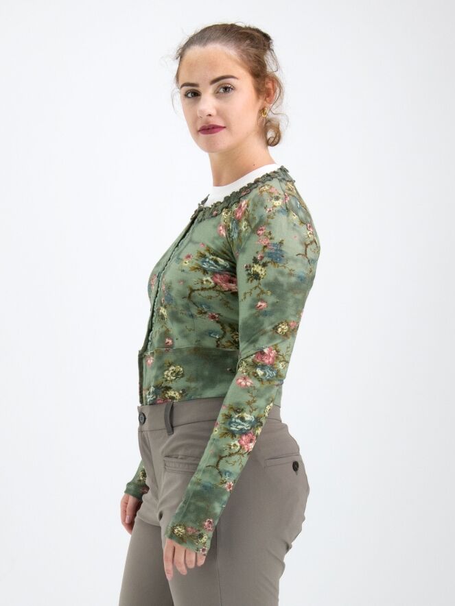 Een kort vest van High in een bloemetjesprint met meerdere tinten blauw, taupe en rood op een olijfgroene achtergrond. Langs de ronde hals is een bies waarvan de stof langs beide randen fijn geplooid is. Langs de knoops sluiting is aan beide kanten een fluwelen bies. Dit vest mag op de hand worden gewassen.