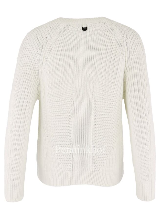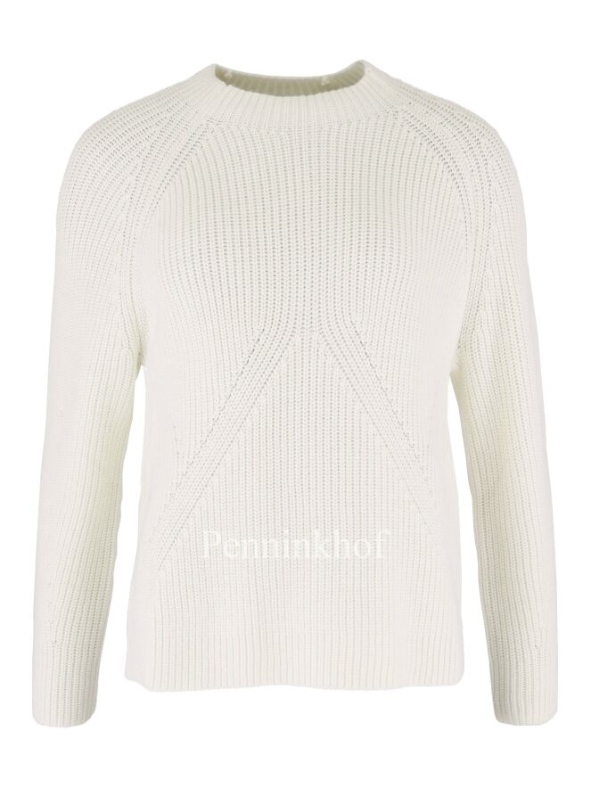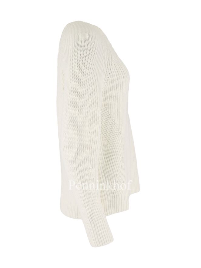 Een pullover van High in de kleur roomwit. Het vest heeft een ronde hals. Aan de voorzijde zijn enkele diagonale lijnen in het breipatroon. Deze pullover mag op de hand worden gewassen.