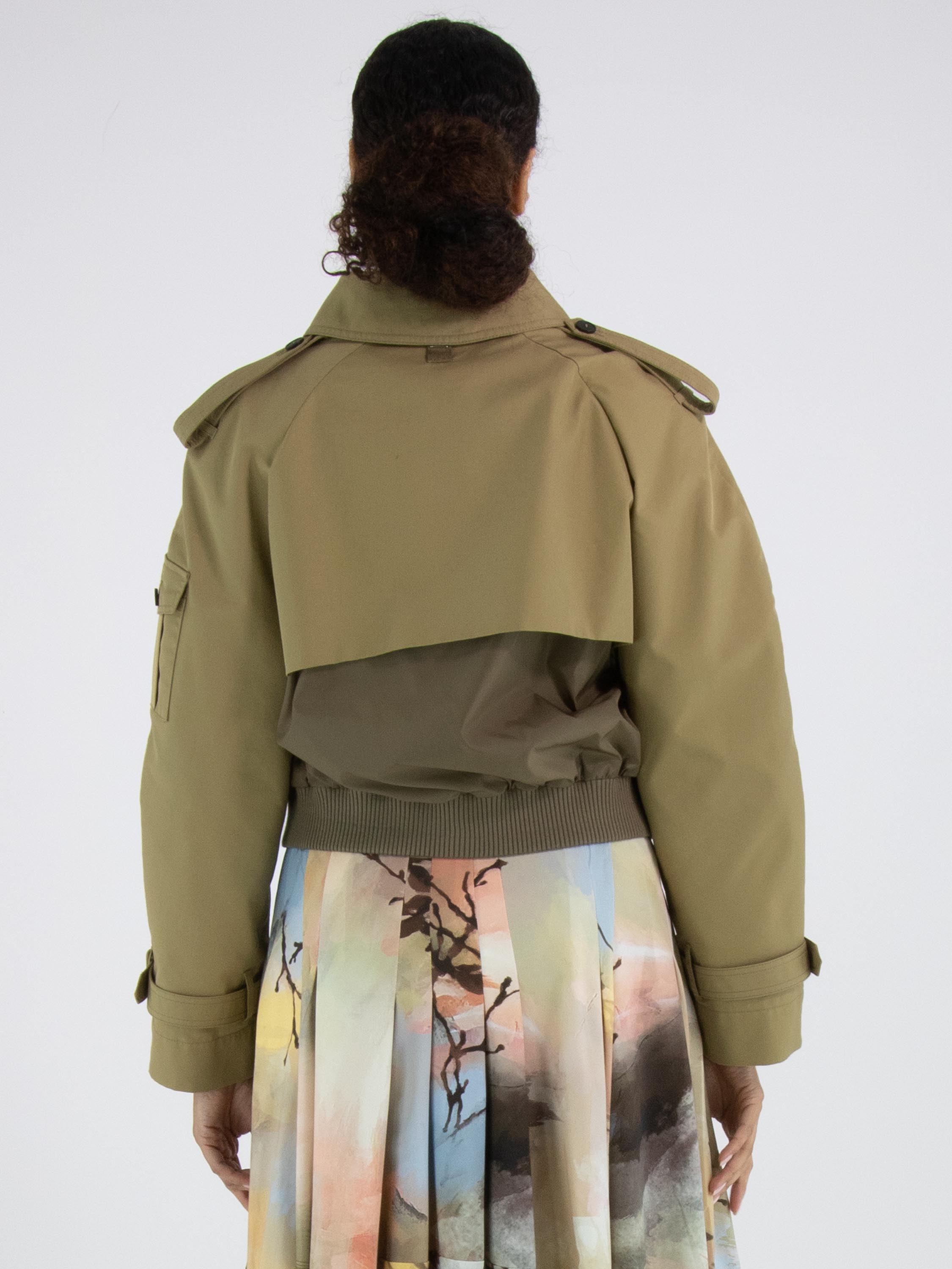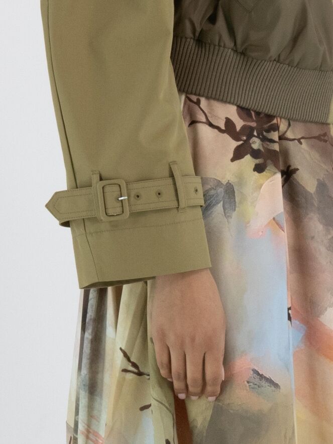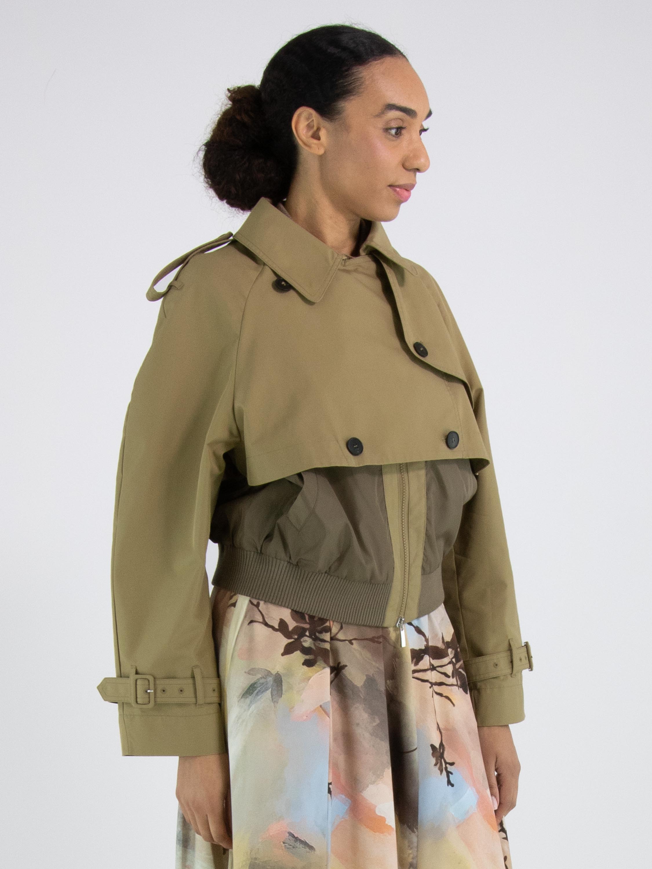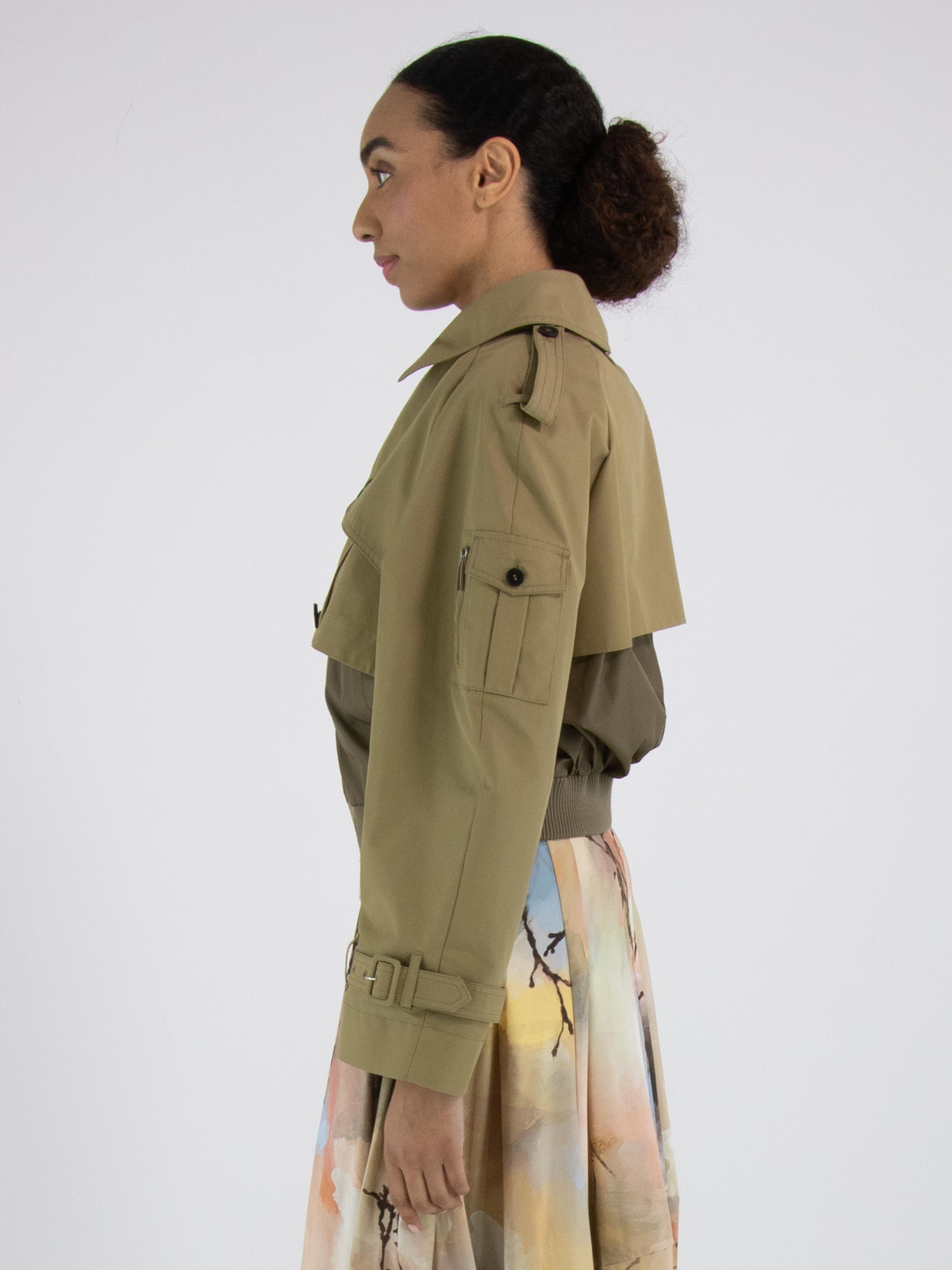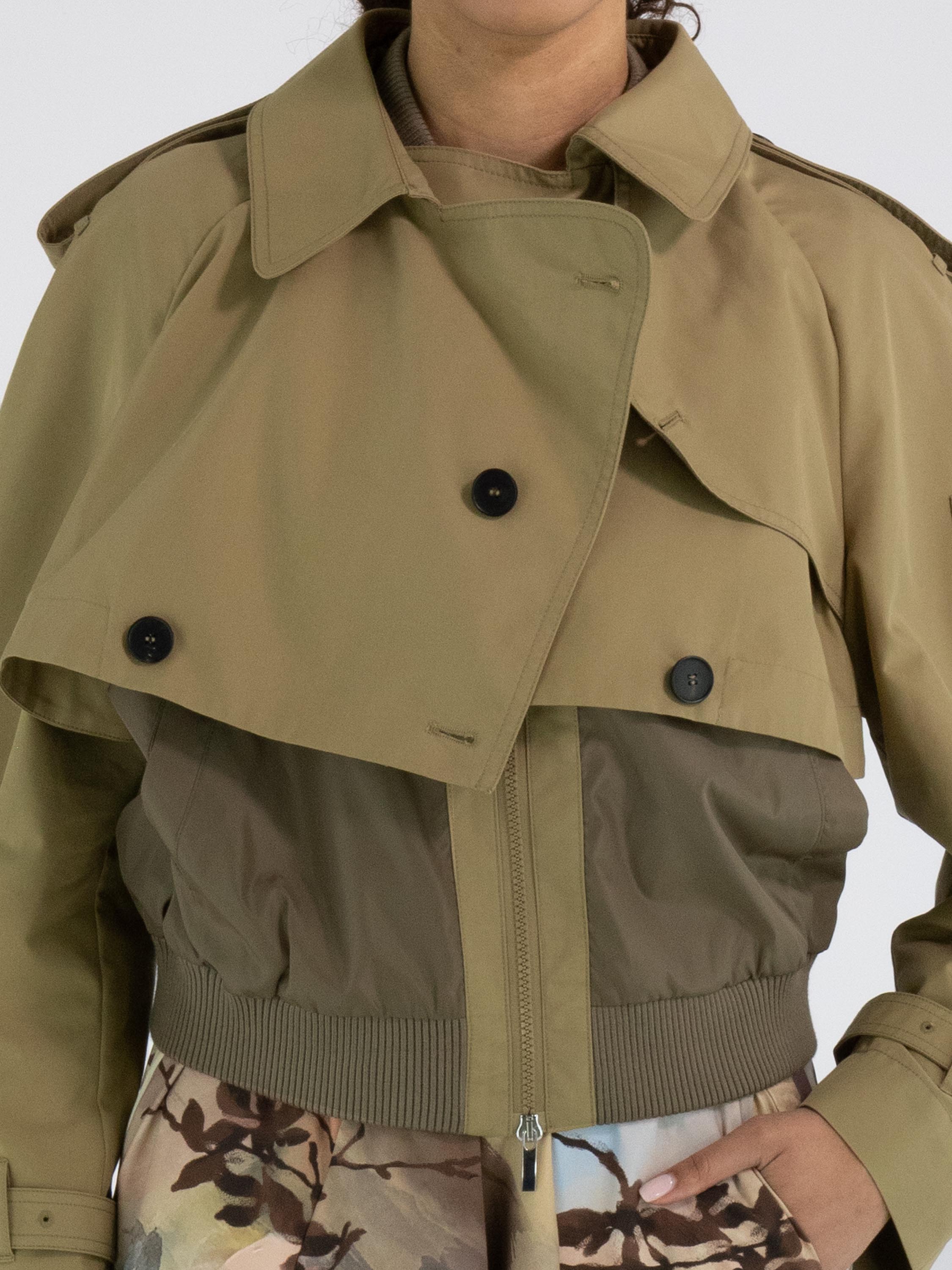 Een korte coat met een gabardine look van High in een volle zandkleur. In de rand van de hals en aan de onderkant zit een fijn geribbelde tricot boord. De coat heeft steekzakken en onder de gabardine look bevindt zich een ritssluiting. Op de schouders zijn epauletten. Deze coat mag niet worden gewassen.