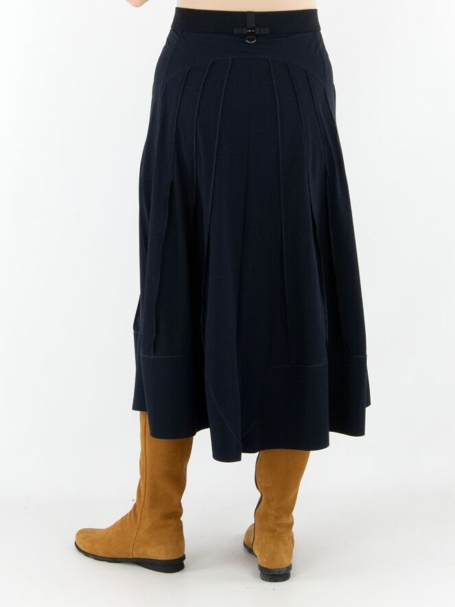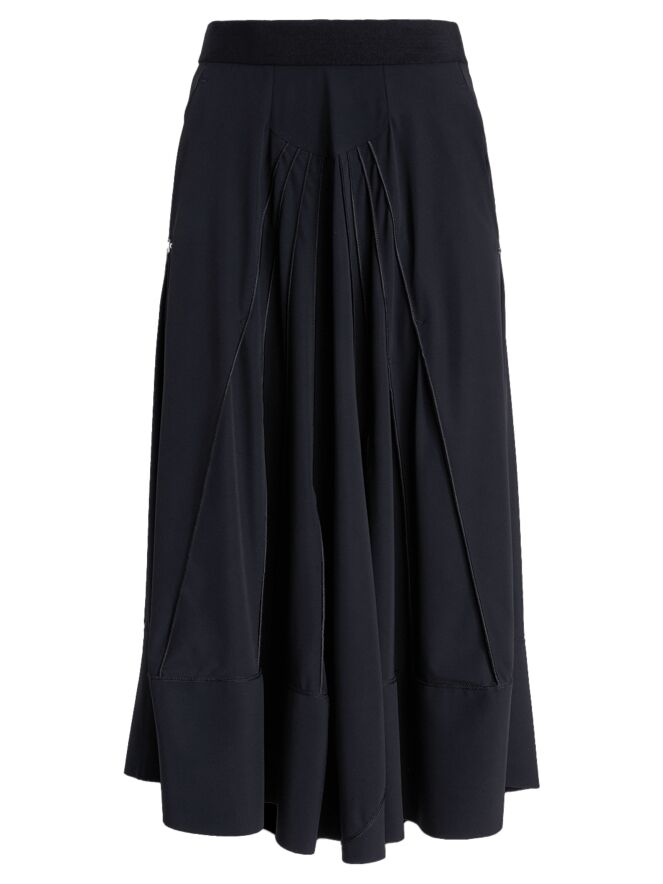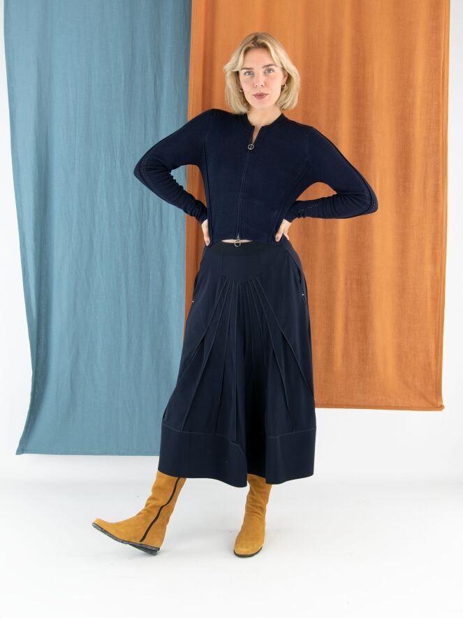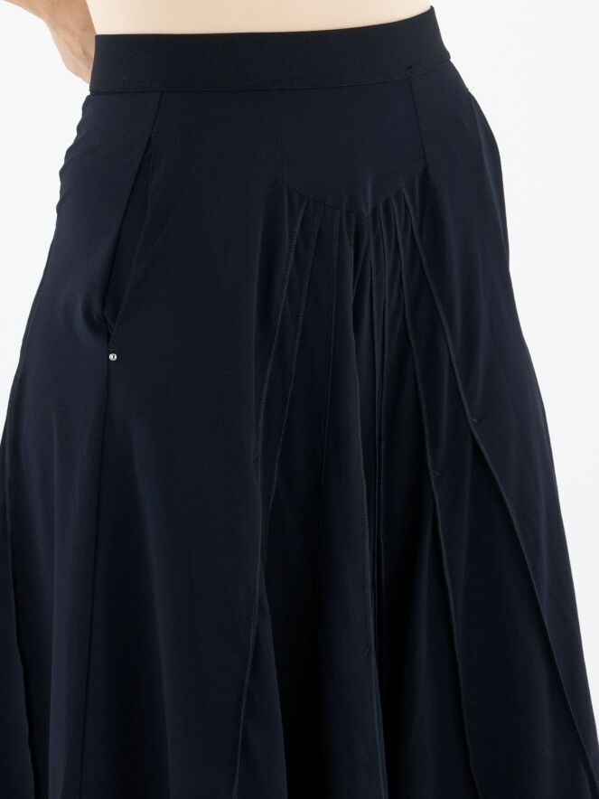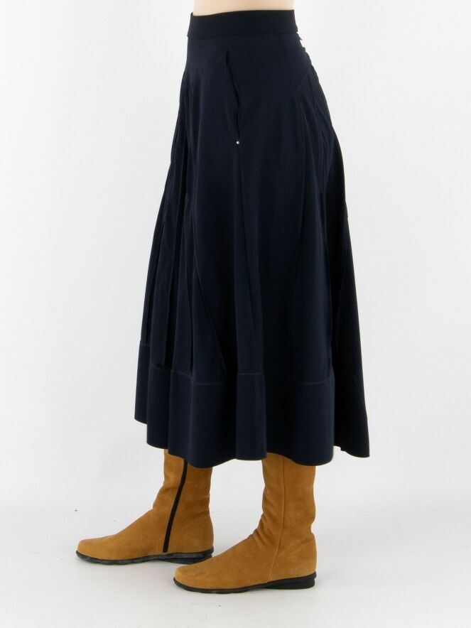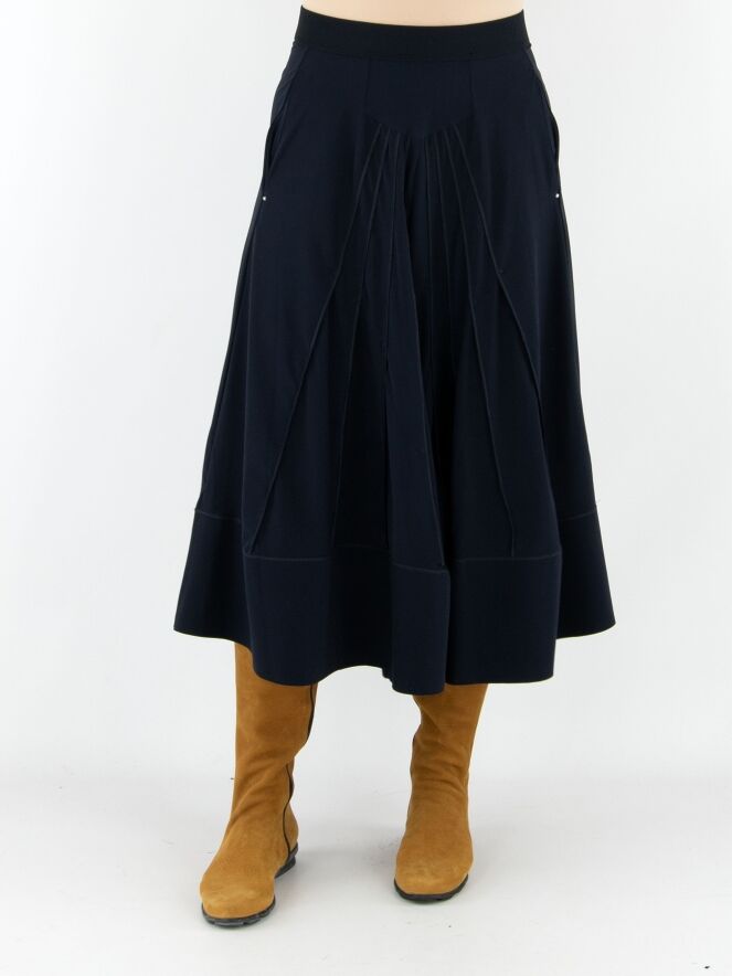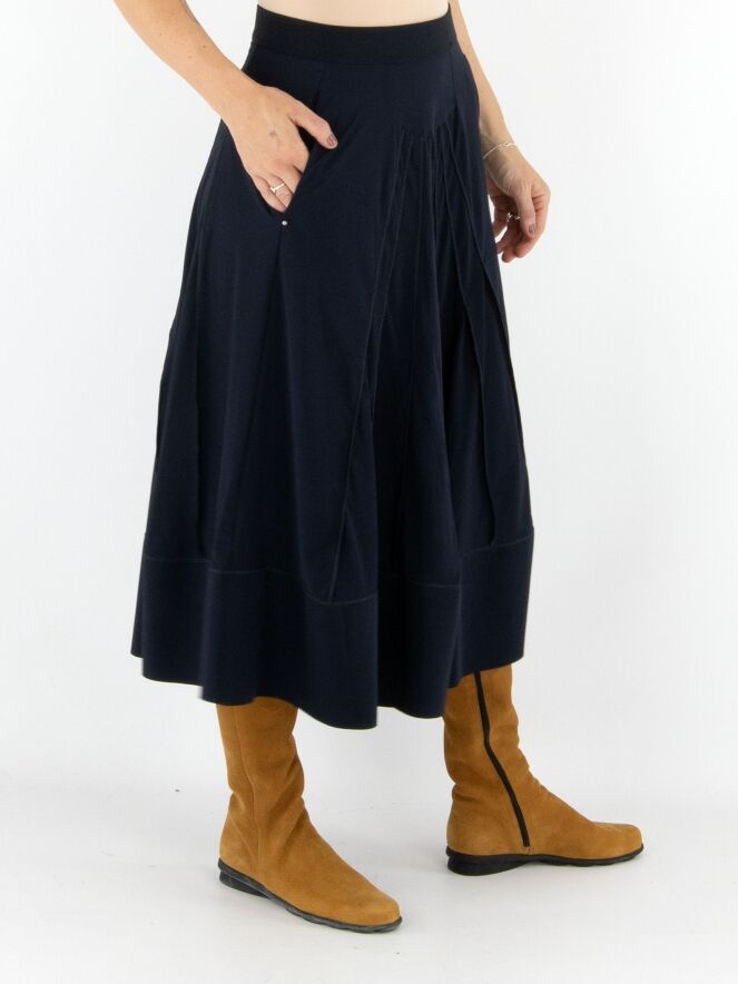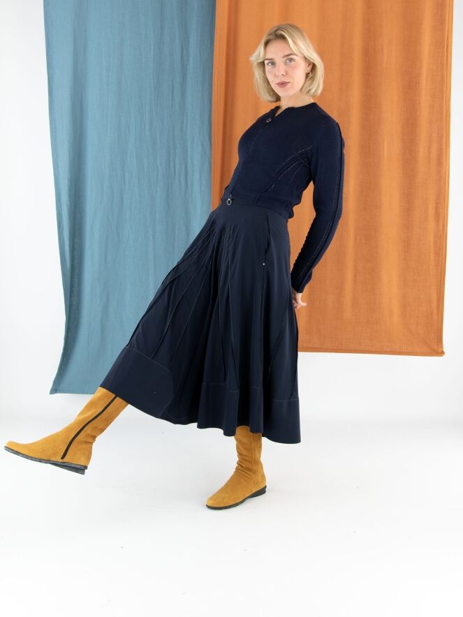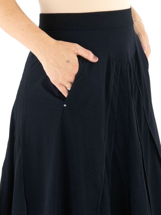 Een wijde lange rok van High in de kleur marineblauw. De taille is voorzien van een comfortabele elastische band. Onder de tailleband lopen aan de voor- en achterkant meerdere omgekeerde verticale stiknaden, die de rok een bijzondere structuur geven. Daarnaast is de rok uitgerust met praktische steekzakken. Dit model kan met de hand worden gewassen.