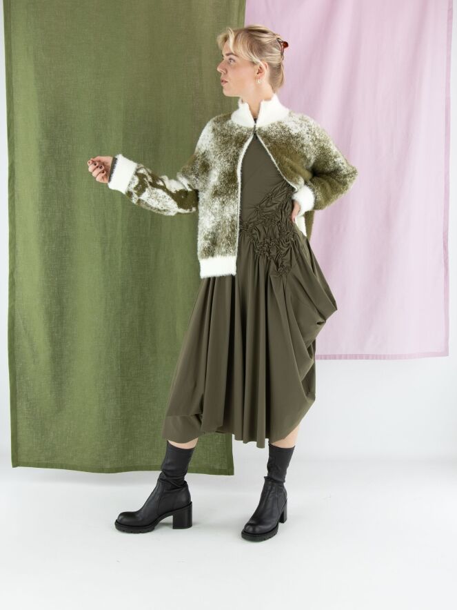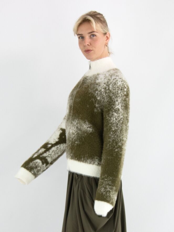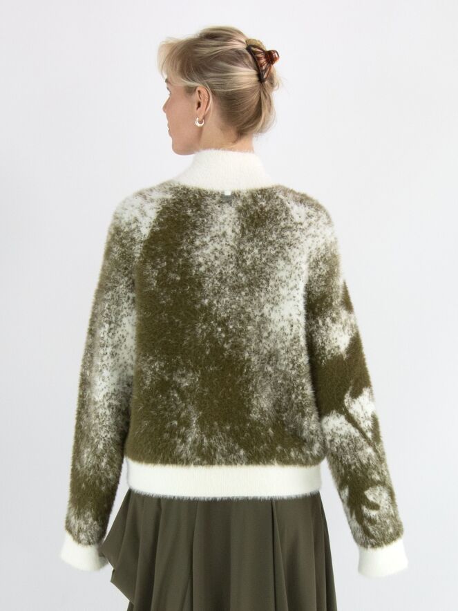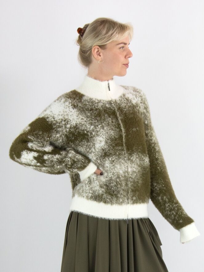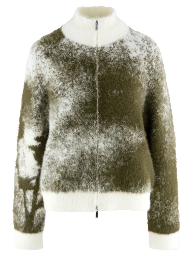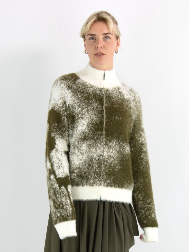 Een vest van High in een grafische print met de kleuren olijfgroen en roomwit. Het vest heeft een hooggesloten turtle hals en een ritssluiting. De stof is elastisch en mag met de hand worden gewassen.