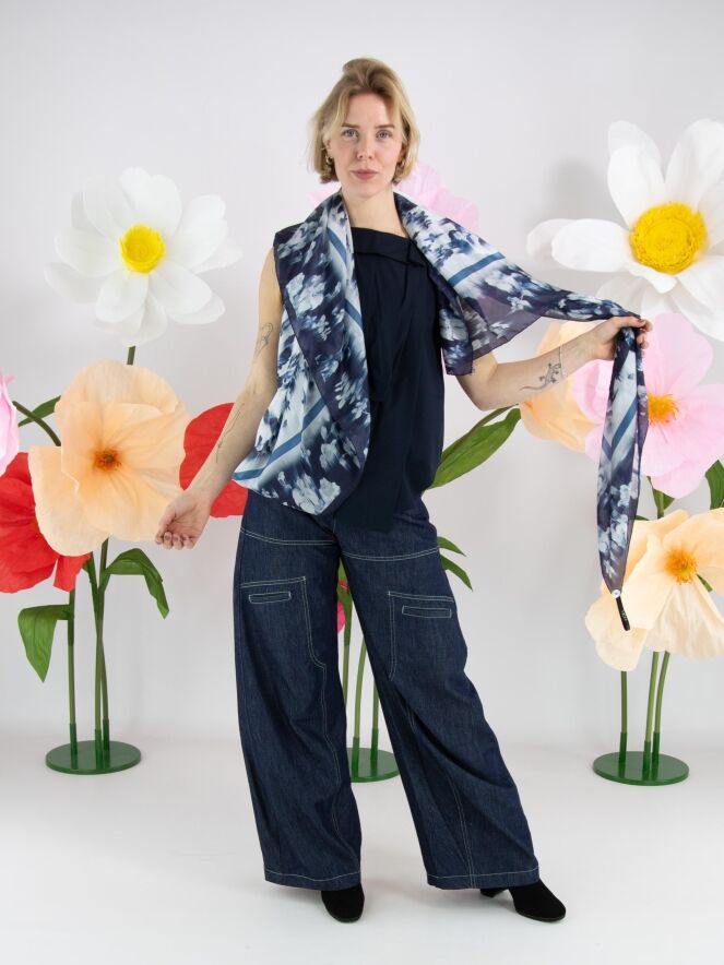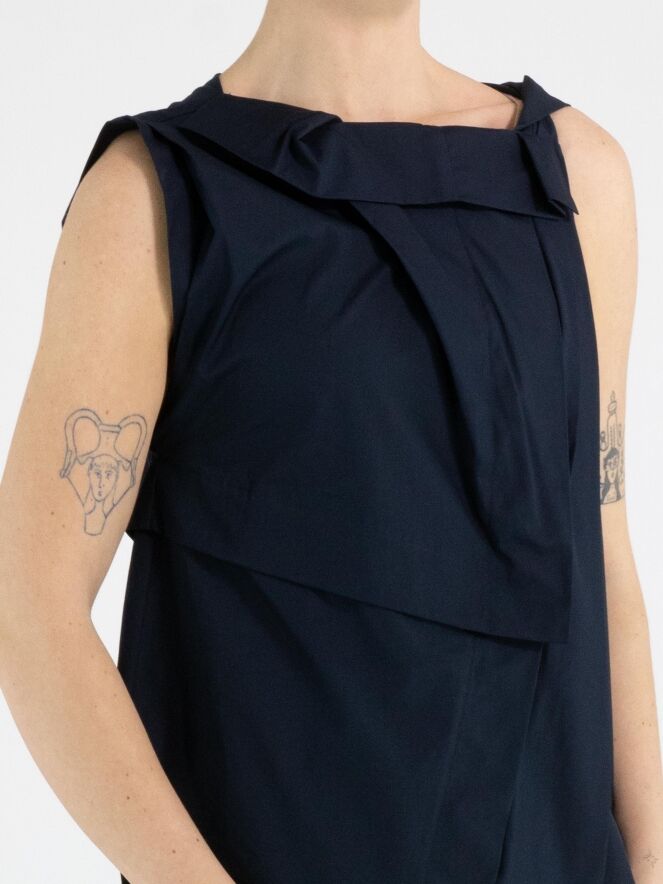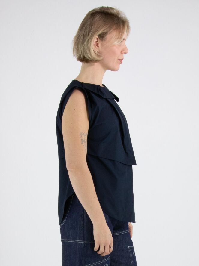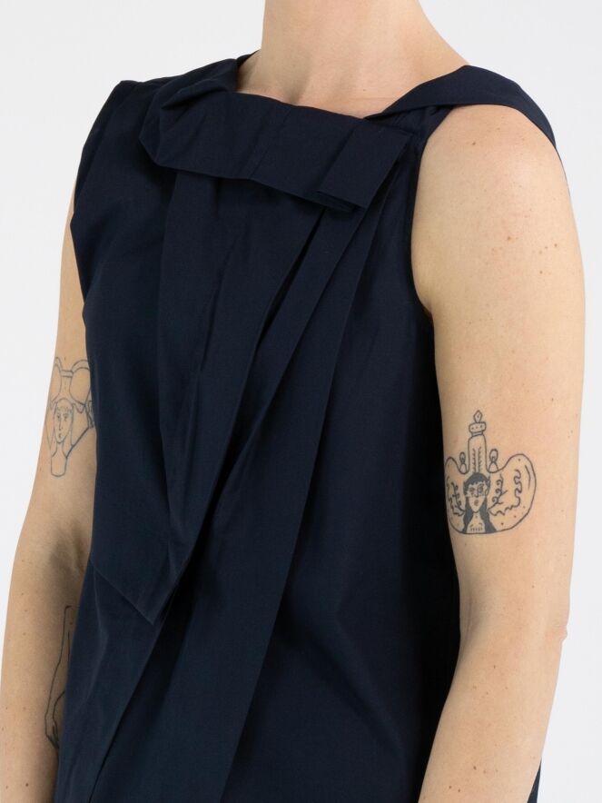 Een top van High in een marineblauwe kleur. De top heeft meerdere plisséplooien, onder andere bij de schouder en aan de voorzijde van de hals. Vanuit de linker schouder lopen enkele plooien diagonaal naar het midden van de onderkant. De top heeft een A-lijn en mag op de hand worden gewassen.
