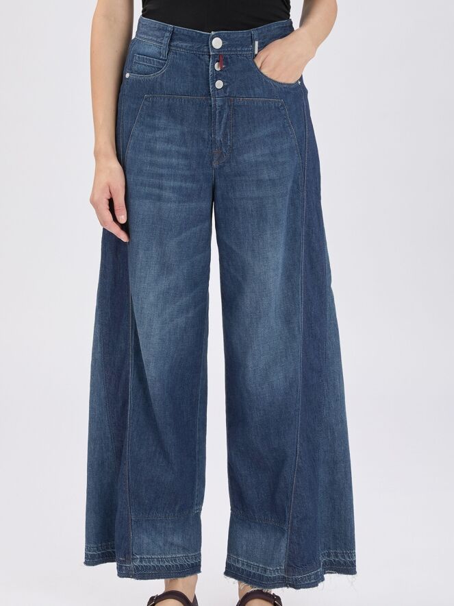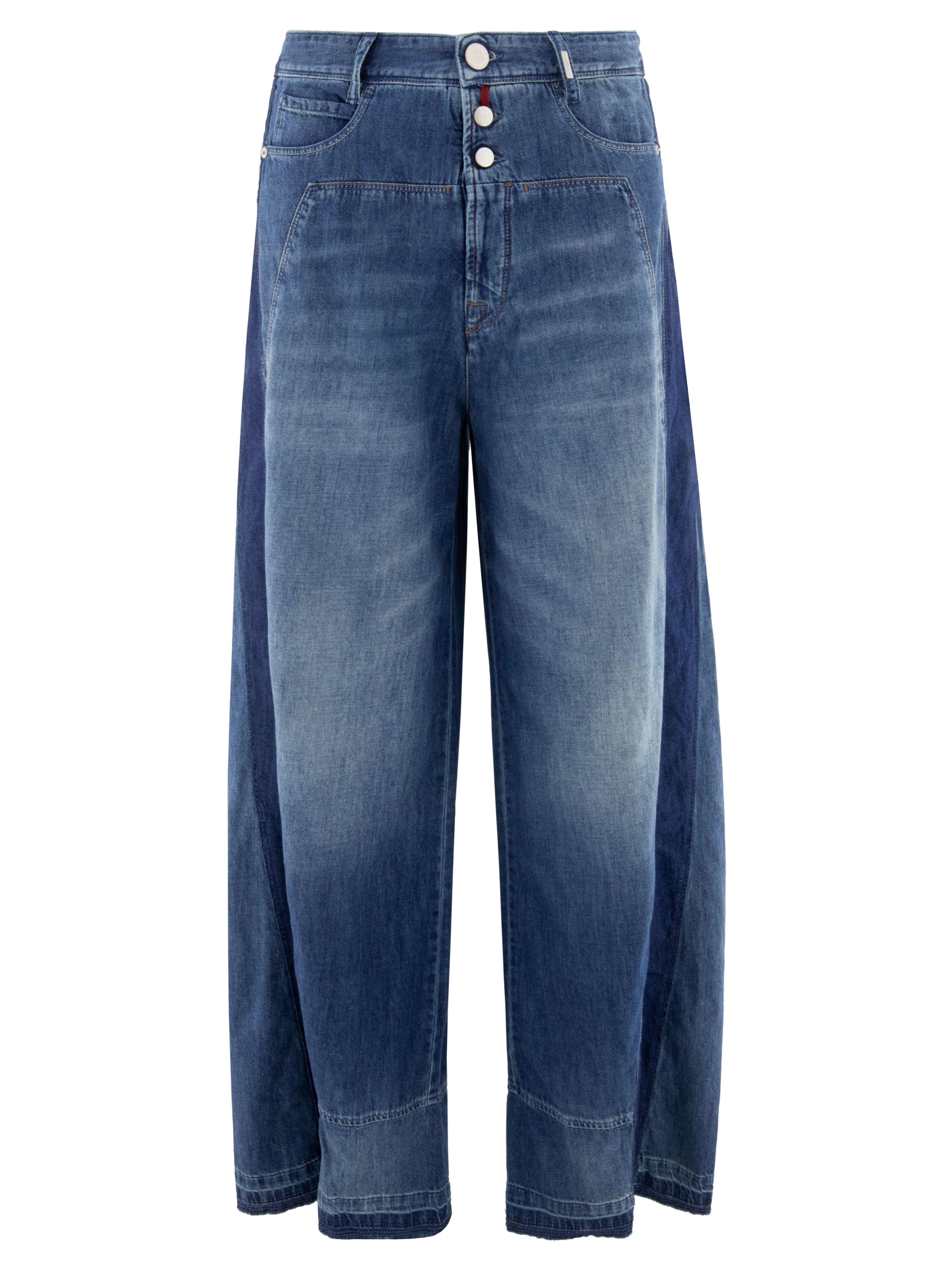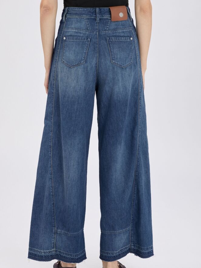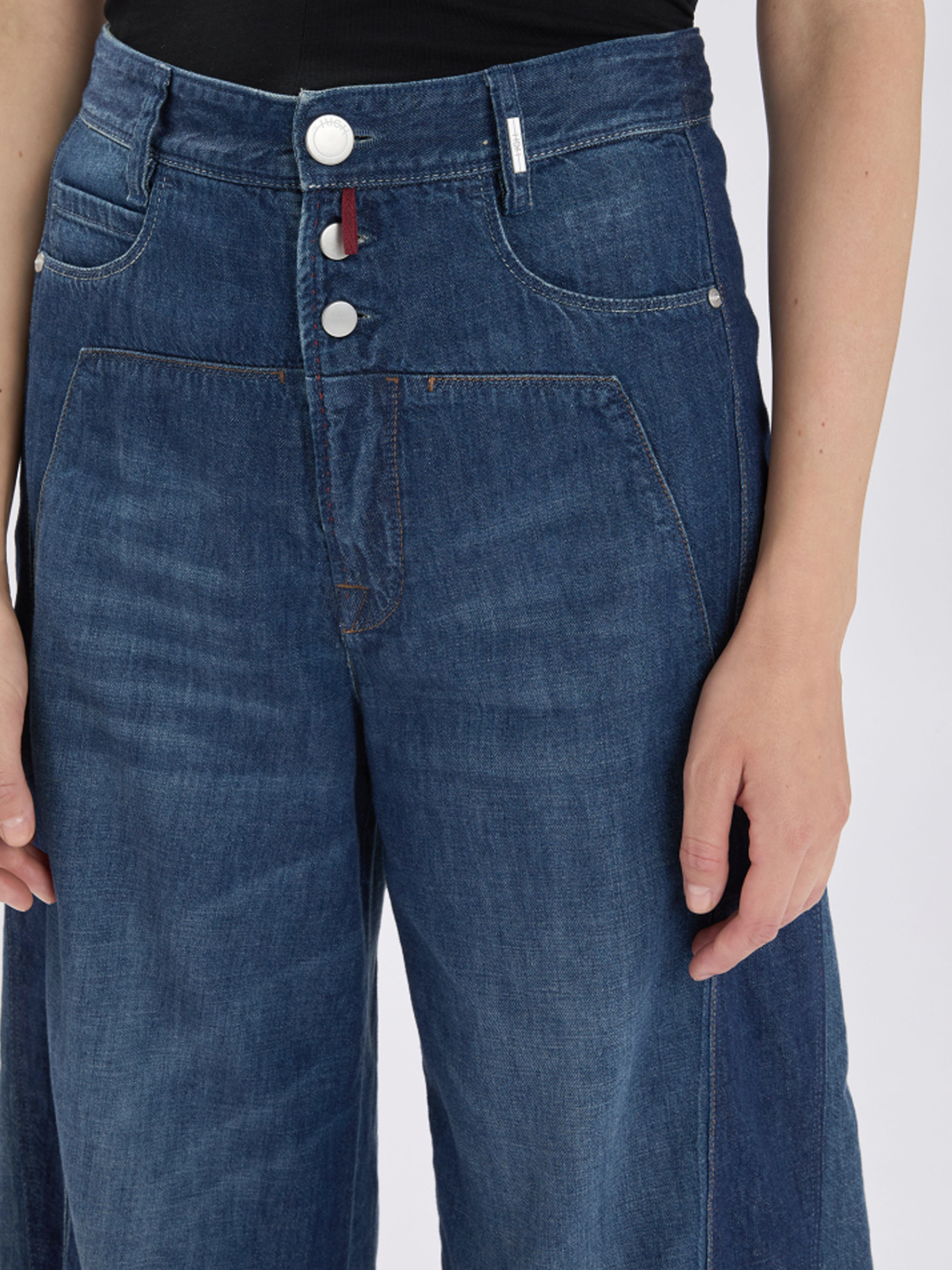 Een wijde used jeans van High in een lichtere jeanskleur. De jeans is uitgevoerd in een 5-pocketmodel. Langs de zijkanten loopt een brede baan in een donkere jeanskleur. De jeans heeft een sluiting met drie knopen, waaronder een korte ritssluiting. Deze jeans mag op 30 graden worden gewassen.