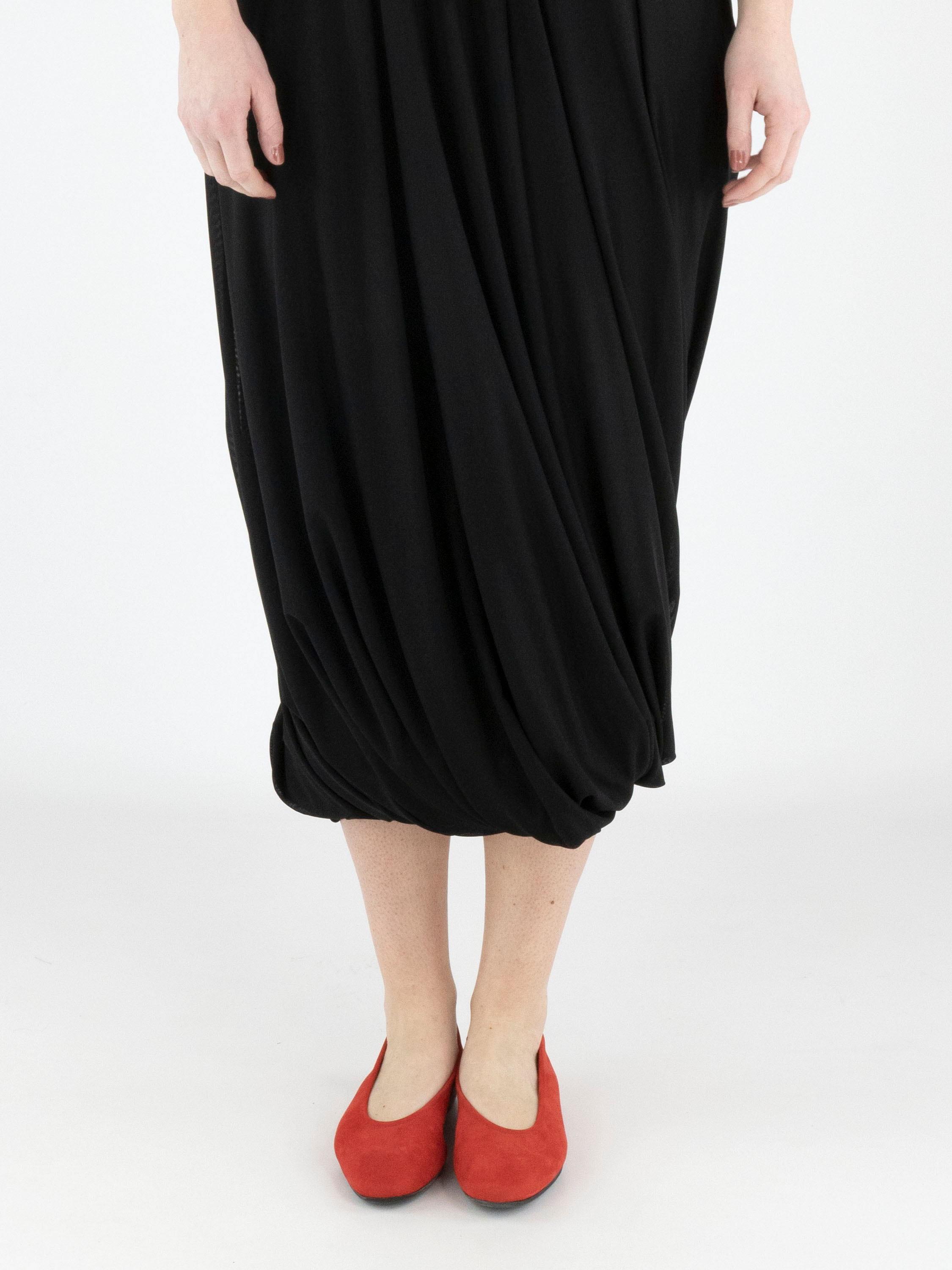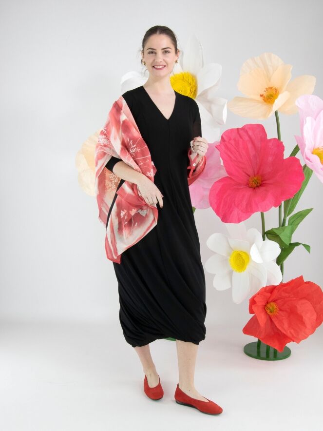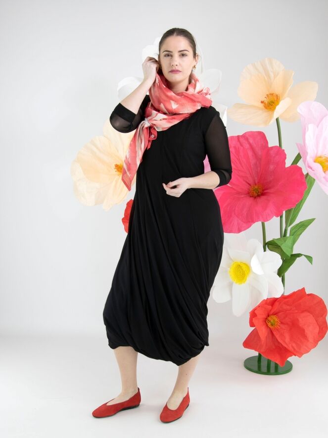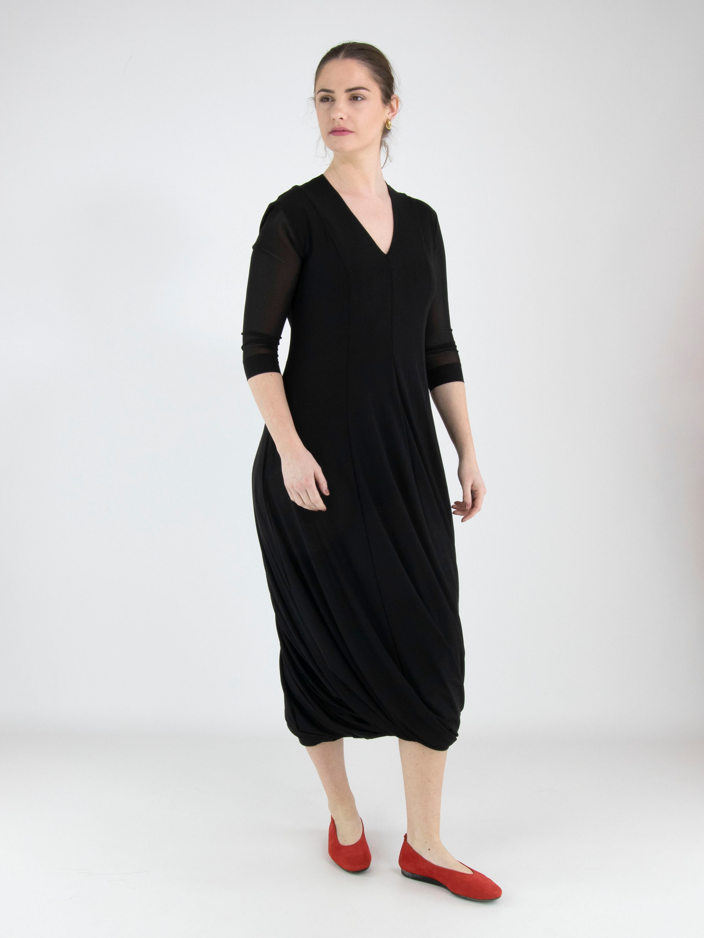 Een jurk van High Tech in de kleur zwart. De jurk is uitgevoerd in een dubbele, licht transparante stof. De transparante korte mouwen reiken tot de elleboog. Vanuit de taille loopt de jurk wijd uit in een A-lijn. De jurk heeft een V-hals en mag op de hand worden gewassen.