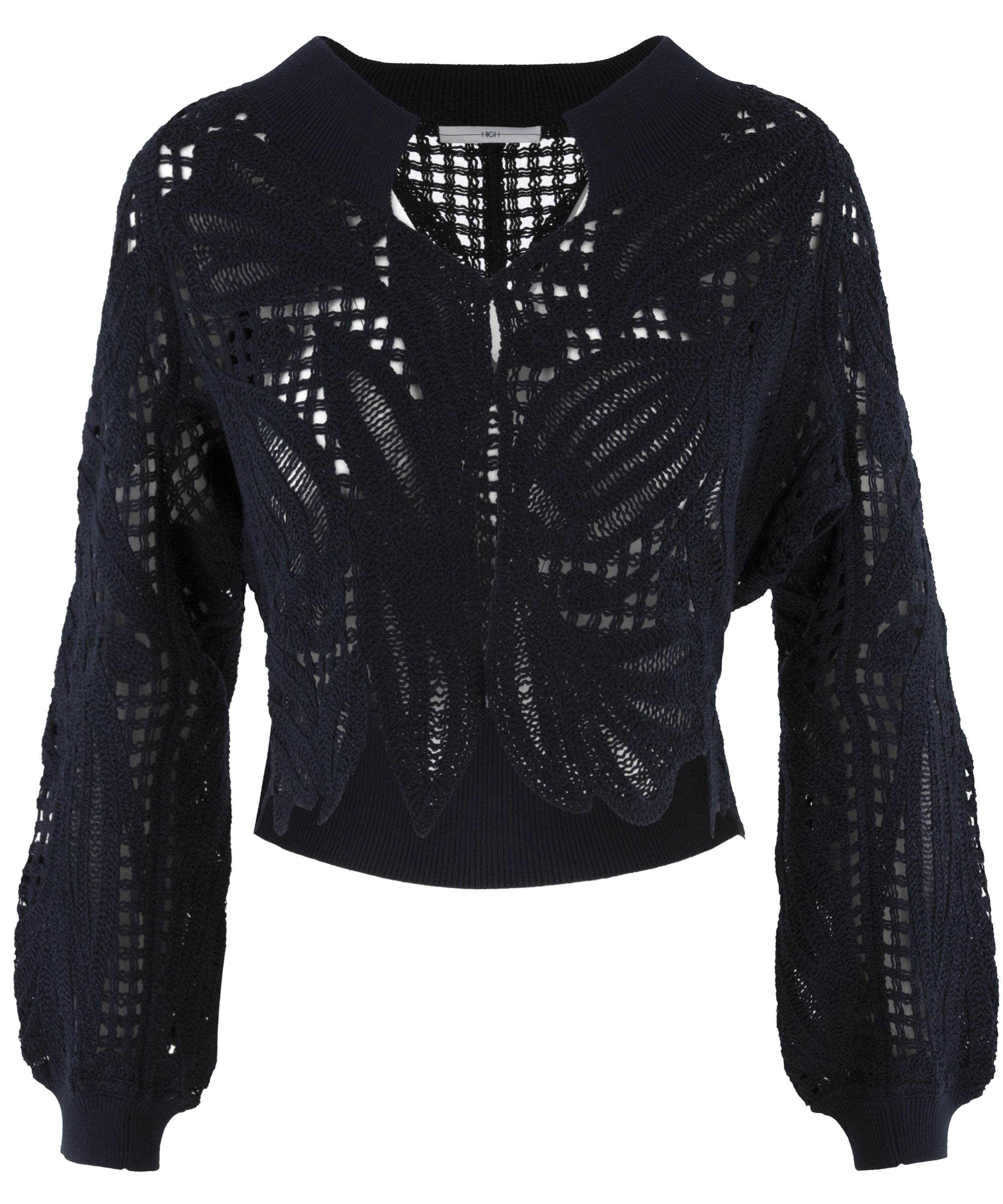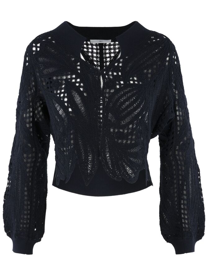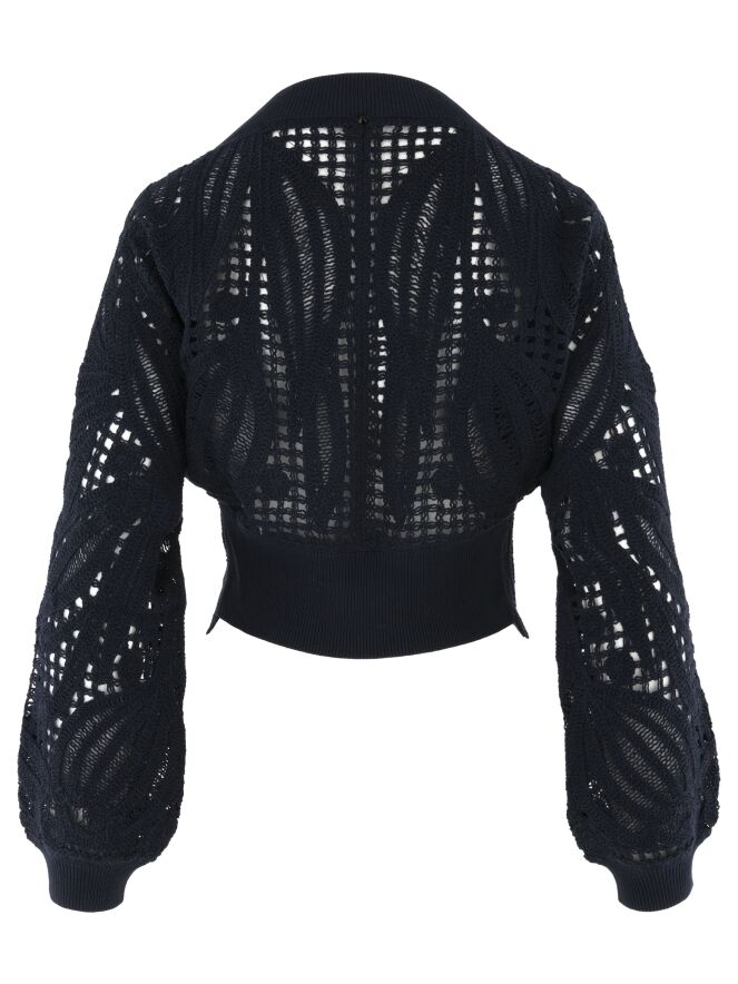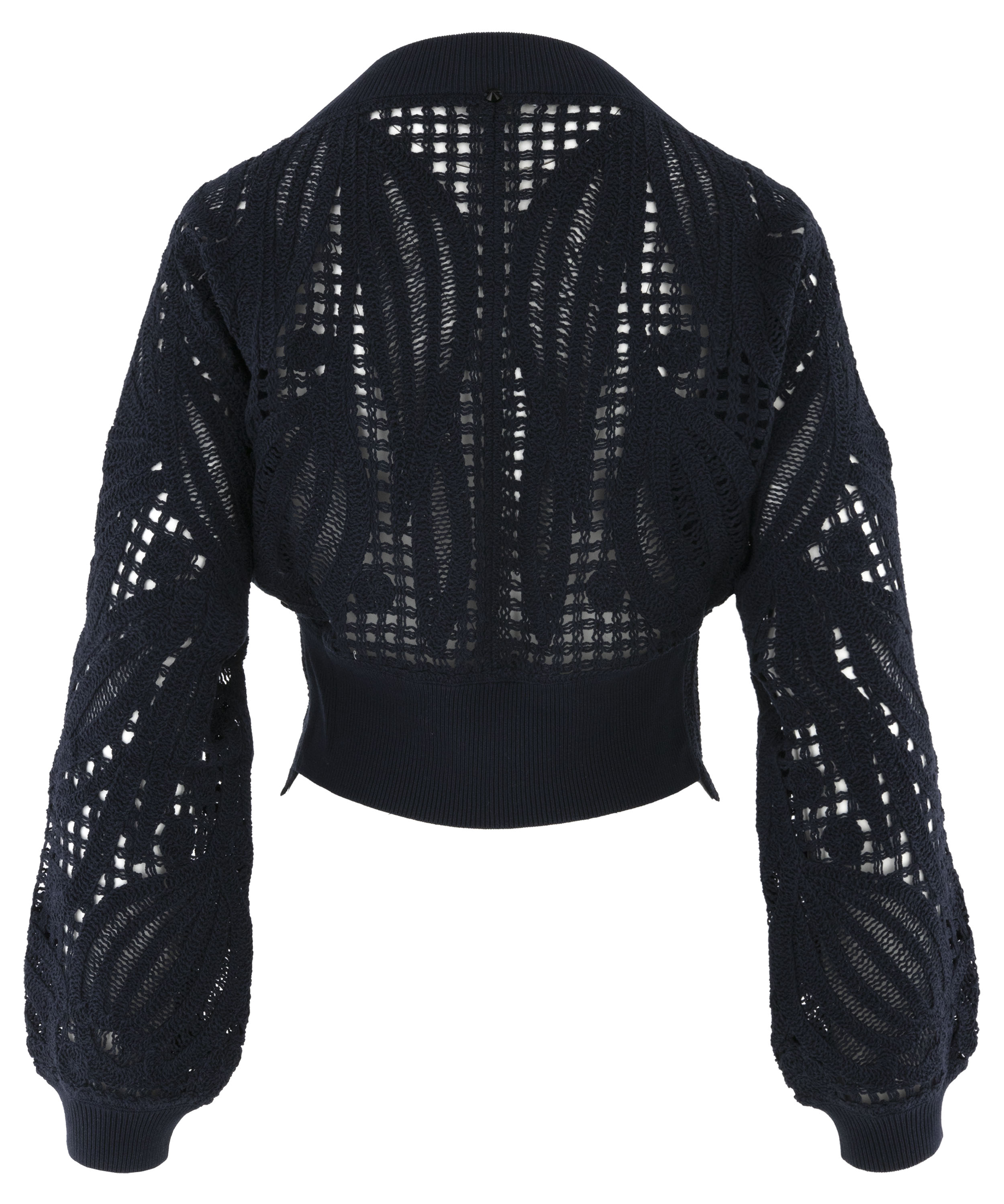 Een kort, opengehaakt vest van High in de kleur marineblauw. Het vest heeft een sluiting met twee kleine blinde knoopjes en is uitgevoerd met vleermuismouwen. Langs de rand van de hals loopt een brede, fijn geribbelde tricot boord. Deze boord is ook verwerkt aan de onderkant van de achterzijde en aan de uiteinden van de lange mouwen. Dit vest kan met de hand worden gewassen.