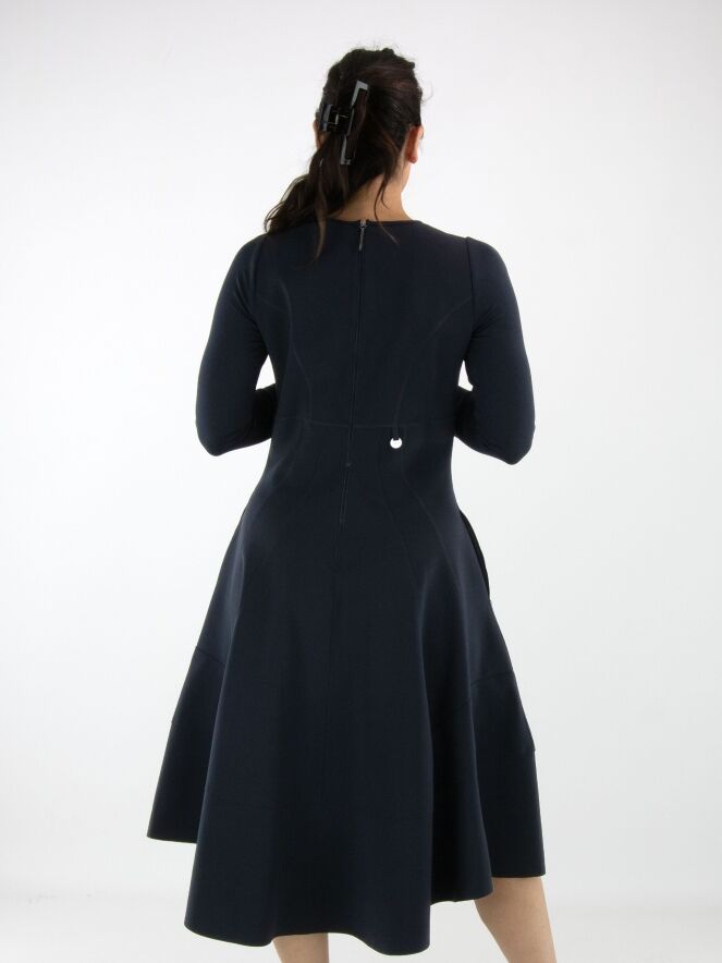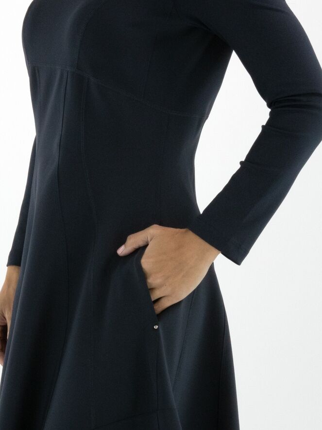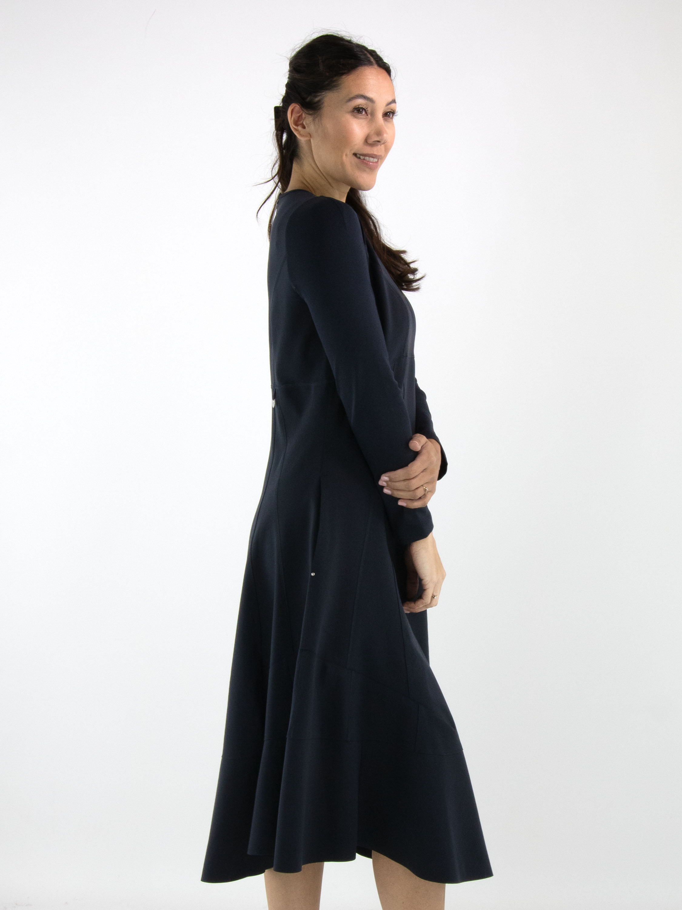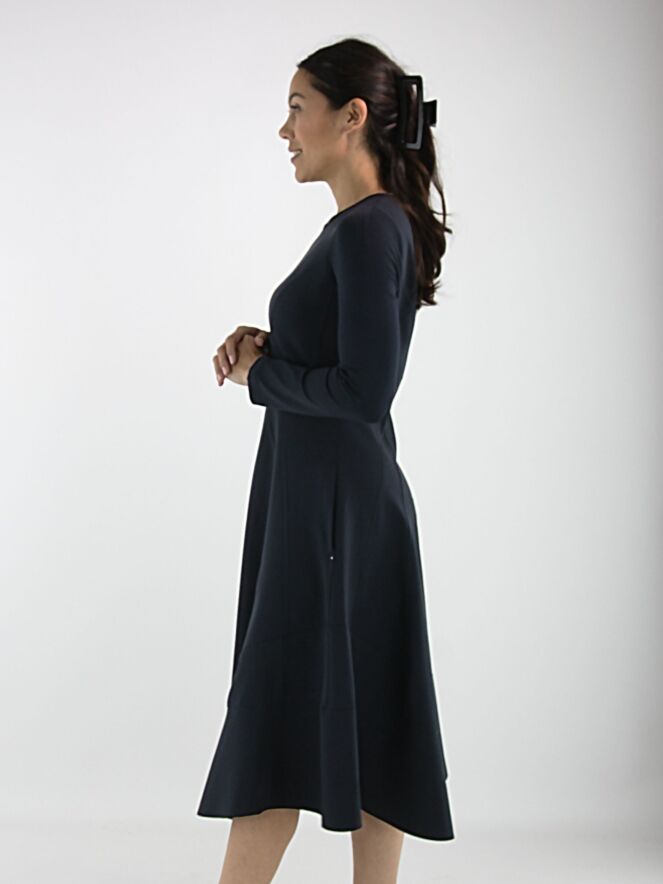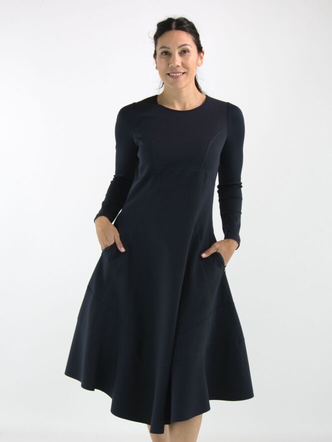 Een jurk van High in een marineblauwe kleur. De jurk heeft een ronde hals en lange mouwen. Vanuit de slanke taille loopt het model elegant wijd uit, waardoor een vrouwelijk silhouet ontstaat. Op taillehoogte zijn steekzakken verwerkt. Deze jurk kan met de hand worden gewassen.