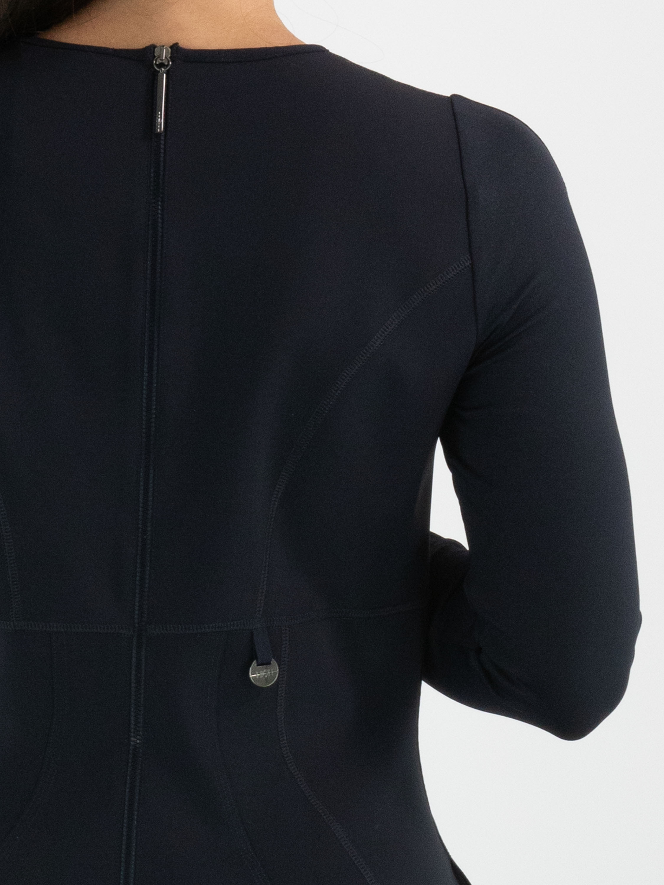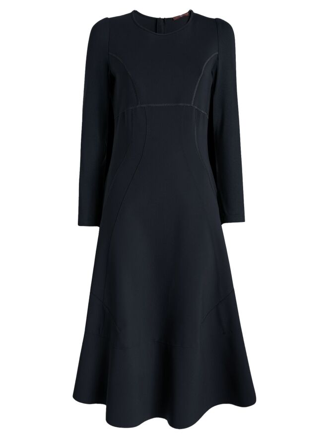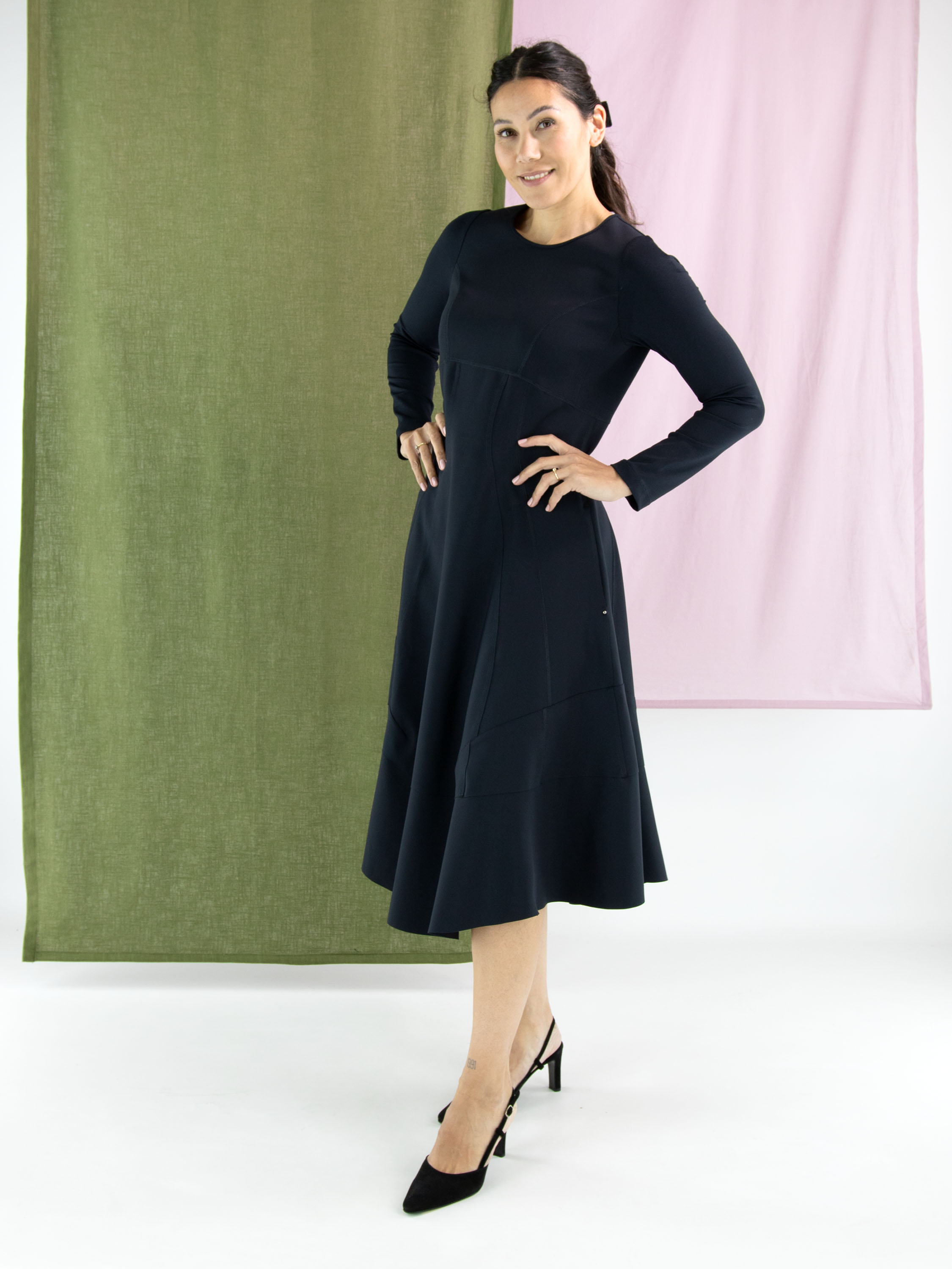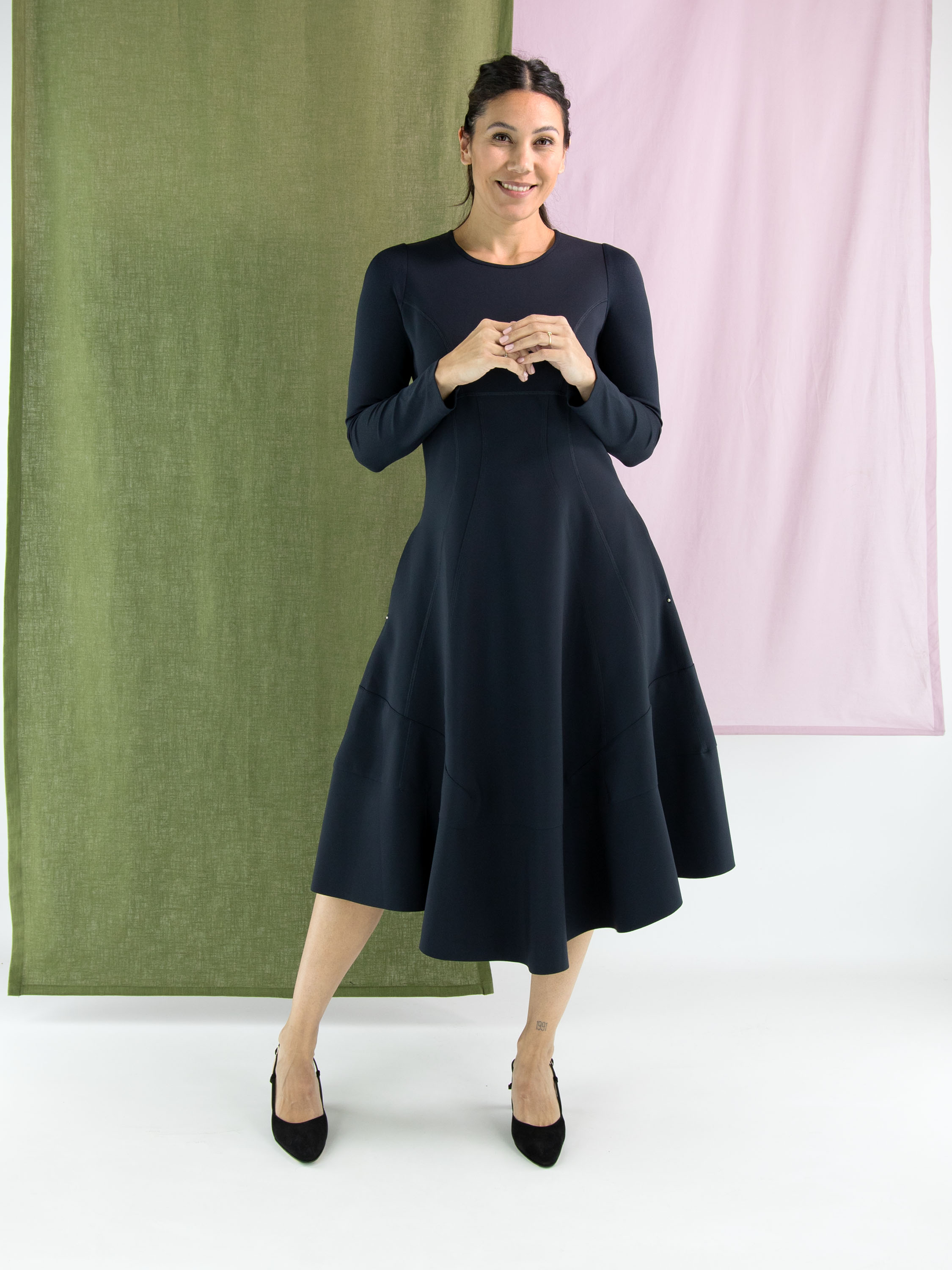 Een jurk van High in een marineblauwe kleur. De jurk heeft een ronde hals en lange mouwen. Vanuit de slanke taille loopt het model elegant wijd uit, waardoor een vrouwelijk silhouet ontstaat. Op taillehoogte zijn steekzakken verwerkt. Deze jurk kan met de hand worden gewassen.