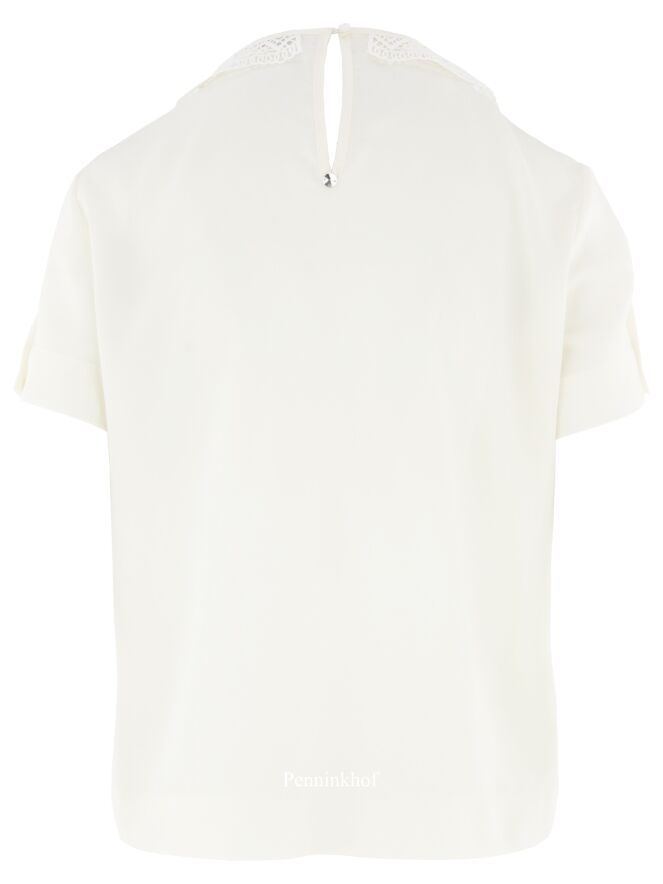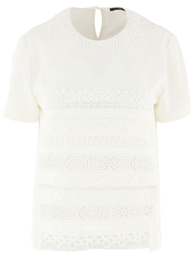 Een shirt van High in de kleur roomwit. De voorzijde is deels transparant doordat vanaf de buste tot aan de onderkant meerdere kanten patronen worden afgewisseld met een mat satijnen stof. Het shirt heeft een kanten kraag. Dit shirt mag op de hand worden gewassen.