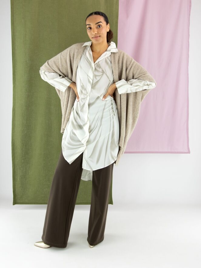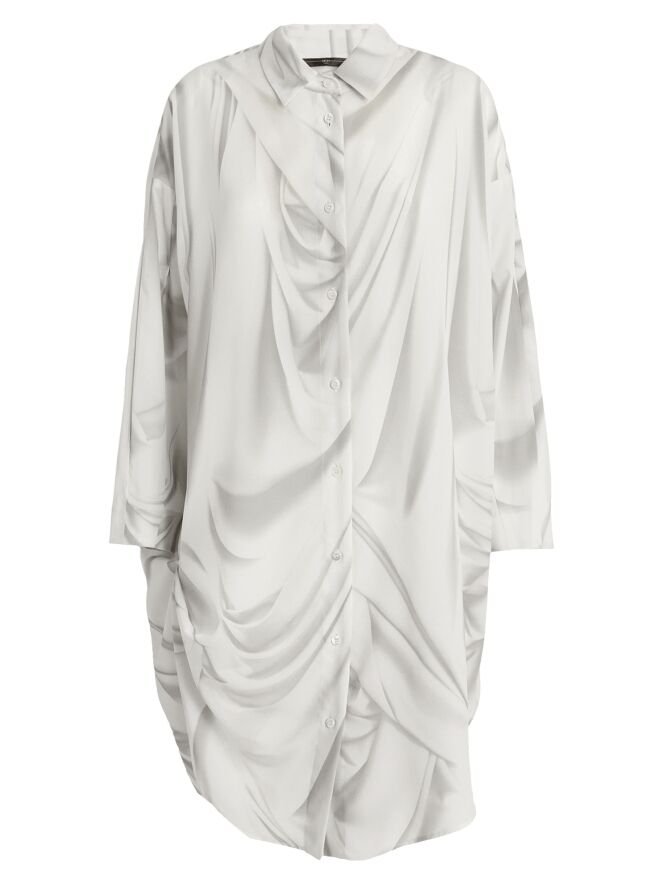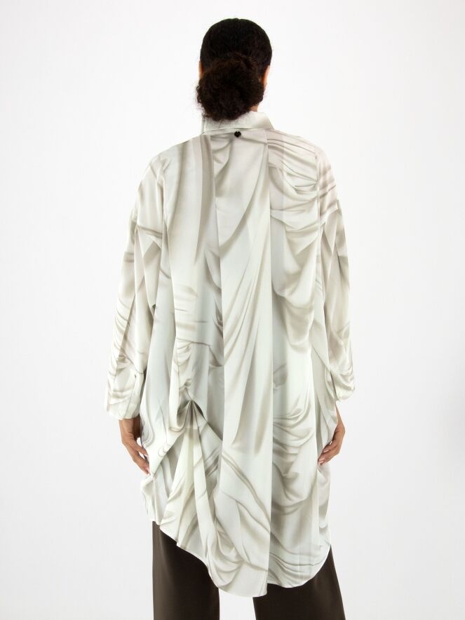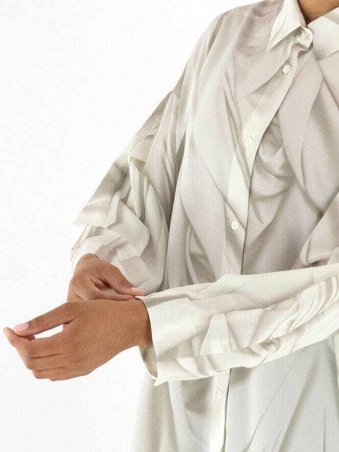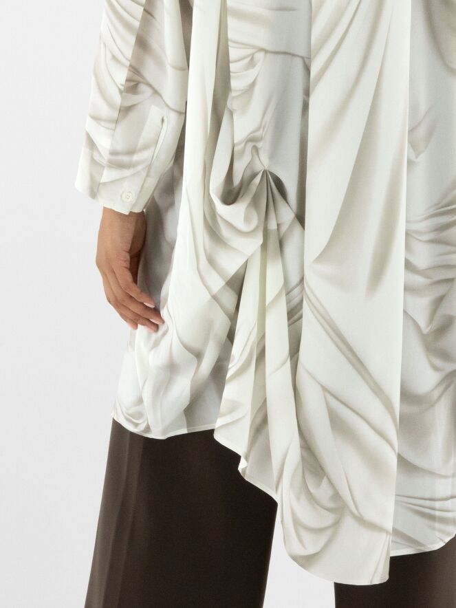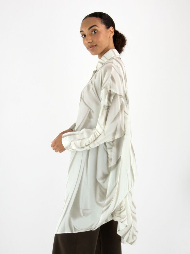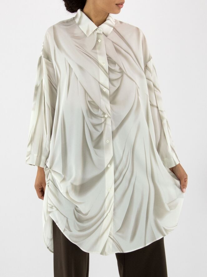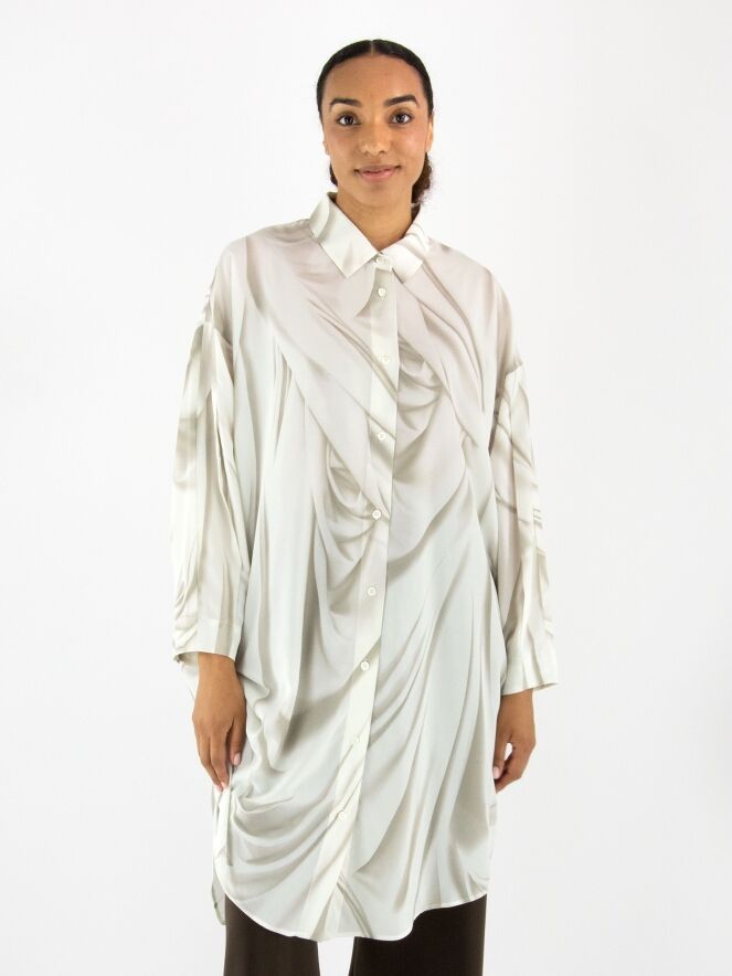 Een oversized blouse van High met een plooienprint in meerdere tinten kit en roomwit. De onderkant is rond gesneden. Aan de achterkant, ter hoogte van de heup, bevindt zich een ophaaldetail dat een drapeereffect creëert. De blouse heeft halflange mouwen en mag op 30 graden worden gewassen.
