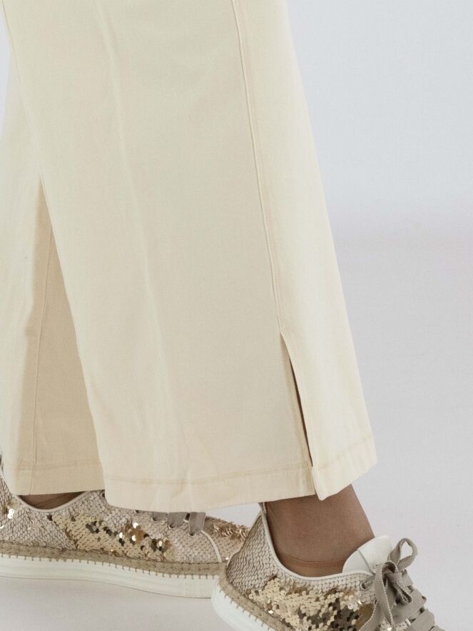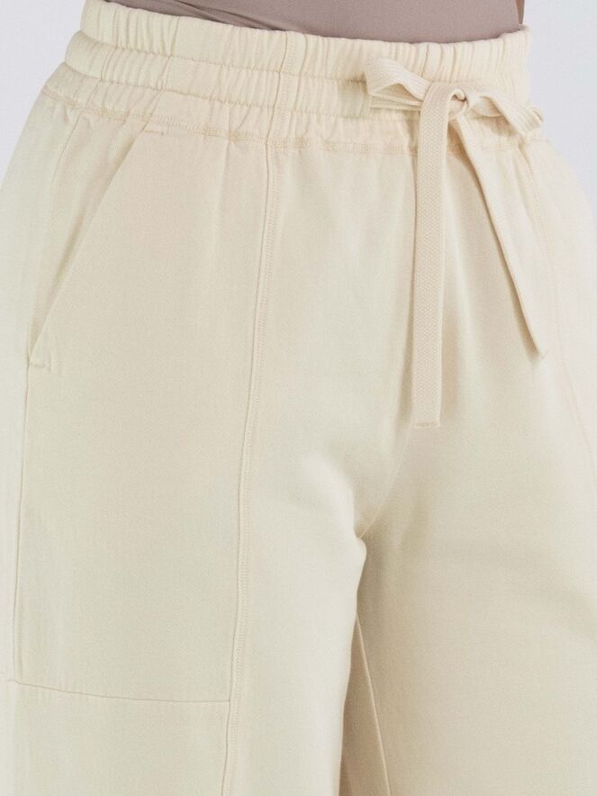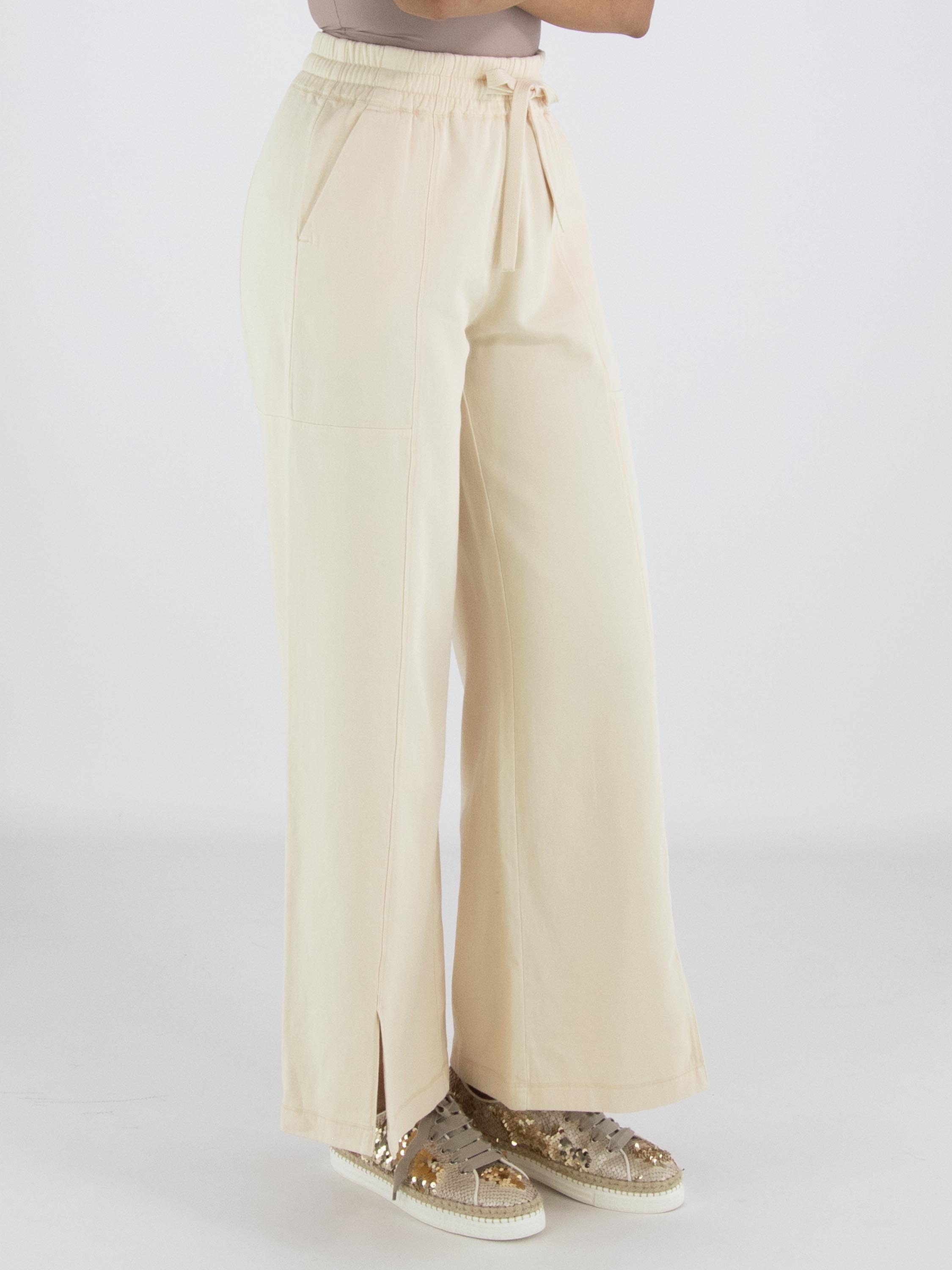 Een joggingbroek van High Lab in een pastelgele kleur. In de taille is een geplooide elastische band met een koord in een tunnelverwerking. Aan de onderkant is middenvoor een split in de pijpen. De broek heeft steekzakken en mag op 30 graden worden gewassen.
