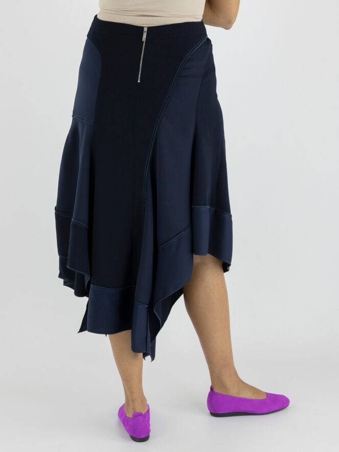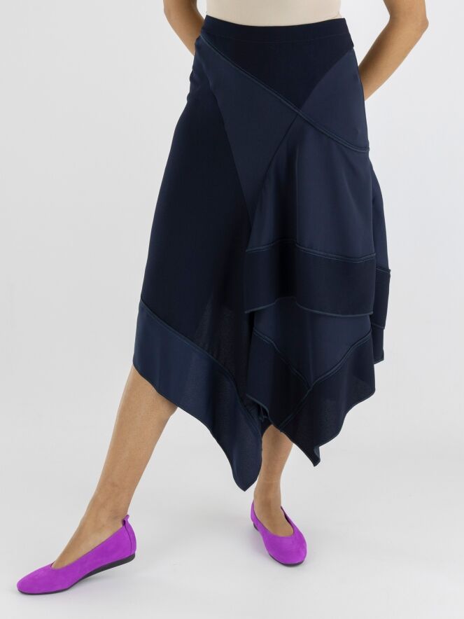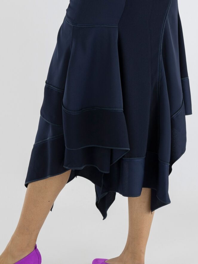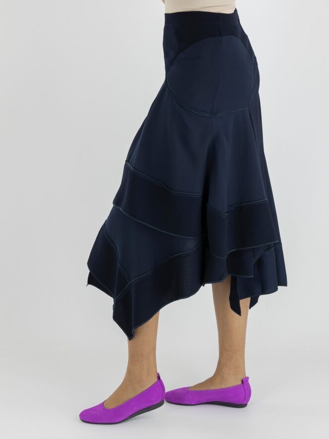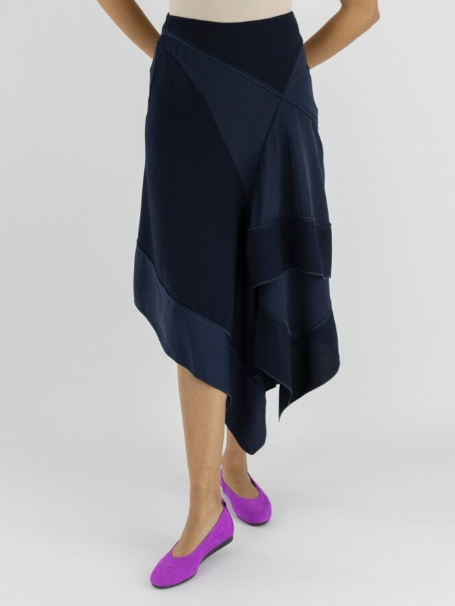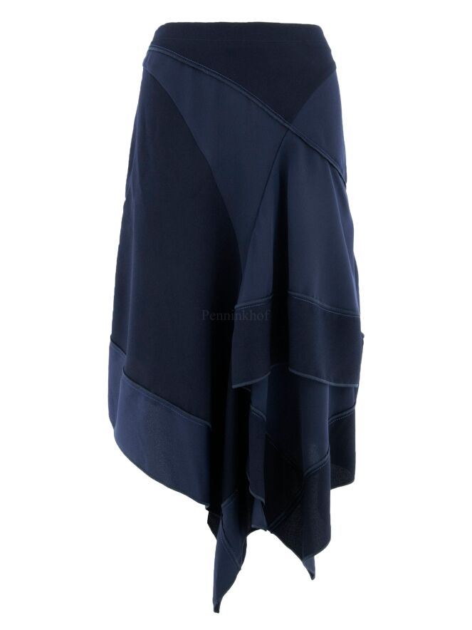 Een rok van High in meerdere tinten marineblauw. De stoffen in de jurk zijn mat, matsatijn en mat licht transparant aan de onderkant. De rok heeft een A lijn en vanuit de taille zijn er meerdere gebogen diagonale stiknaden en plooien. Deze rok mag op de hand worden gewassen.