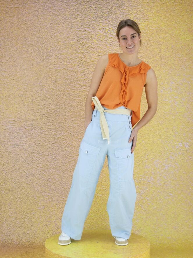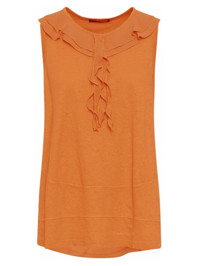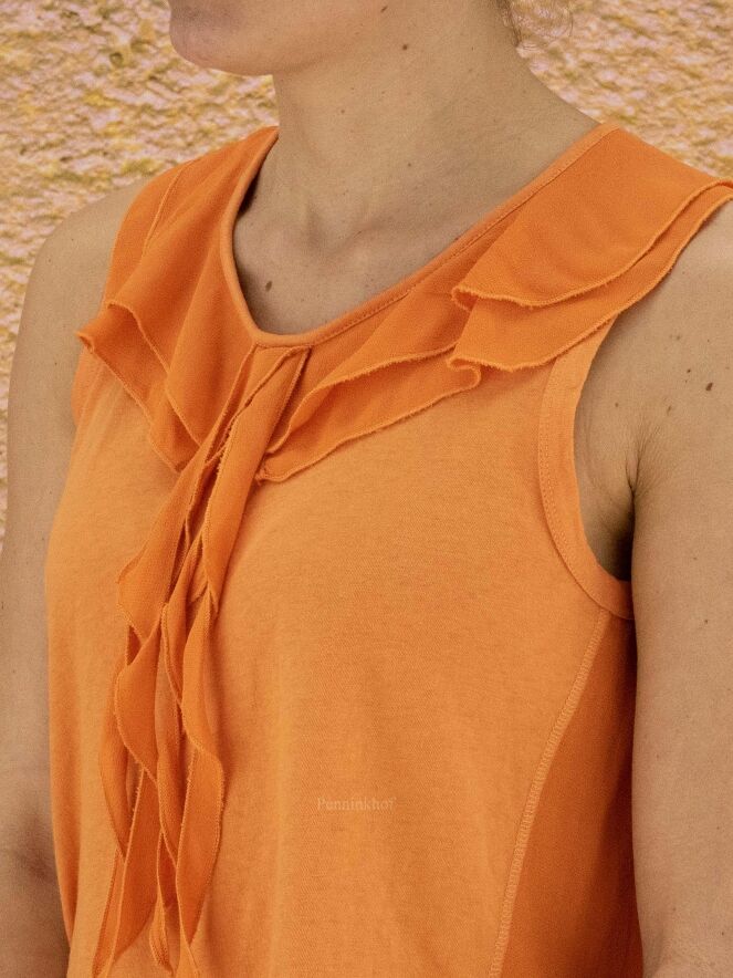 Een top van High in een oranje kleur. De top heeft een A - Lijn en de achterkant is 15 cm langer als de voorzijde. Langs de rand van de ronde hals is een dubbele licht transparante stof met 2 linten in het midden. De achterzijde en de zijkanten zijn in een licht transparante stof. Deze top mag op de hand worden gewassen.