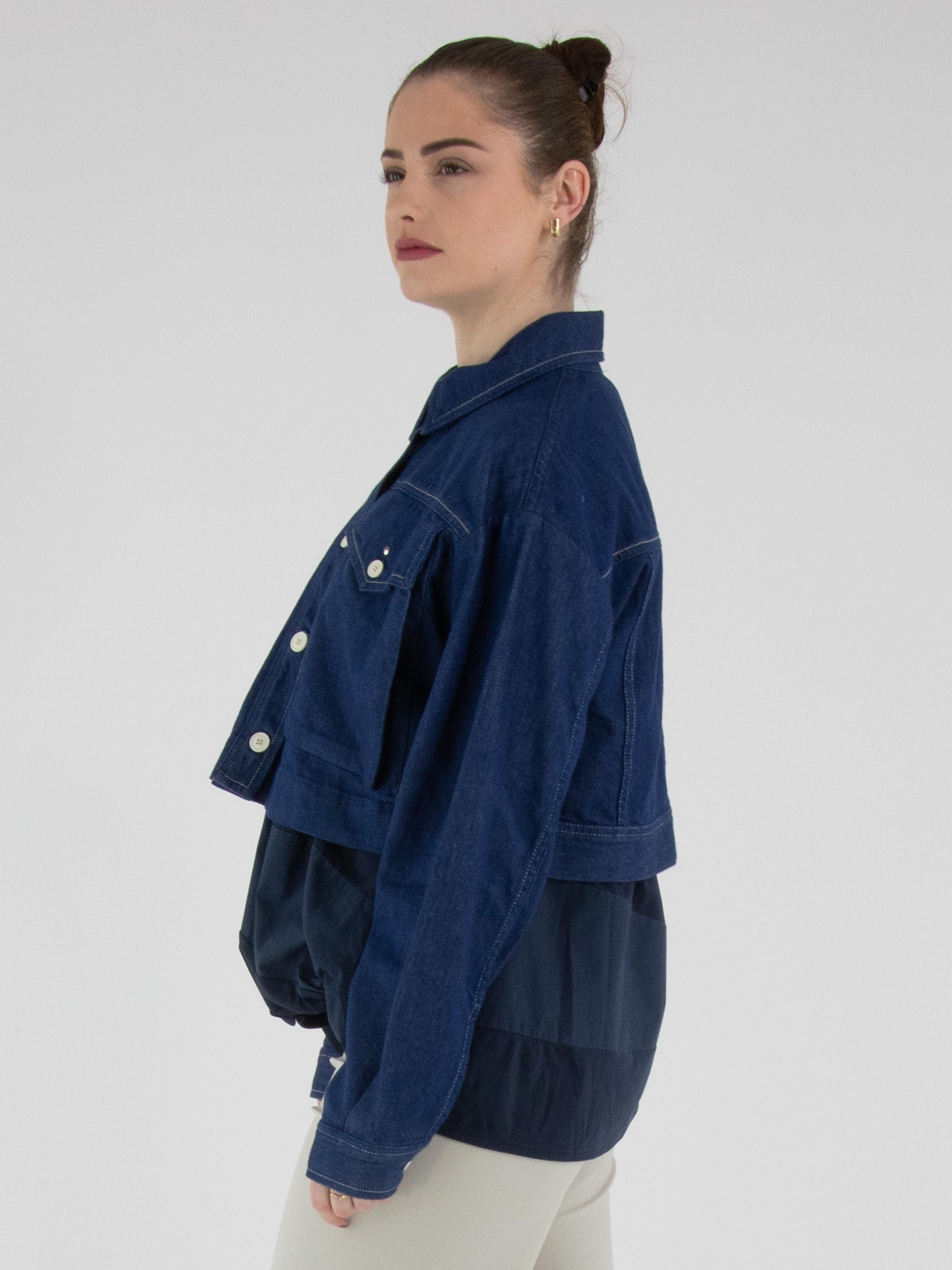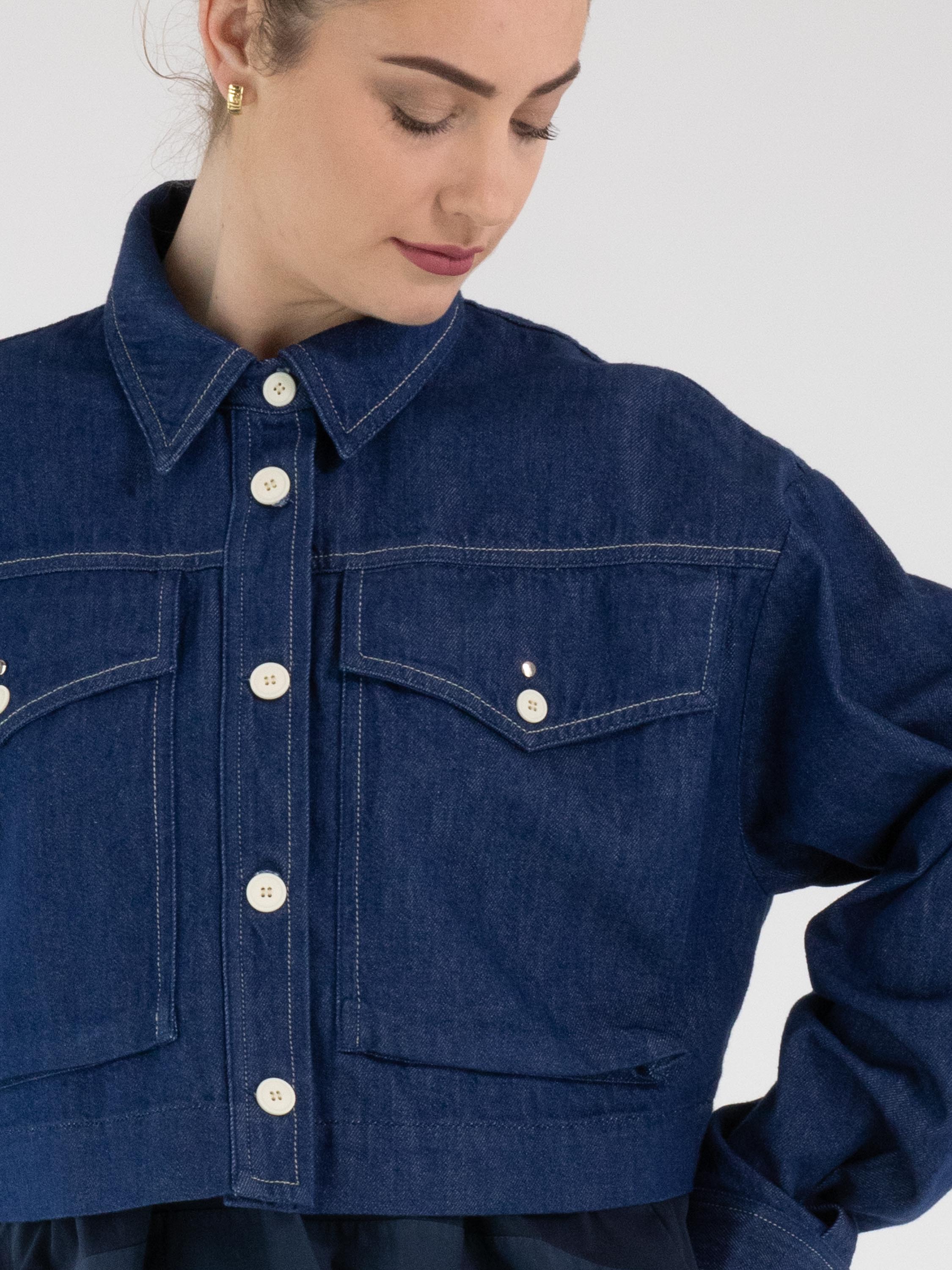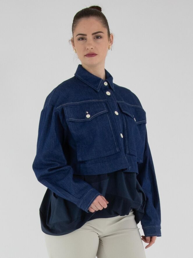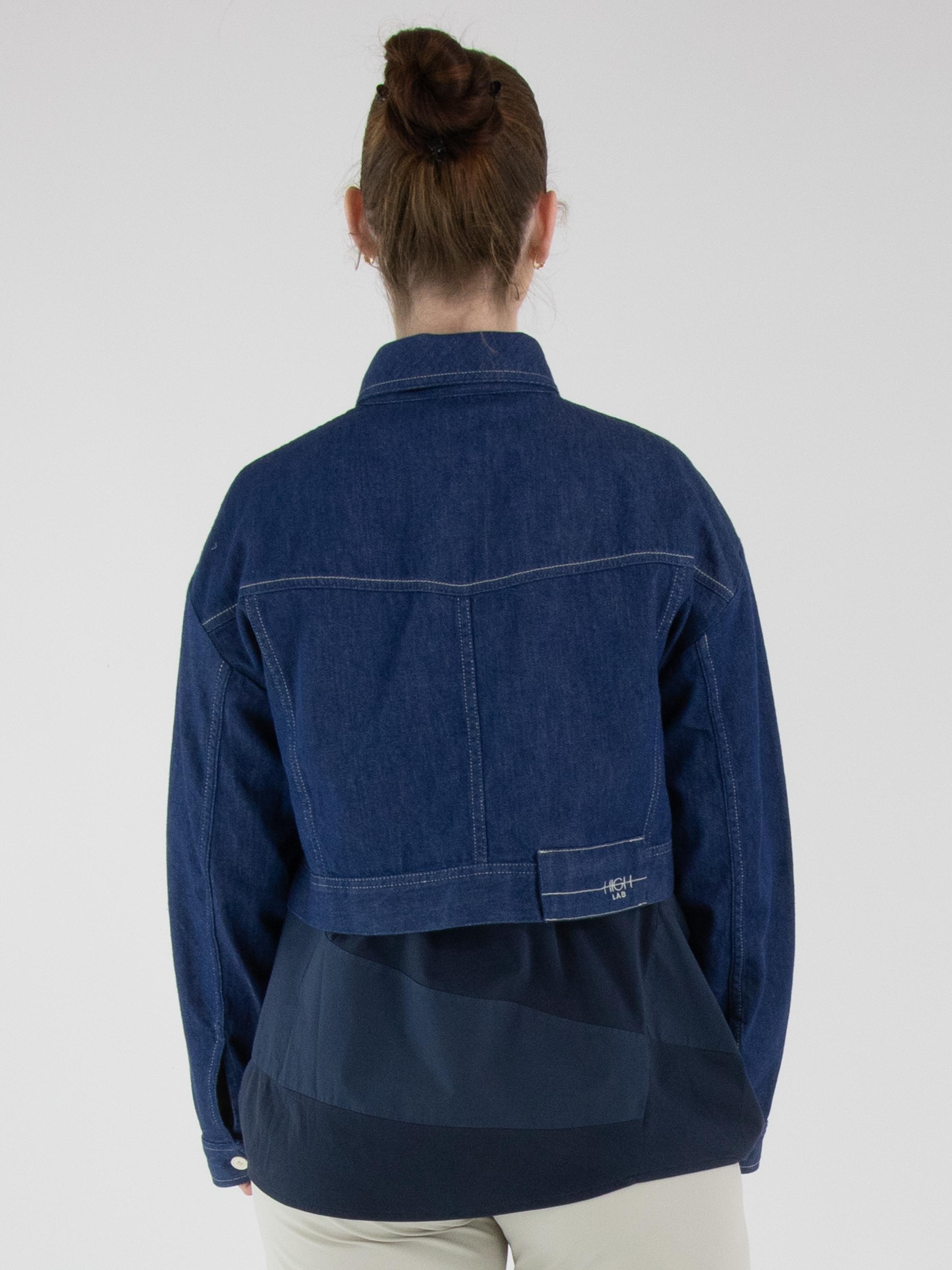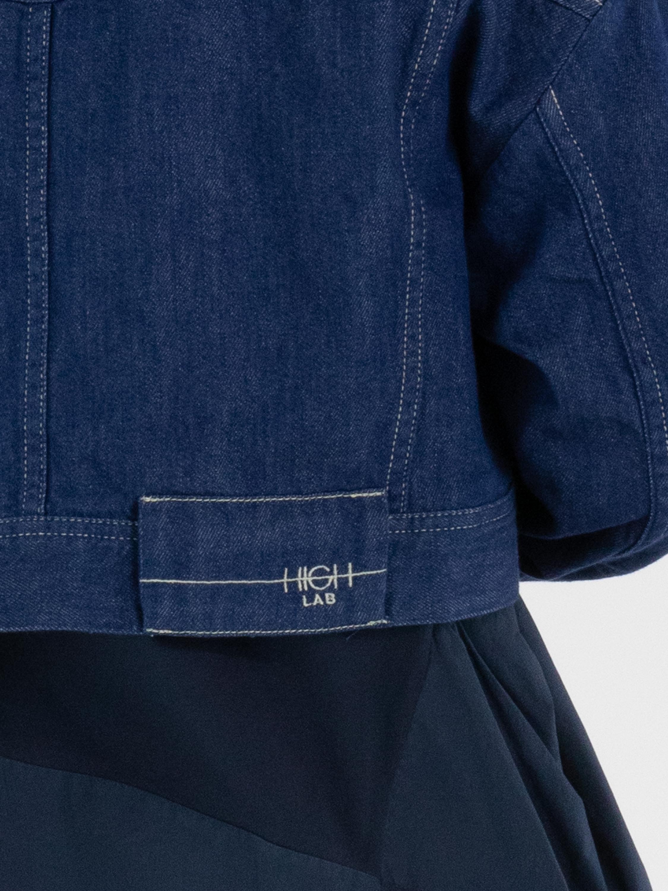 Een korte jeansblazer van High in een volle jeanskleur. De blazer heeft een sluiting met vijf roomwitte knopen. Op de borstzakken zijn dezelfde knopen geplaatst, met daarboven een zilverkleurige stud. Deze blazer kan op 30 graden worden gewassen.