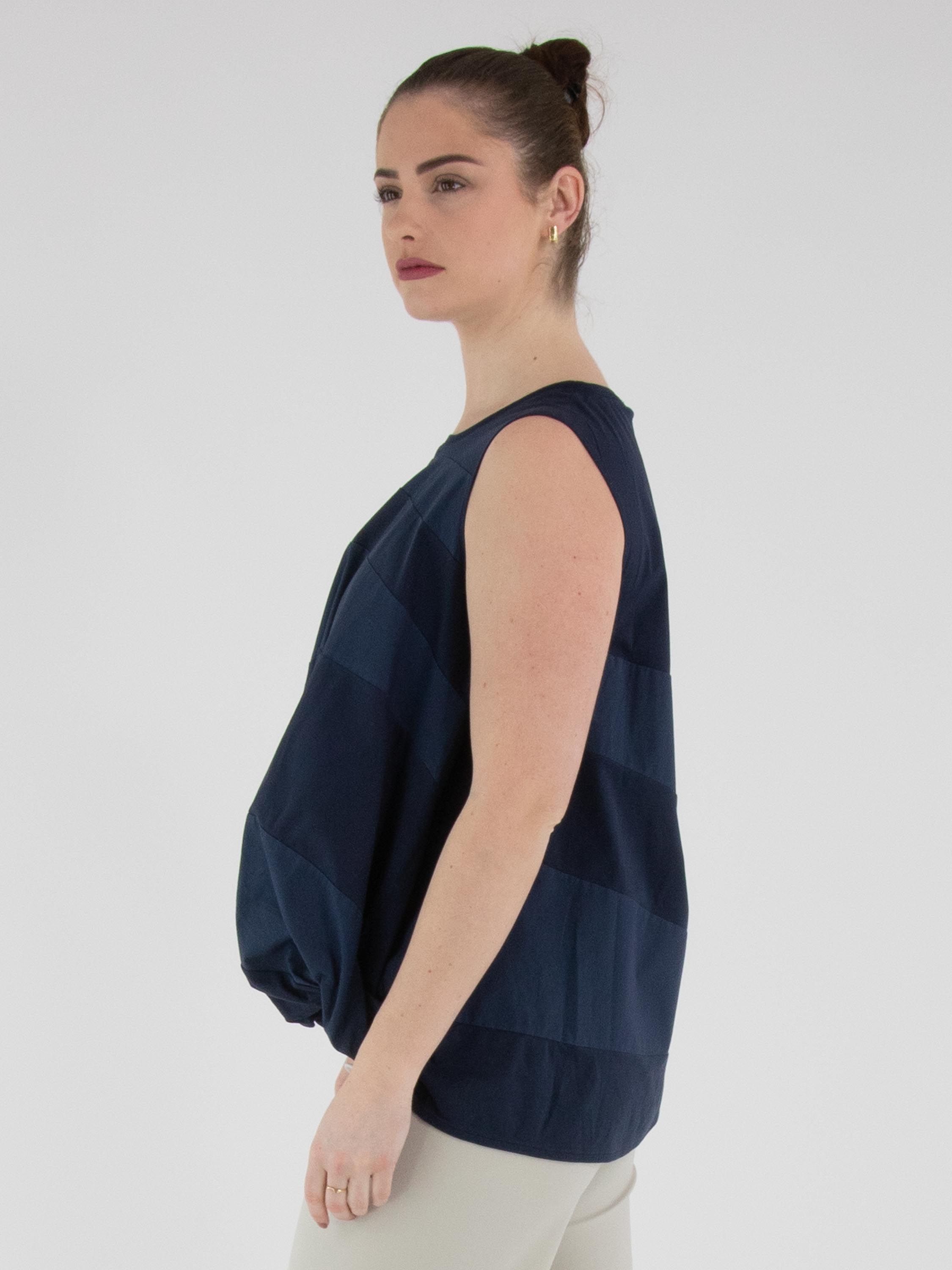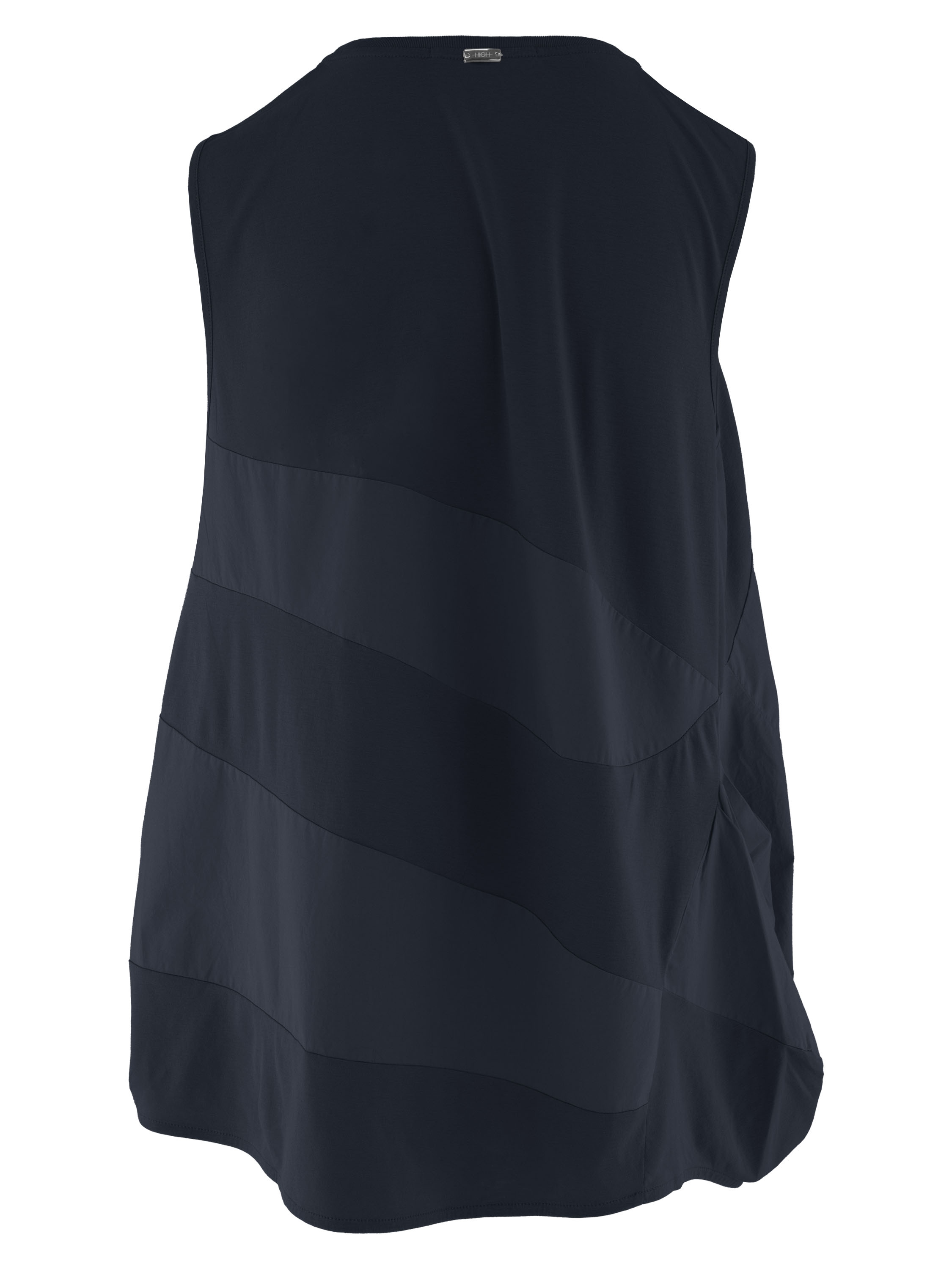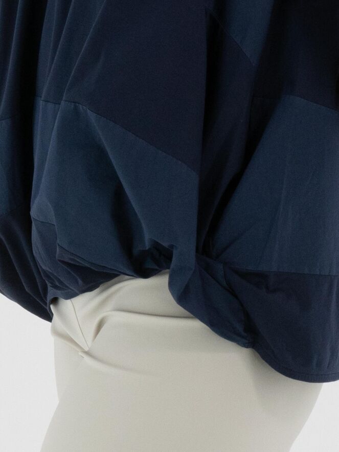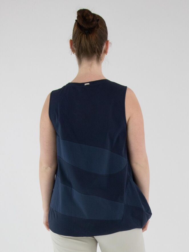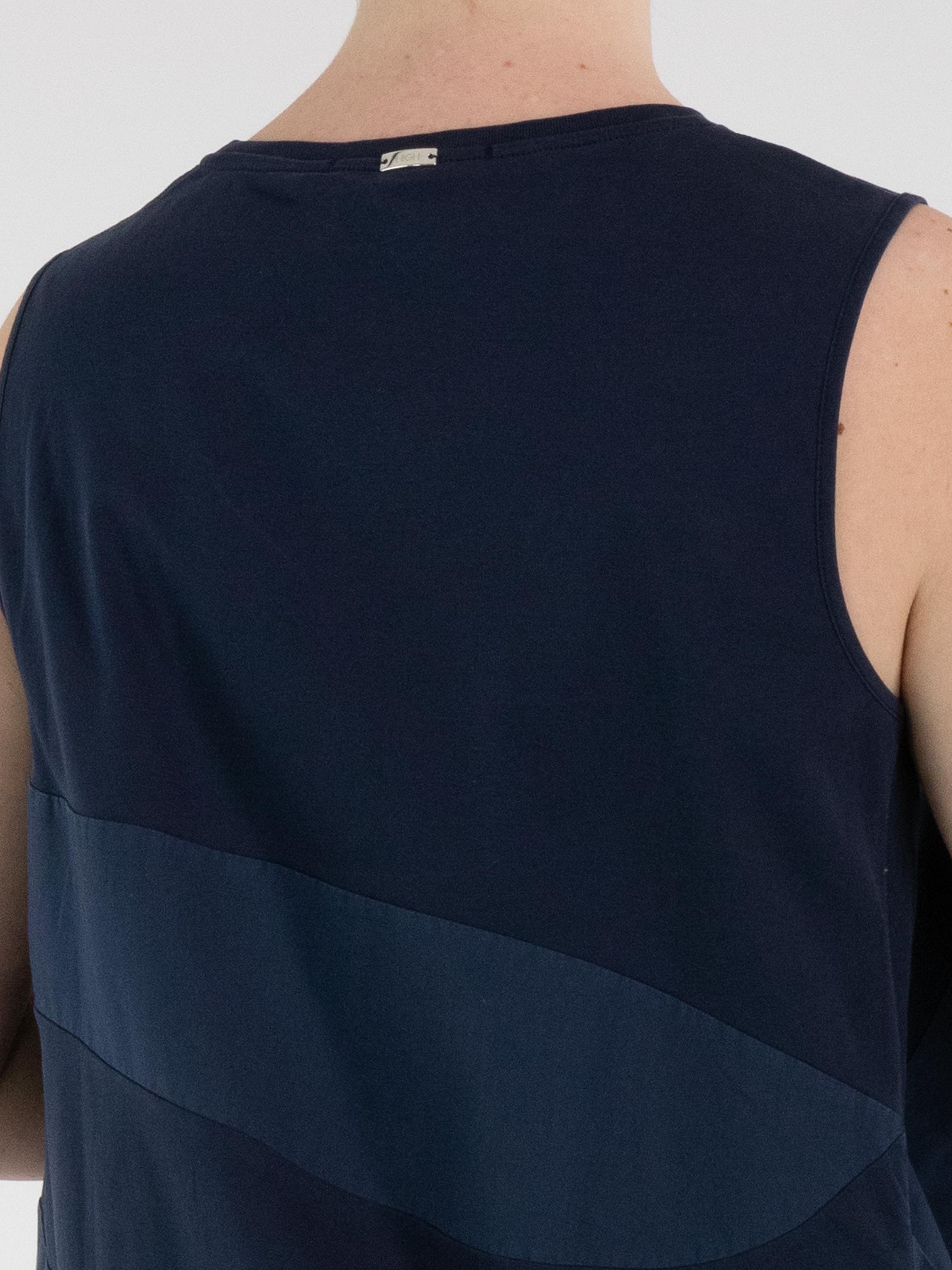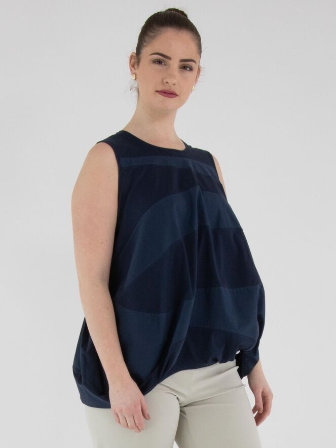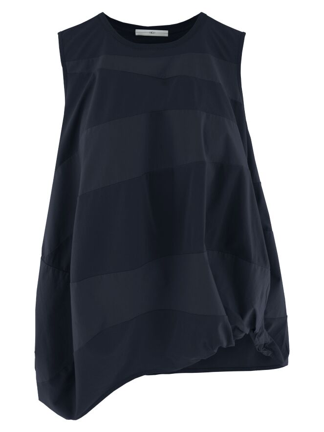 Een top van High met een breed strepenpatroon in de kleuren nachtblauw en marineblauw. Langs de rand van de ronde hals is een fijn geplooide tricot bies verwerkt. Aan de onderkant is de stof aan de zijkanten geplooid. Deze top kan met de hand worden gewassen.