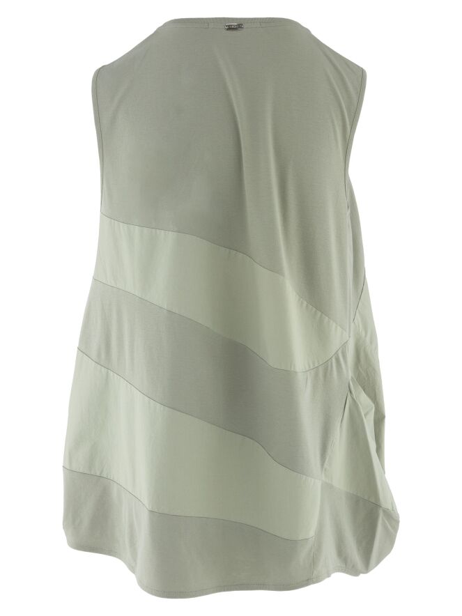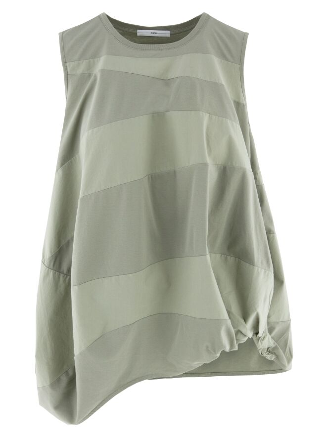 Een top van High met een breed strepenpatroon in twee tinten olijfgroen. Langs de rand van de ronde hals is een fijn geplooide tricot bies verwerkt. Aan de onderkant is de stof aan de zijkanten geplooid. Deze top kan met de hand worden gewassen.
