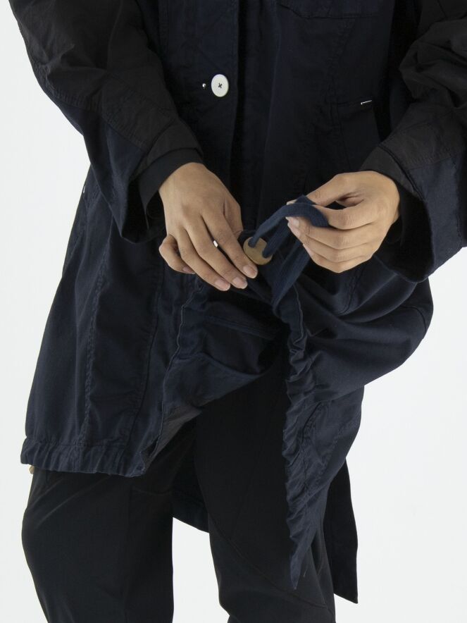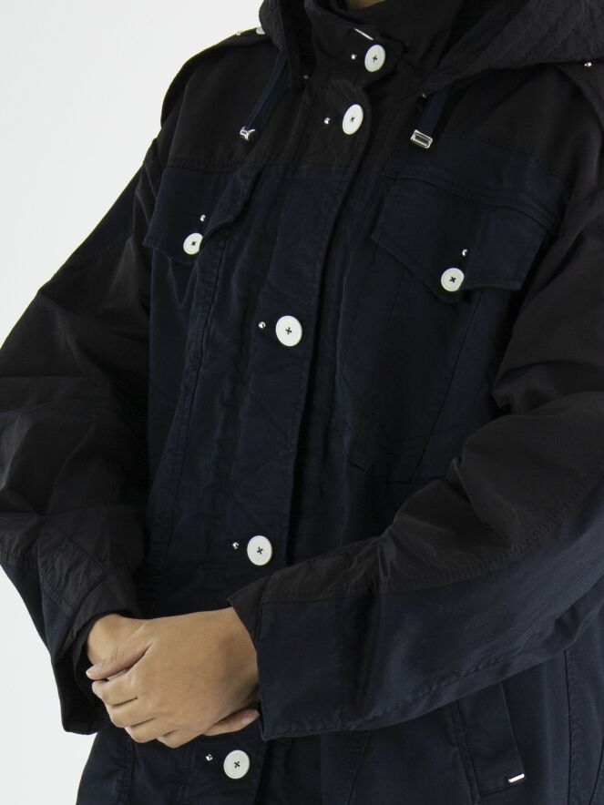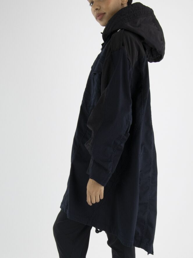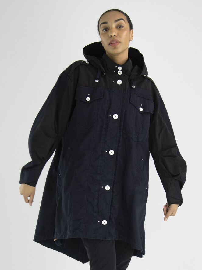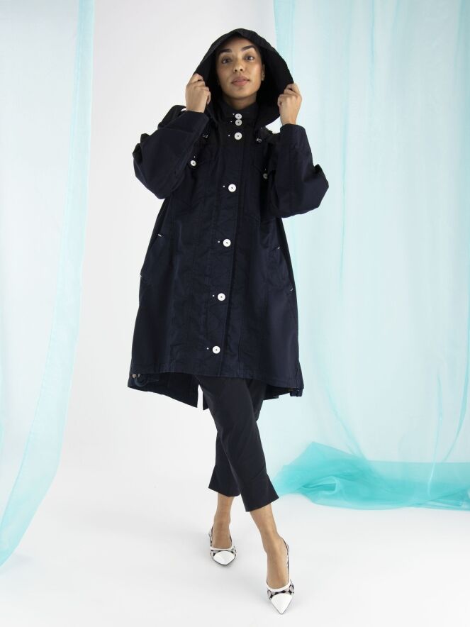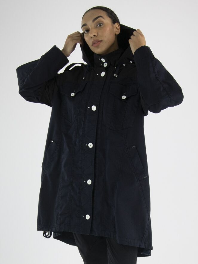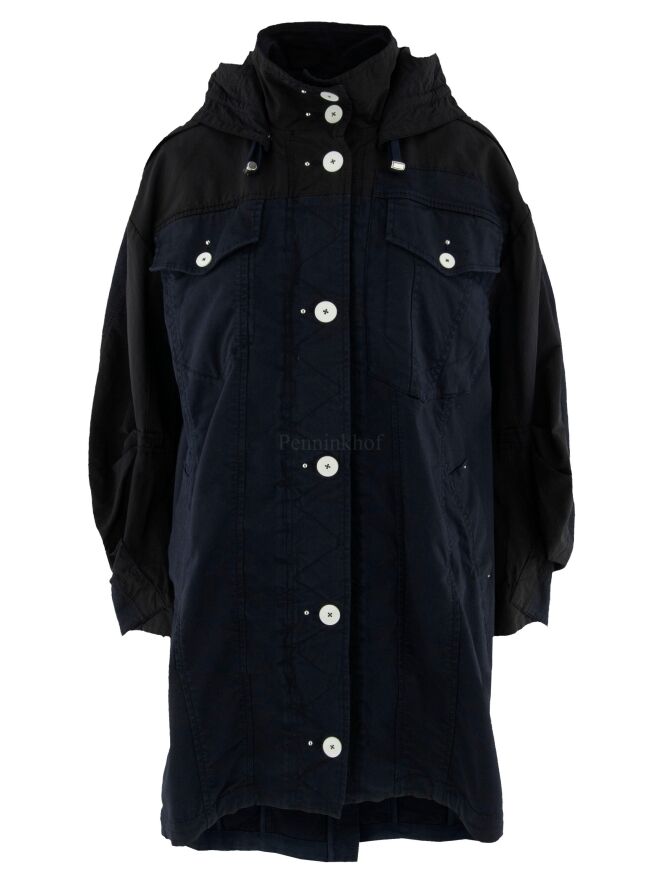 Een parka coat van High in de kleur marineblauw. De capuchon is afknoopbaar en over de ritssluiting is een extra knoopsluiting. De coat heeft een lichte A Lijn en ter hoogte van de taille zijn steekzakken. Deze coat mag op 30 graden worden gewassen.