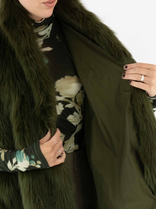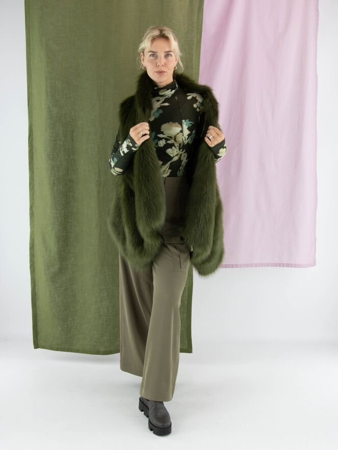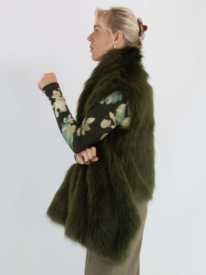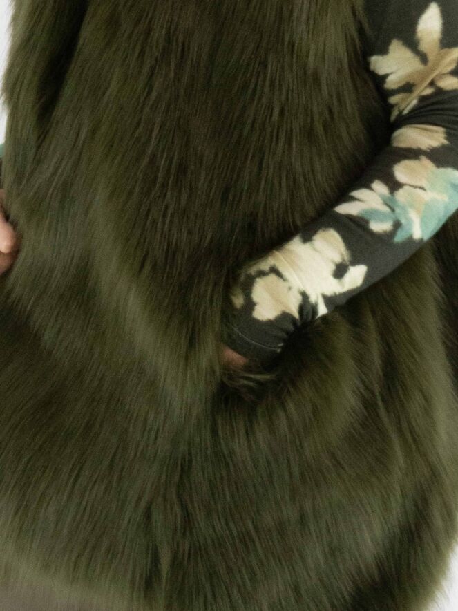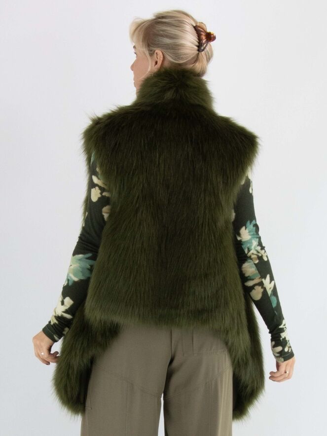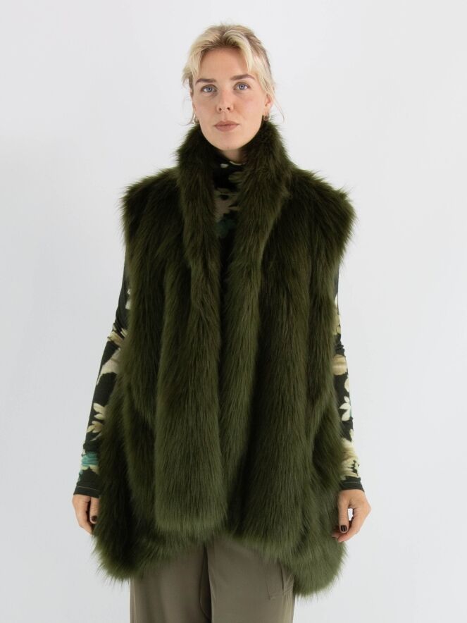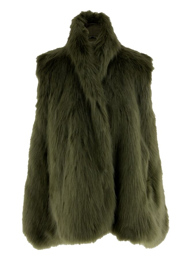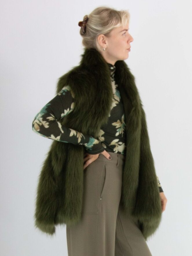 Een bodywarmer van High in imitatiebont in de kleur olijfgroen. De bodywarmer is omkeerbaar en heeft aan beide zijden steekzakken. Deze bodywarmer mag niet worden gewassen.