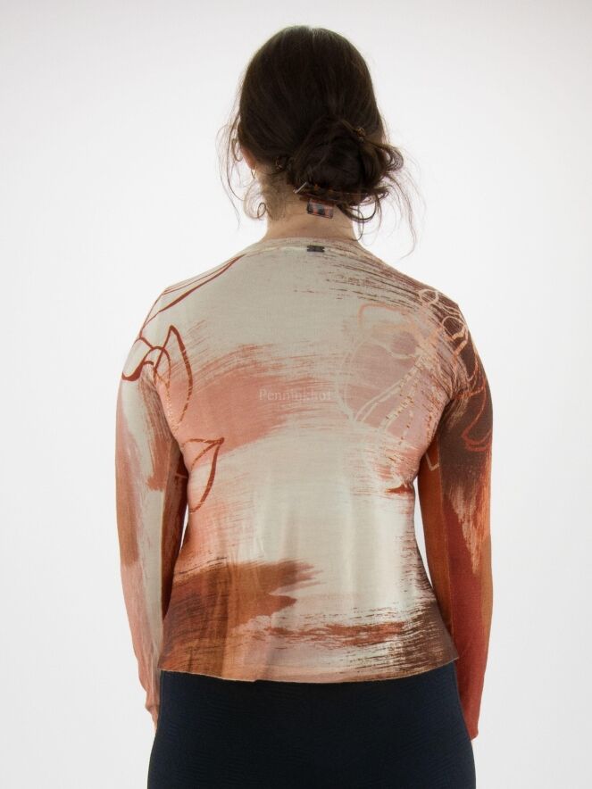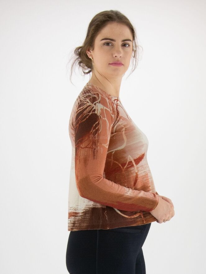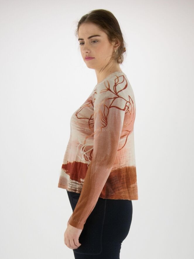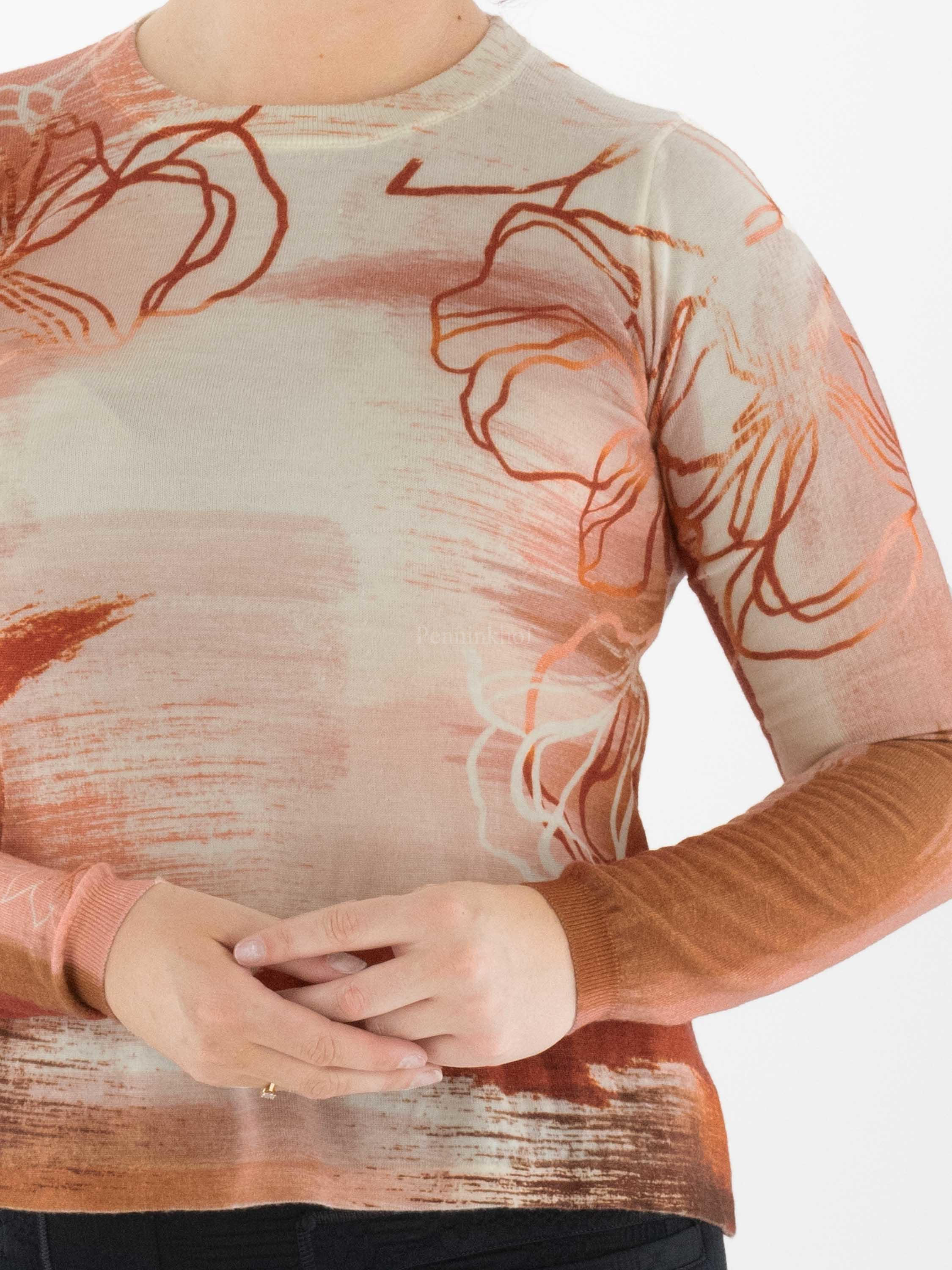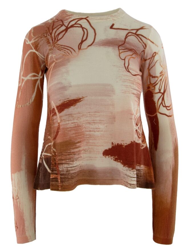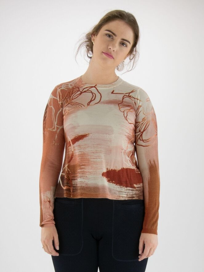 Een pullover van High in een grafische print met de kleuren roest (oranje) en roomwit. De pullover heeft een ronde hals en lange mouwen. Deze pullover mag op de hand worden gewassen.
