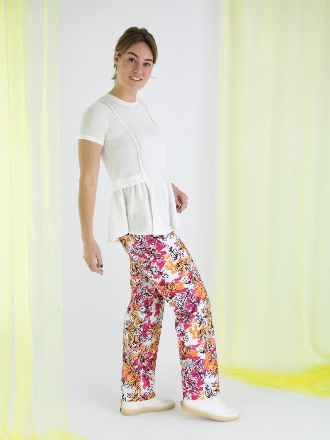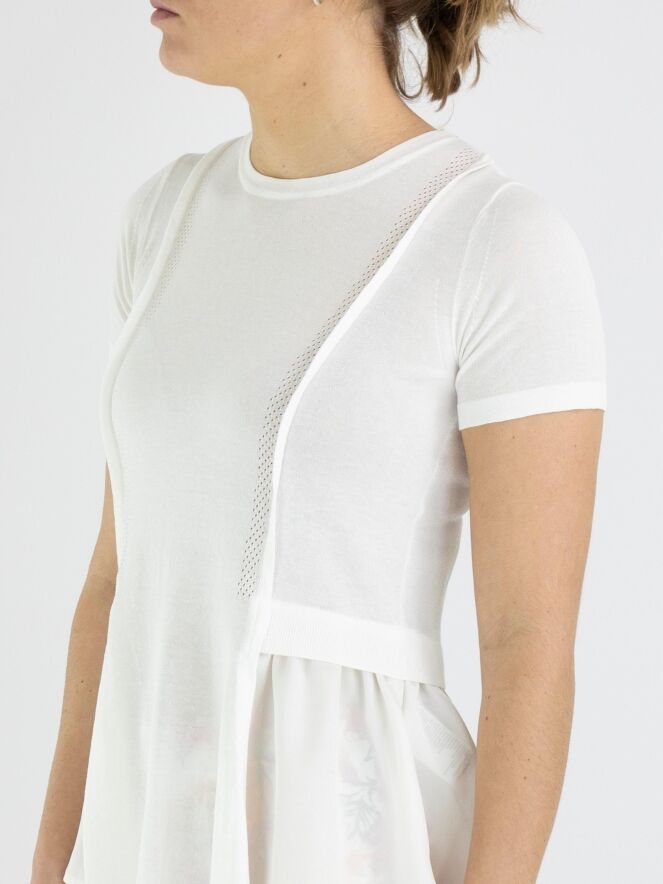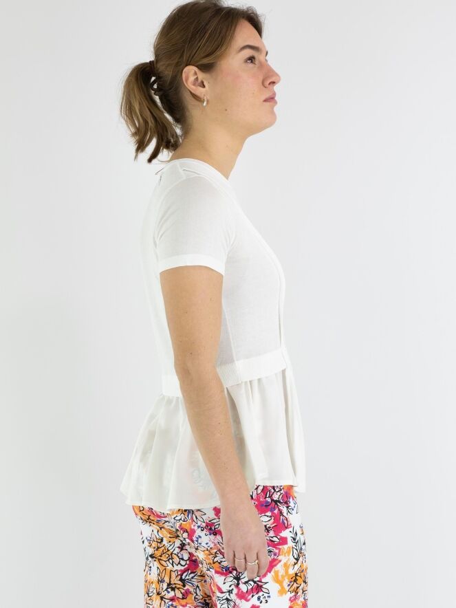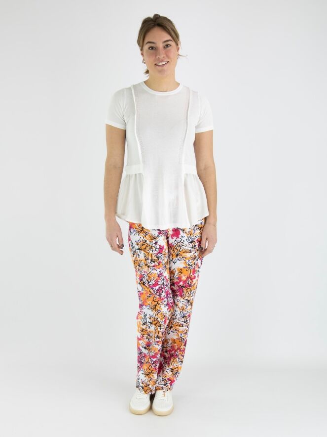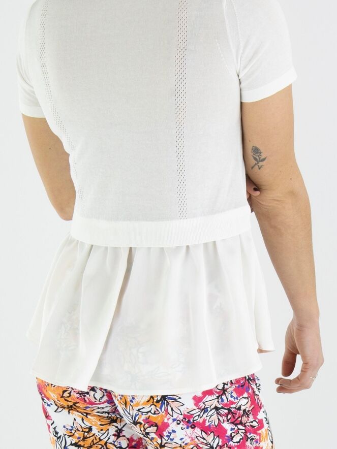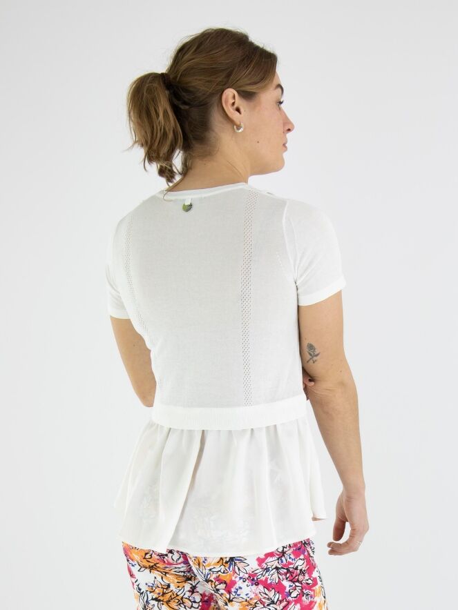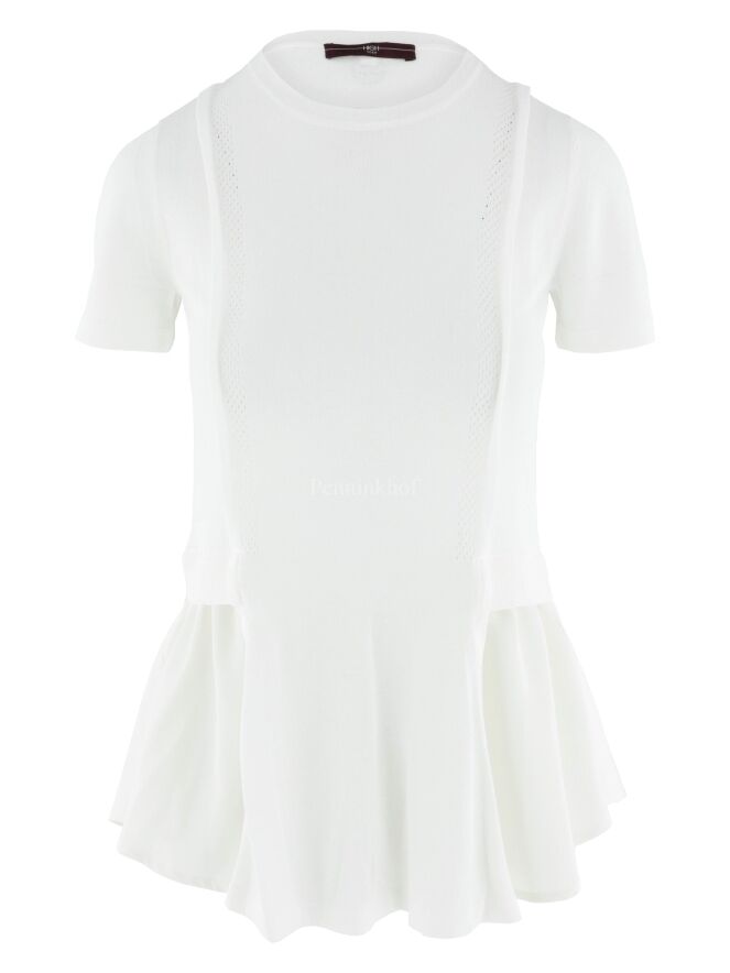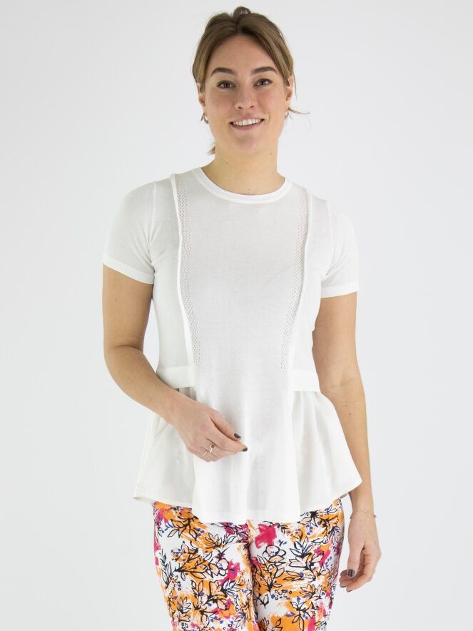 Een fijn geweven shirt van High in de kleur roomwit. Links en rechts van het midden is een ajour bies met aan de voorkant naast de ajourbies een fijn geribbelde tricot bies. Vanaf de taille is er vanuit de zijkanten naar de achterkant een mat satijnen stof. Het shirt heeft korte mouwen en mag op de hand worden gewassen.