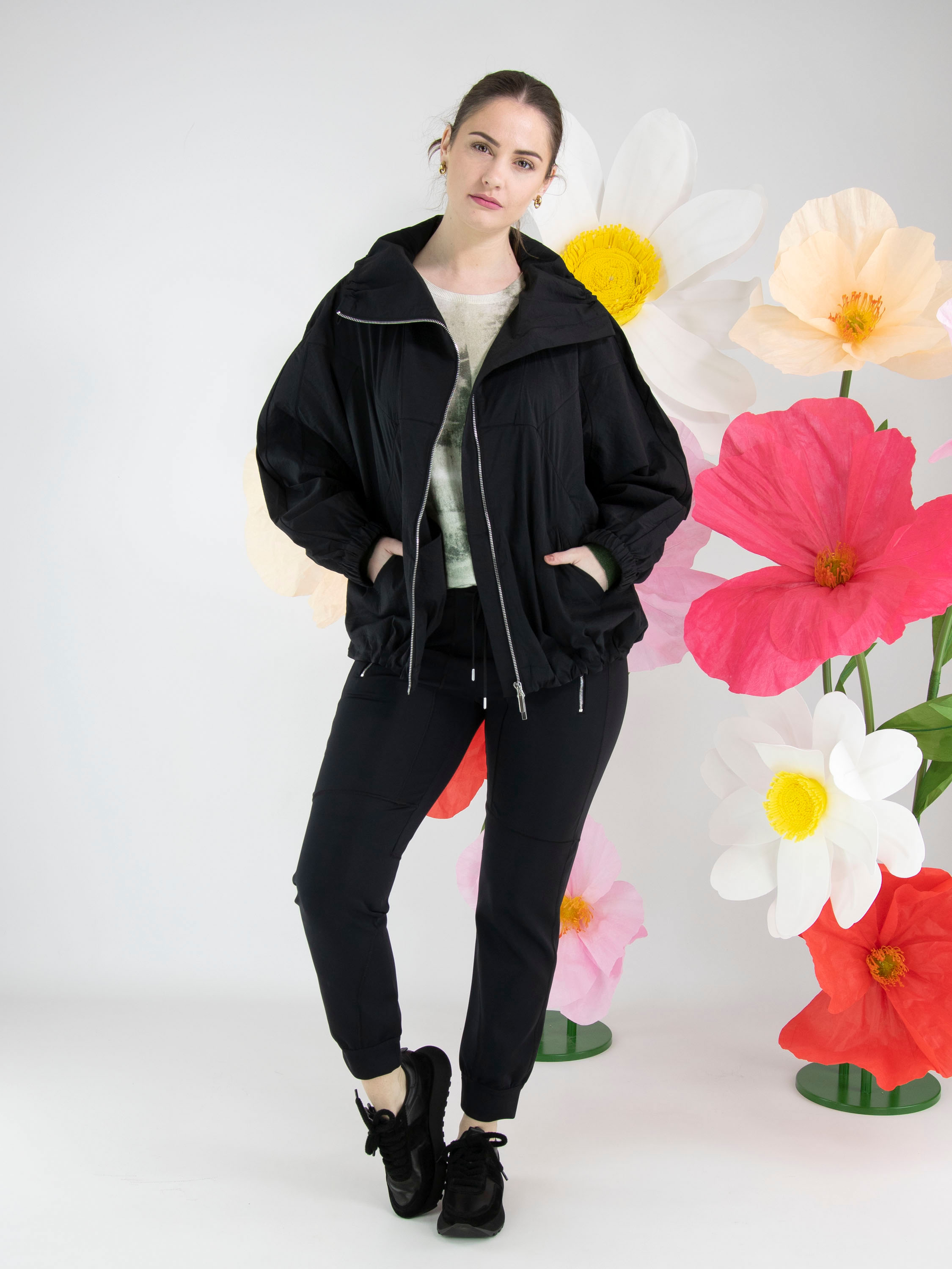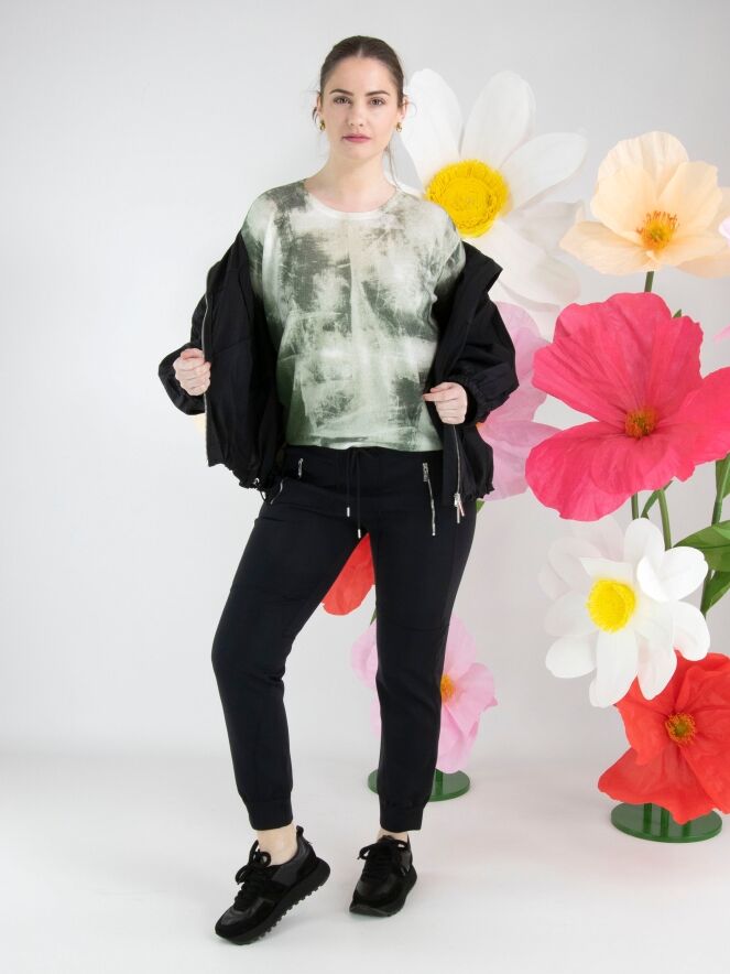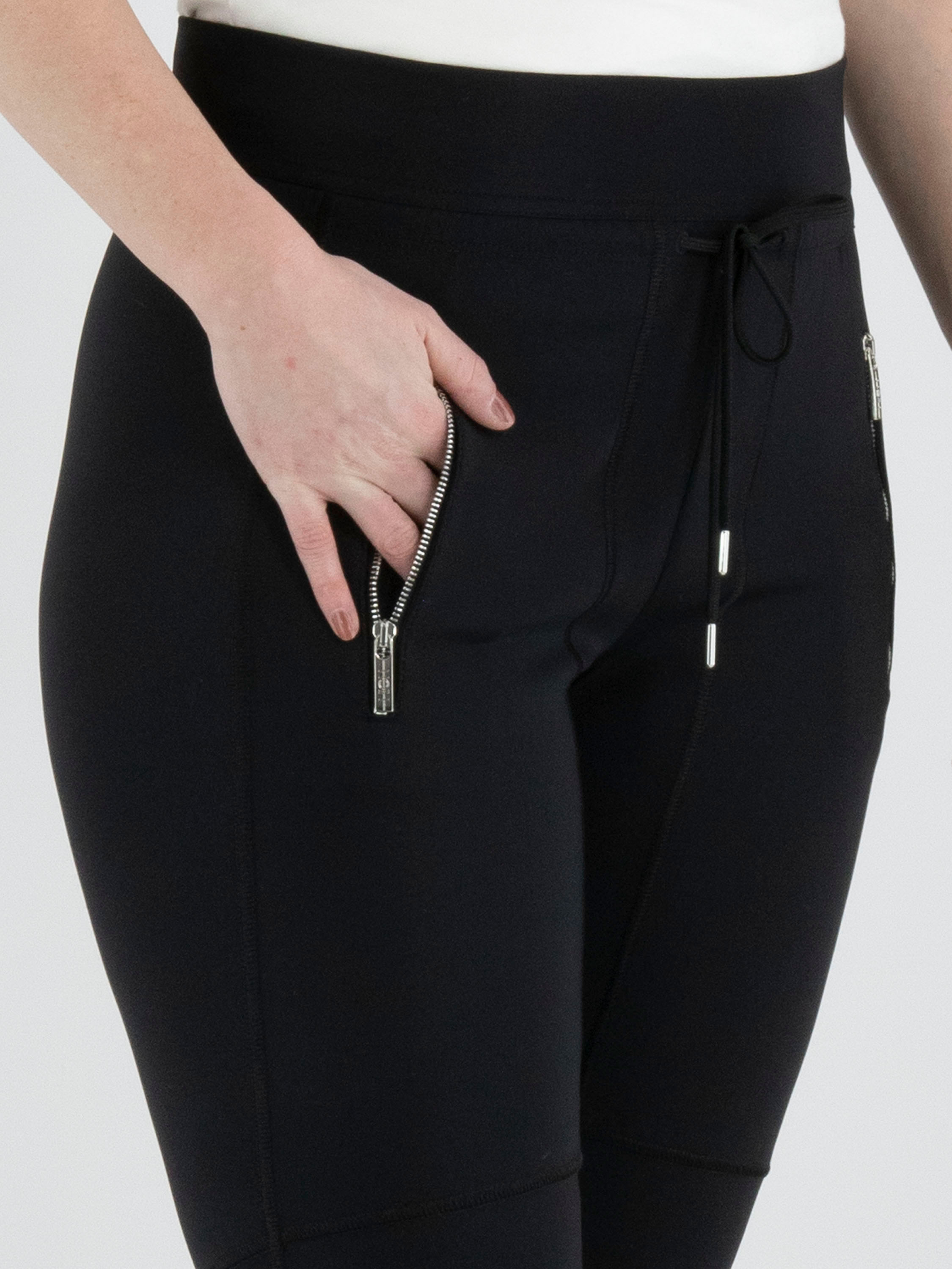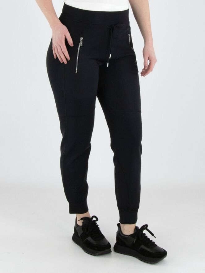 Een joggingbroek van High in de kleur zwart. In de taille en aan de onderkant van de pijpen is een gladde elastische band. Net onder de tailleband loopt een koord in een tunnelverwerking. De diepe steekzakken zijn voorzien van een ritssluiting. Op het bovenbeen, bij de knieën en langs de zijkanten van het onderbeen zijn meerdere decoratieve stiknaden aangebracht. Deze broek mag op 30 graden worden gewassen.