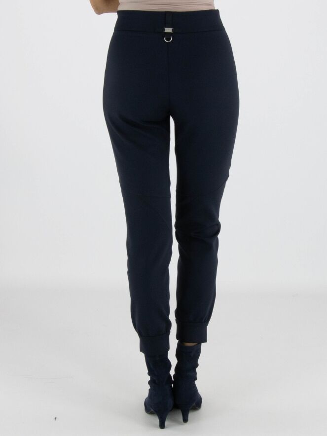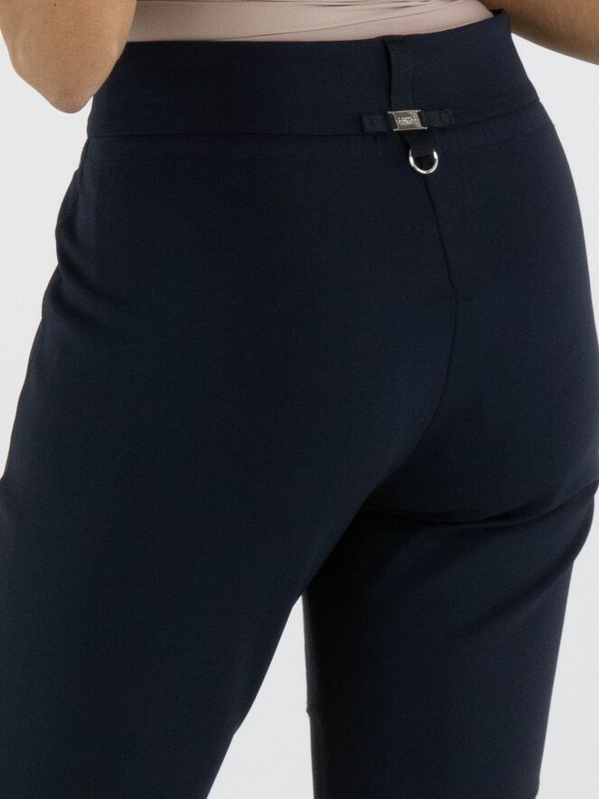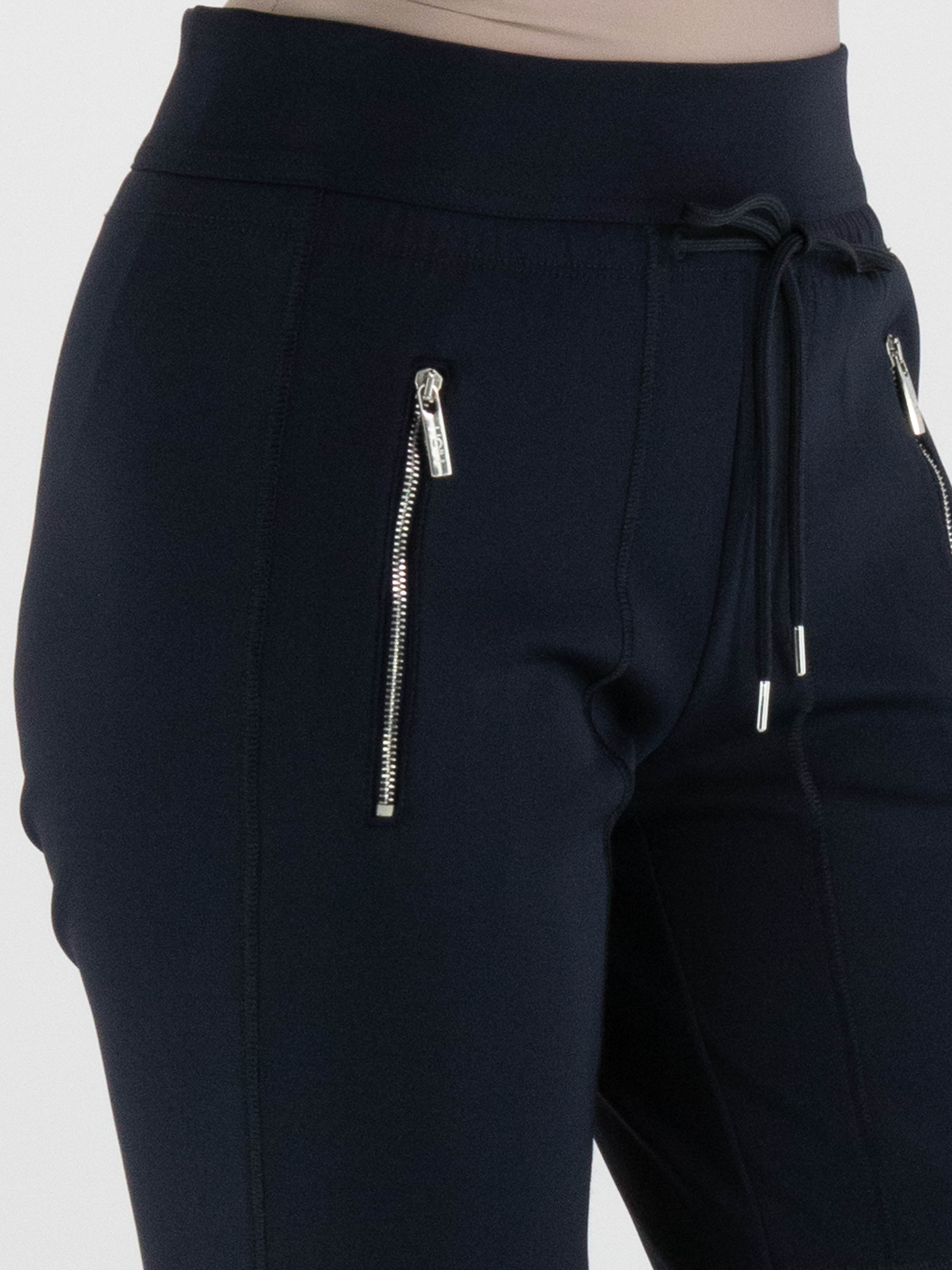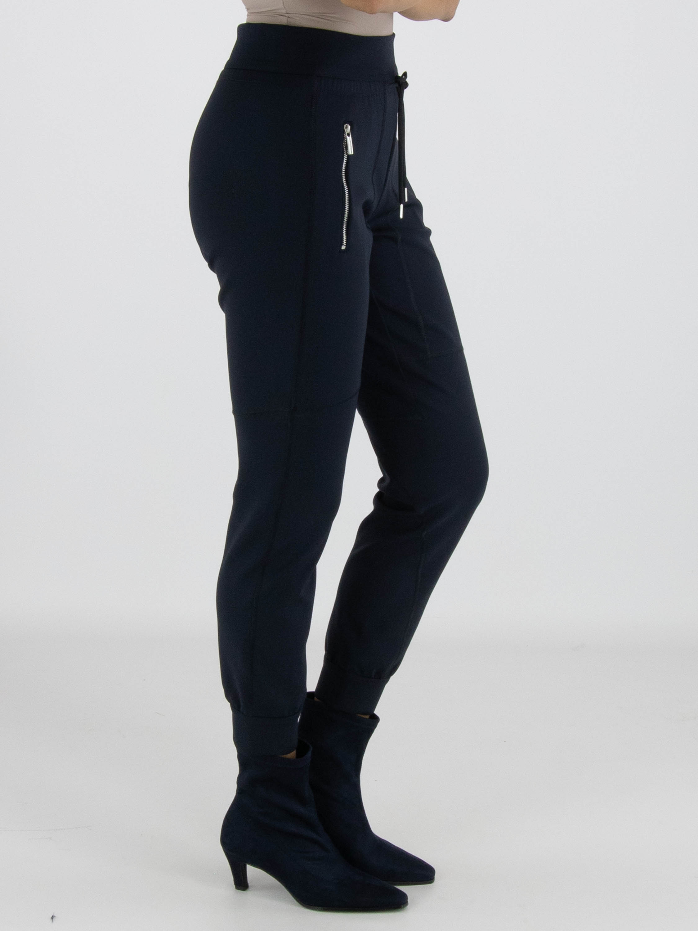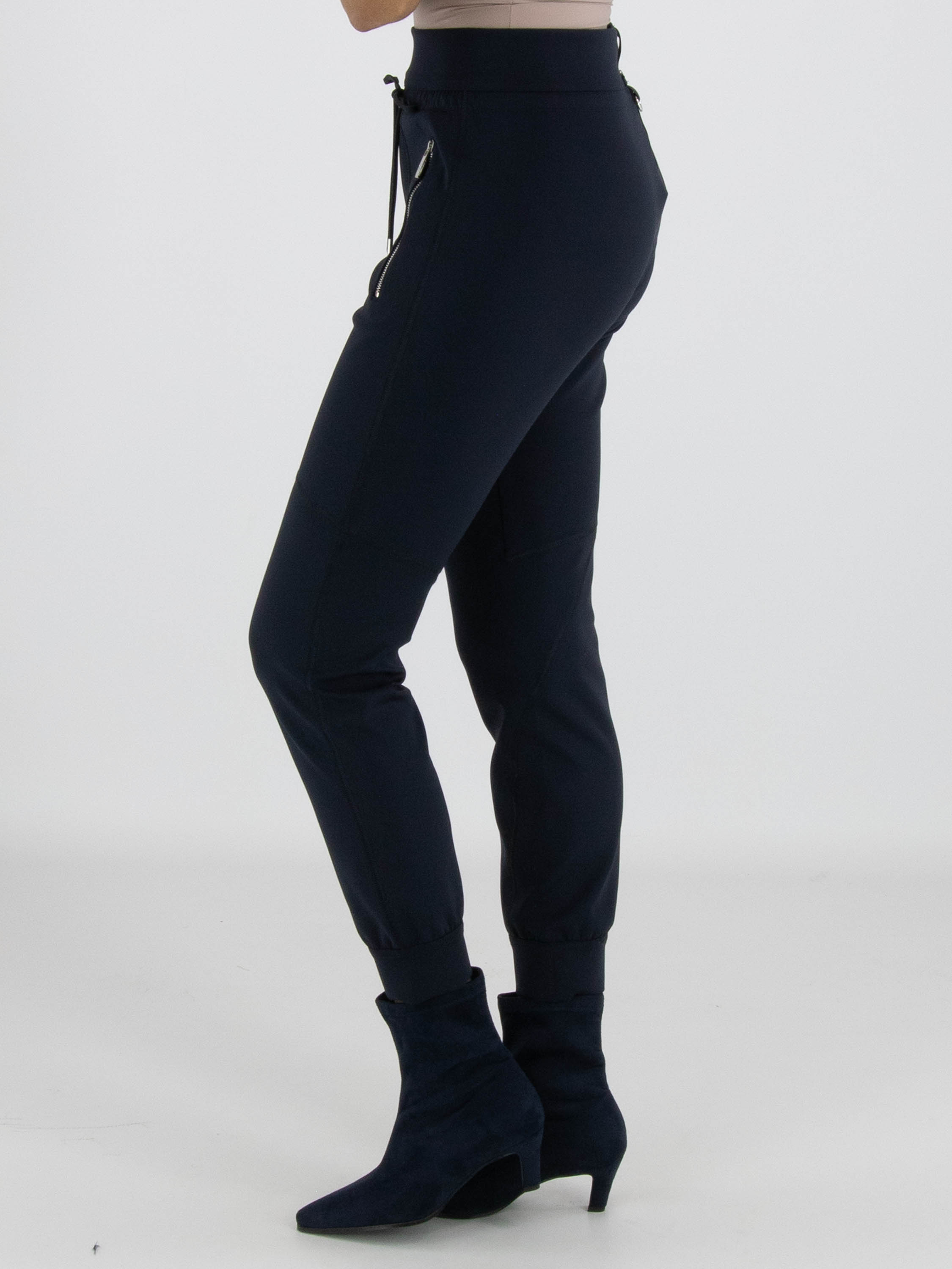 Een joggingbroek van High in de kleur marineblauw. In de taille en aan de onderkant van de pijpen is een gladde elastische band. Net onder de tailleband loopt een koord in een tunnelverwerking. De diepe steekzakken zijn voorzien van een ritssluiting. Op het bovenbeen, bij de knieën en langs de zijkanten van het onderbeen zijn meerdere decoratieve stiknaden aangebracht. Deze broek mag op 30 graden worden gewassen.