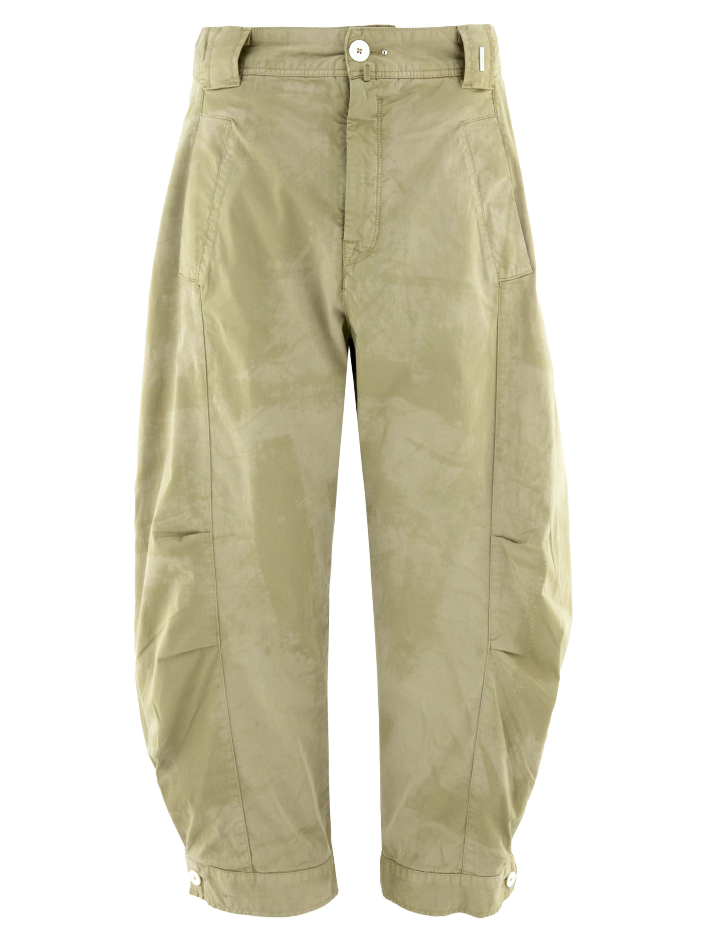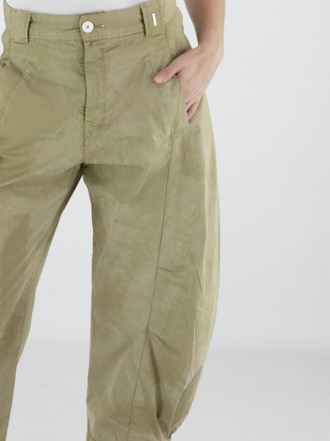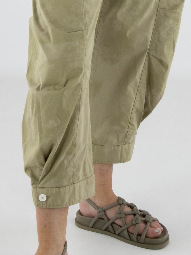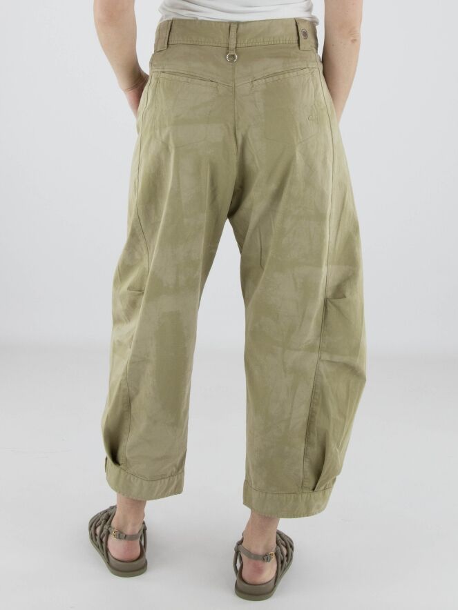Broek van High in een ton-sur-ton batikachtige print in meerdere olijfgroene tinten. Ter hoogte van de knieën zijn korte coupenaden aangebracht die het silhouet subtiel modelleren. De pijpen lopen naar de onderzijde licht taps toe en zijn afgewerkt met een decoratieve witte knoop in de zoomrand. De broek is voorzien van steekzakken en kan op 30 graden worden gewassen.