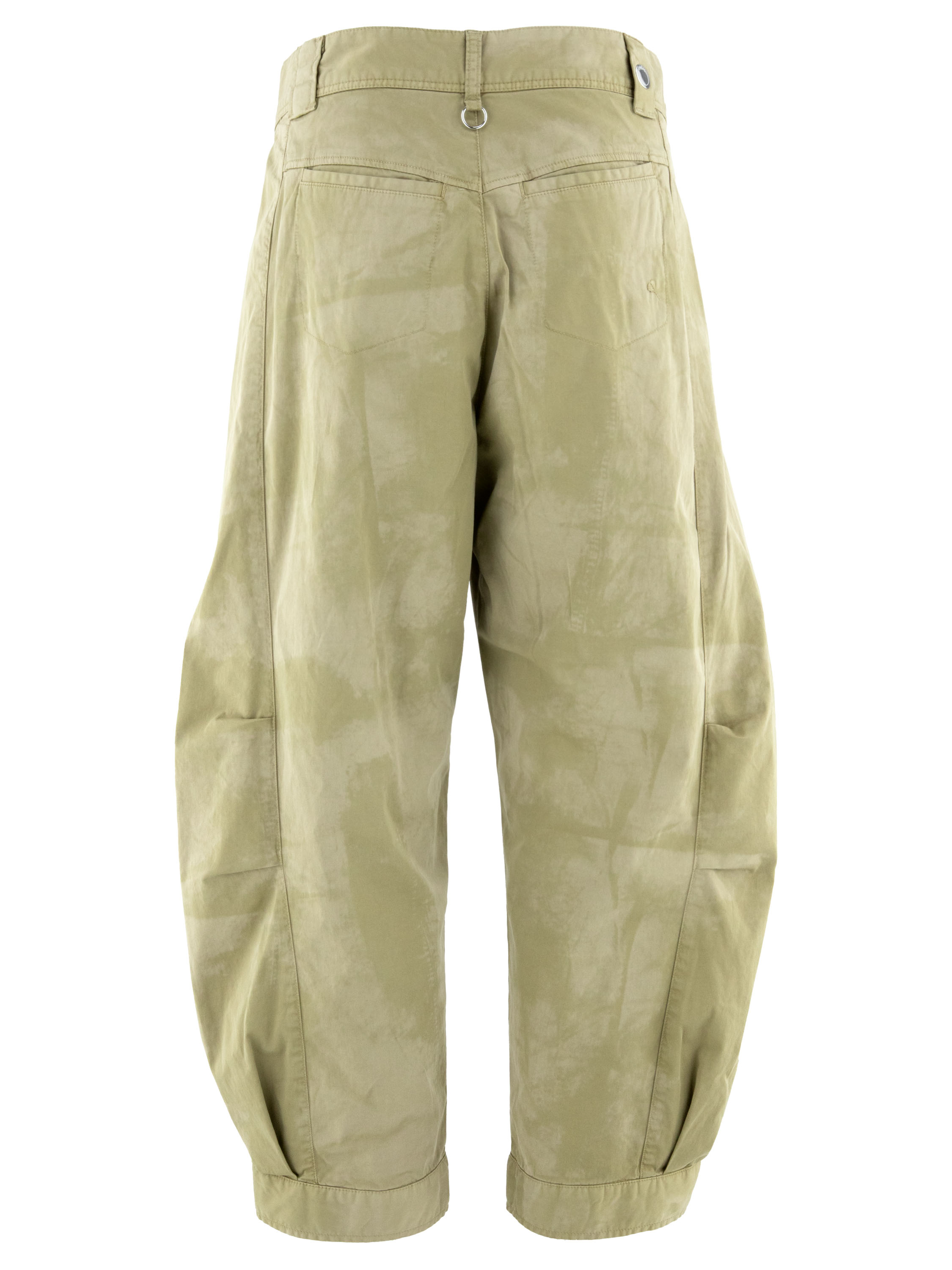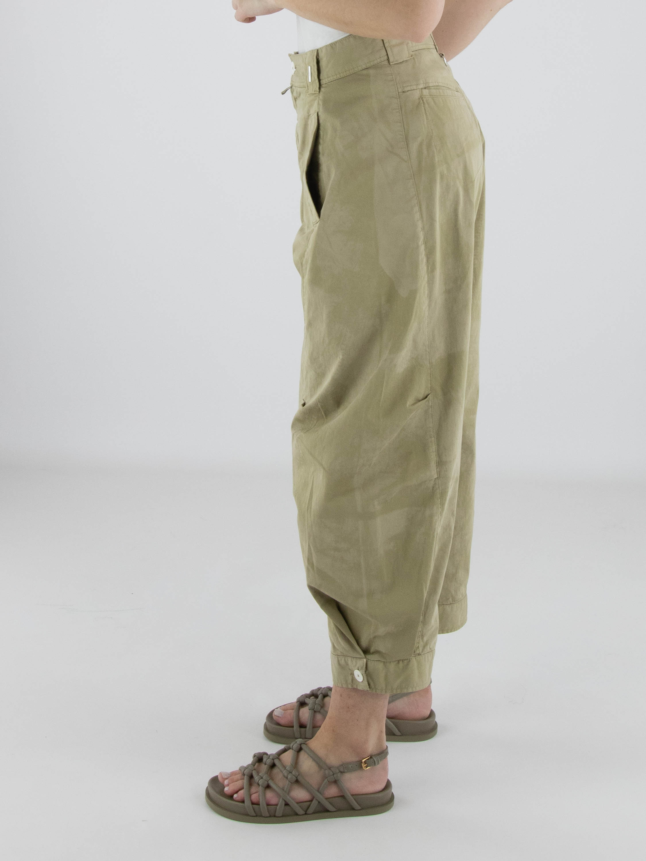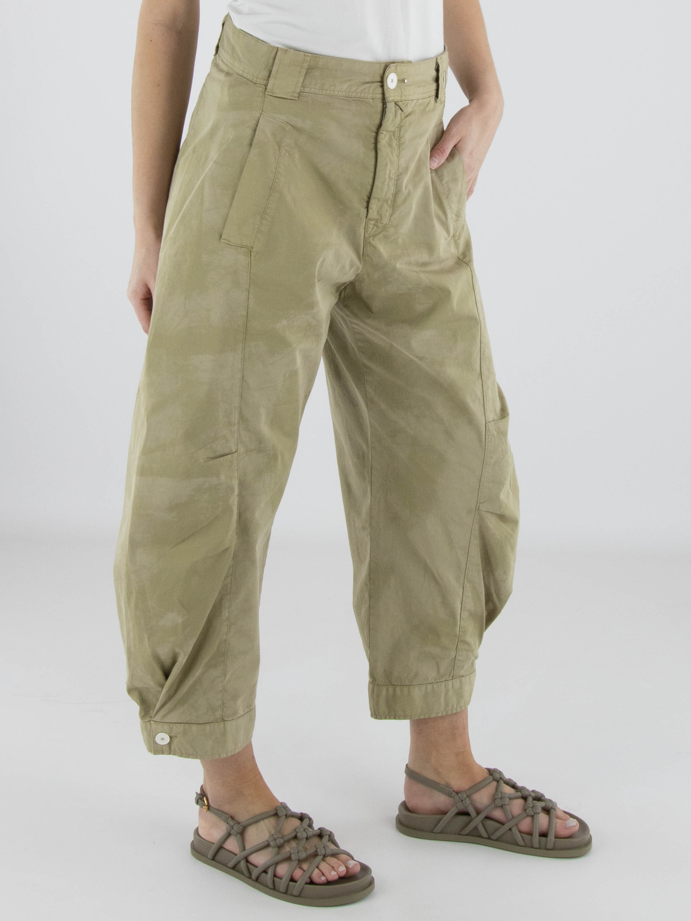 Broek van High in een ton-sur-ton batikachtige print in meerdere olijfgroene tinten. Ter hoogte van de knieën zijn korte coupenaden aangebracht die het silhouet subtiel modelleren. De pijpen lopen naar de onderzijde licht taps toe en zijn afgewerkt met een decoratieve witte knoop in de zoomrand. De broek is voorzien van steekzakken en kan op 30 graden worden gewassen.