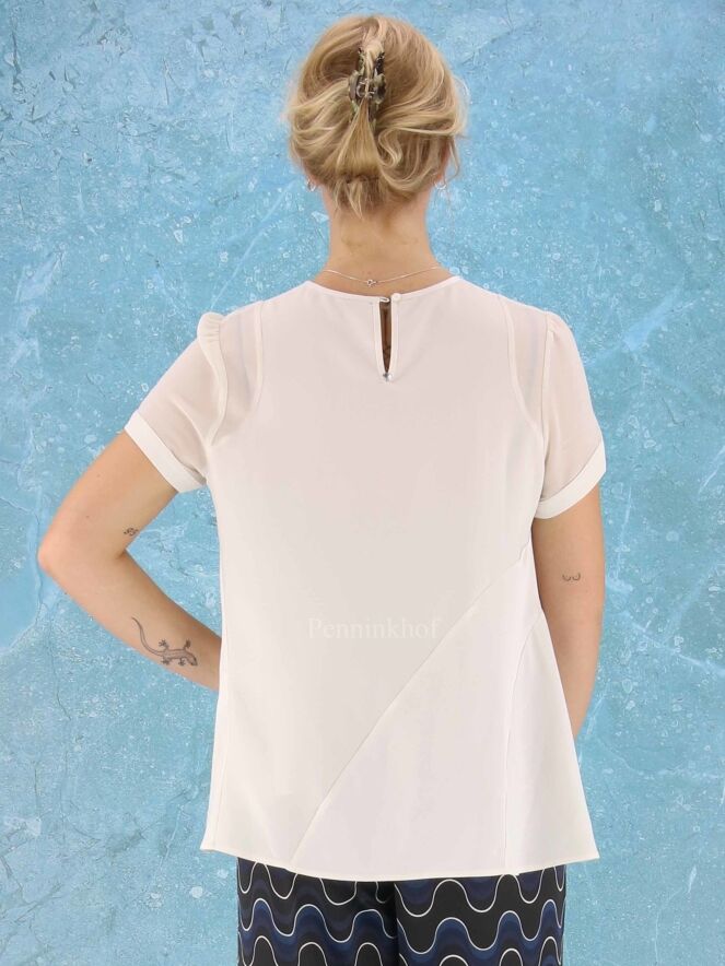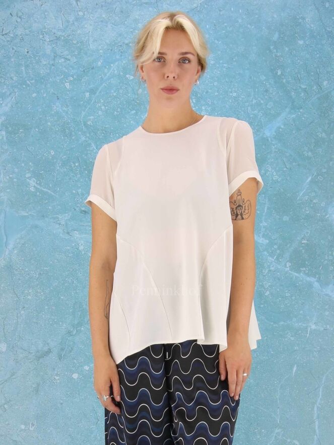 Een shirt van High in 2 kleuren roomwit in een mat satijnen stof. De korte mouwen zijn licht transparant. Het shirt heeft een brede A - Lijn en mag op de hand worden gewassen.