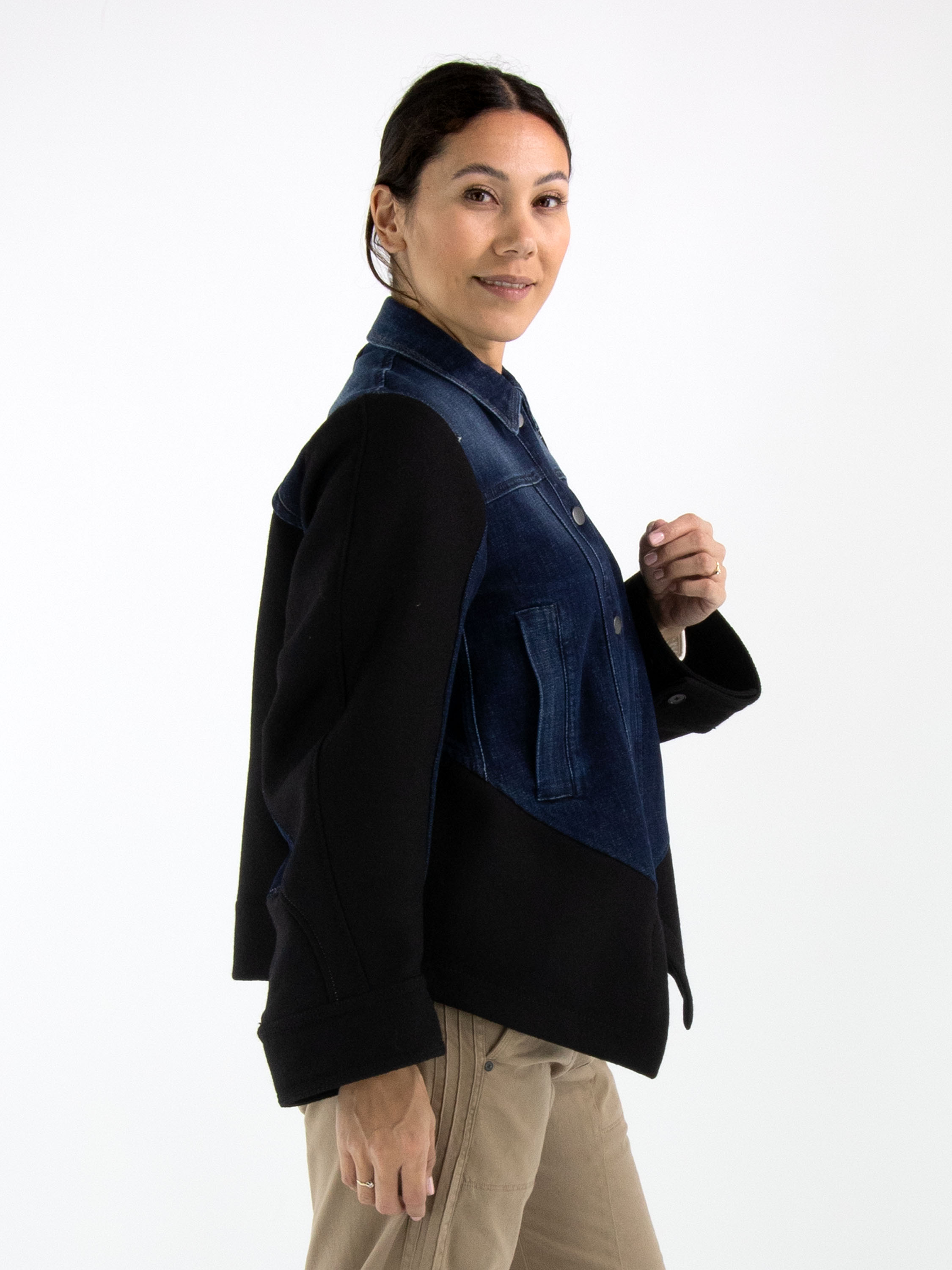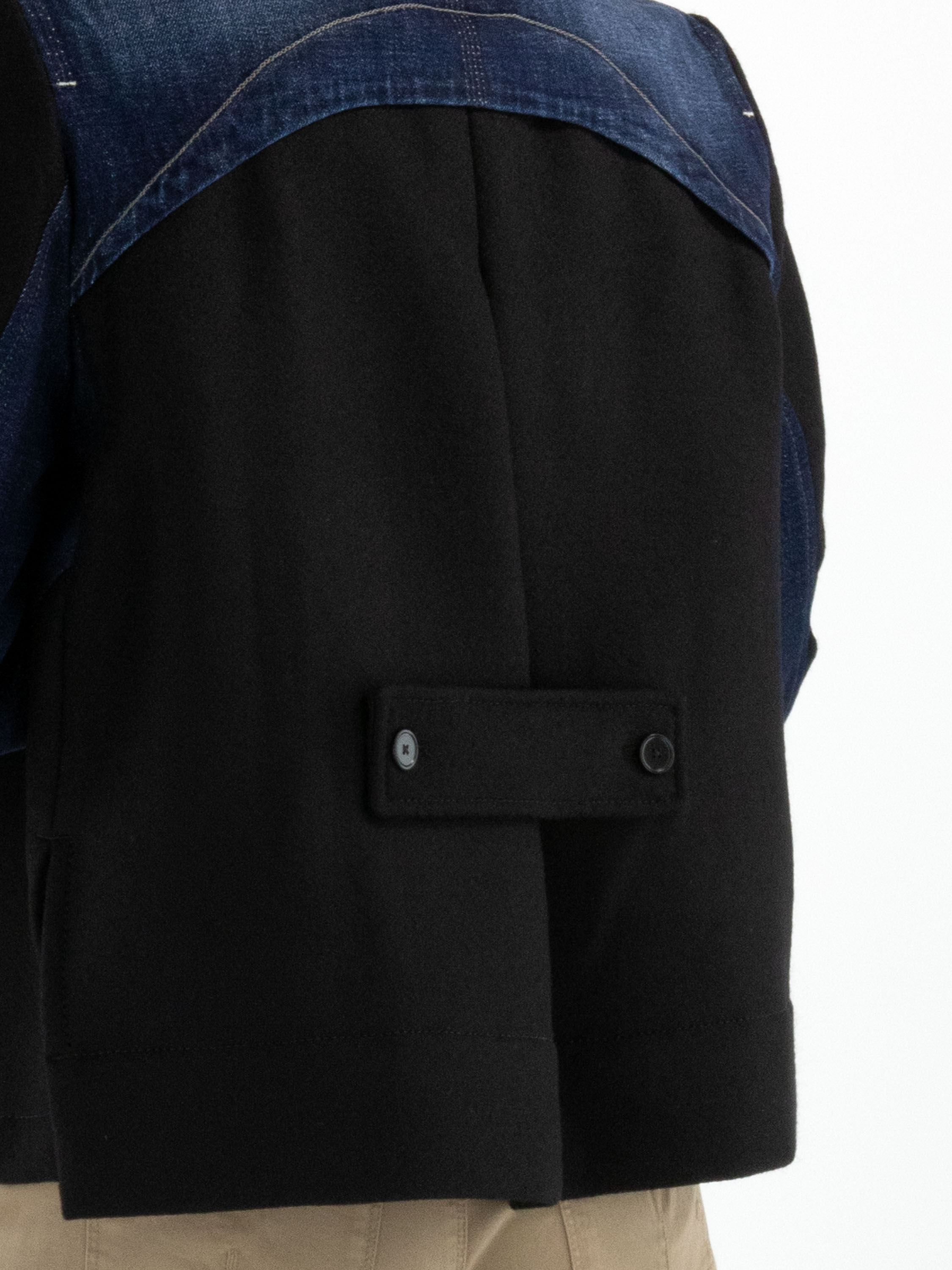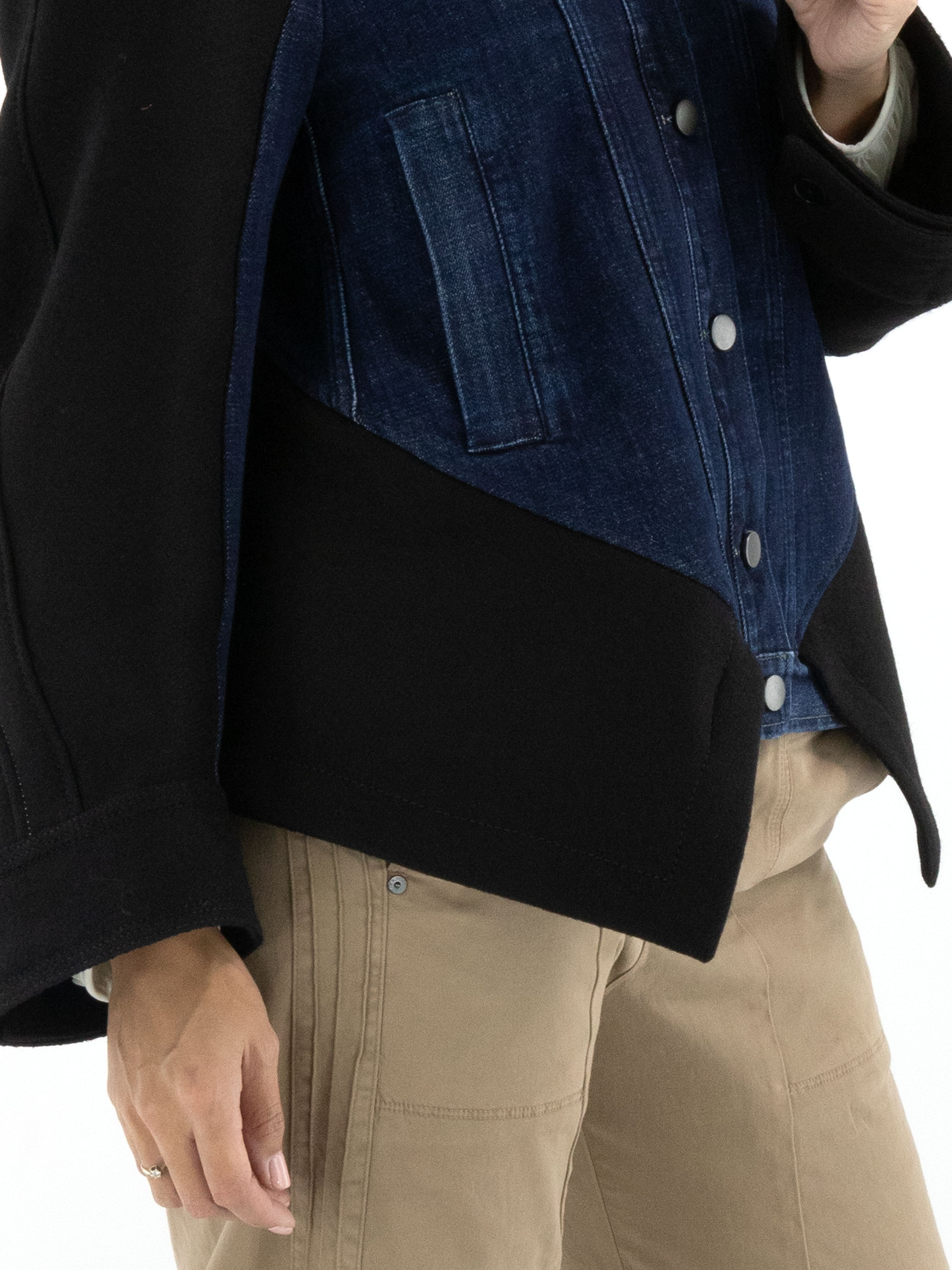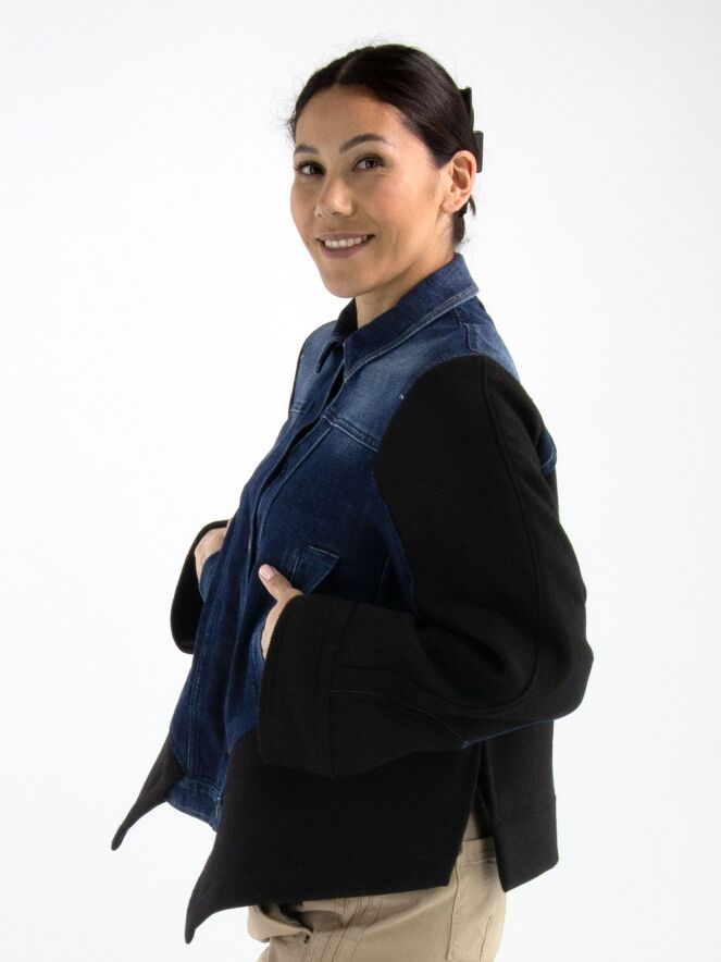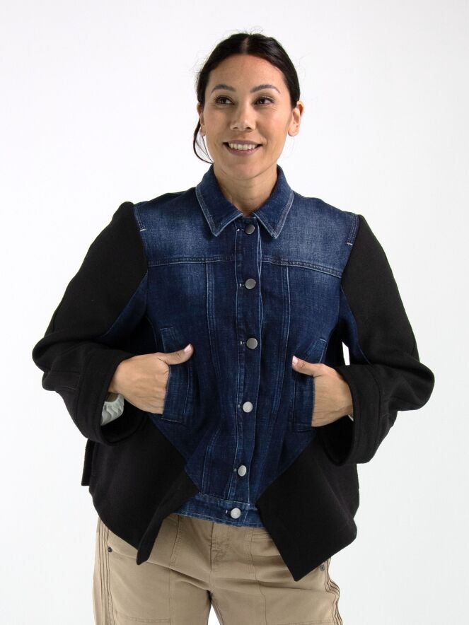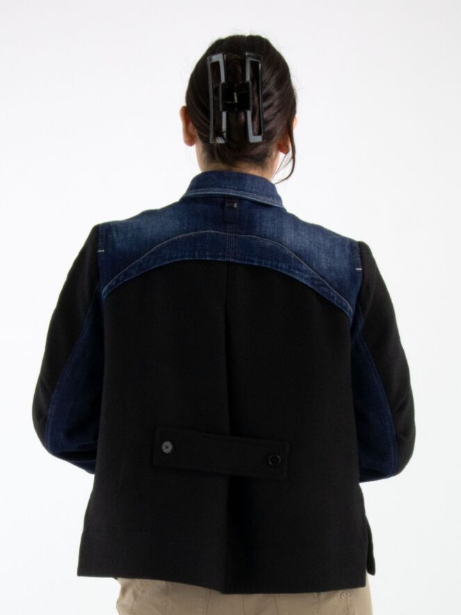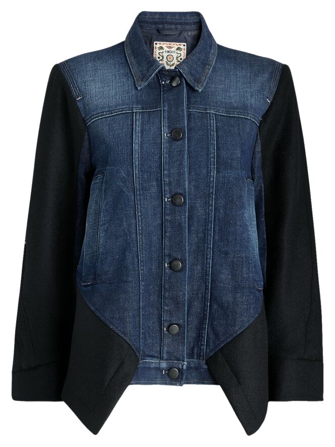 Een jeans blazer van High in een dark denim kleur, gecombineerd met luxe gekookte wol aan de achterkant, onderzijde en deels bij de mouwen. De blazer heeft een knoopsluiting en steekzakken op taillehoogte. Deze blazer mag niet worden gewassen.