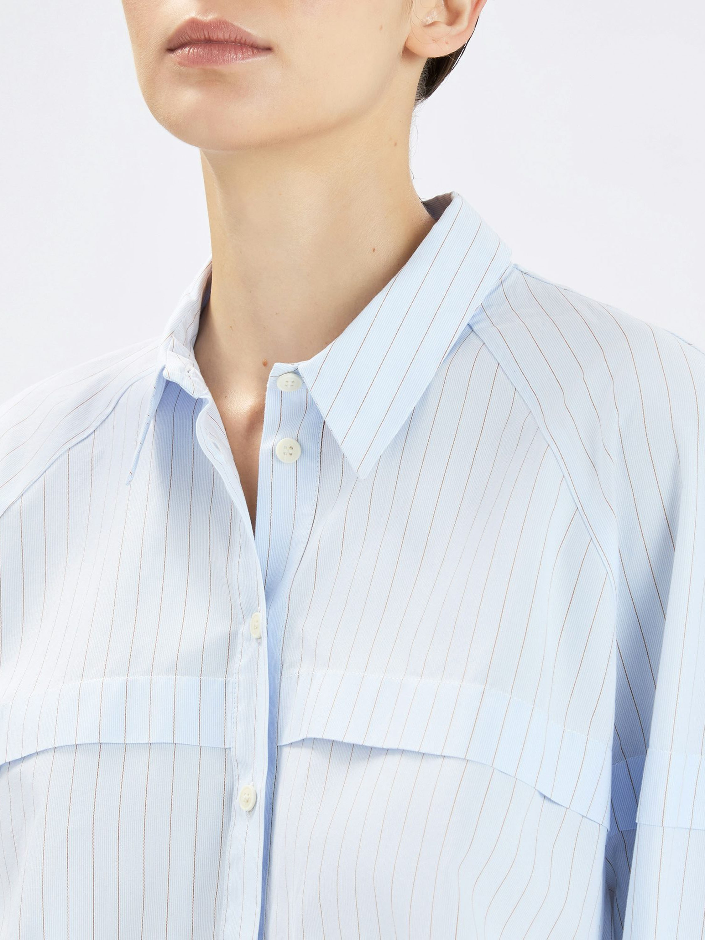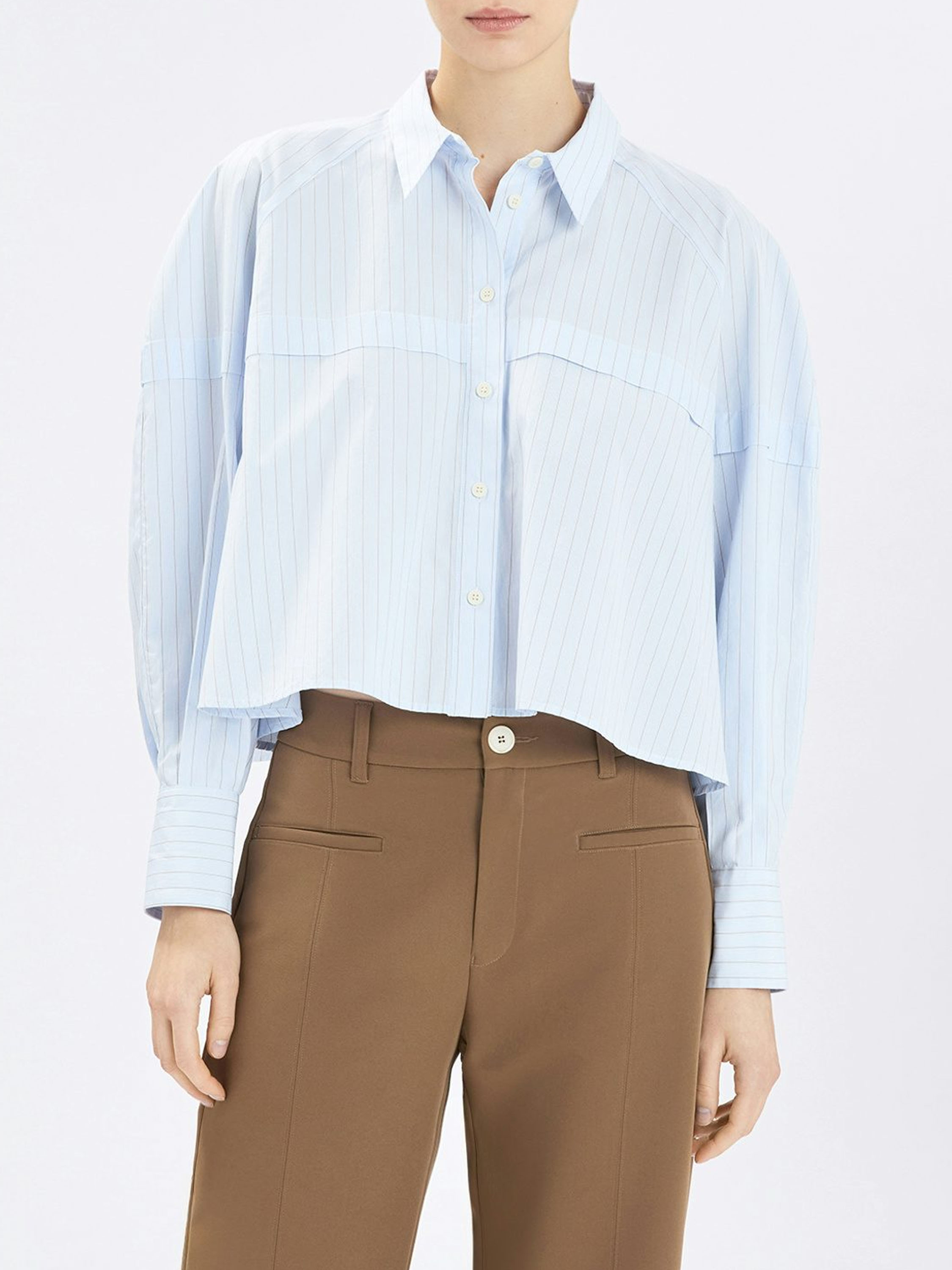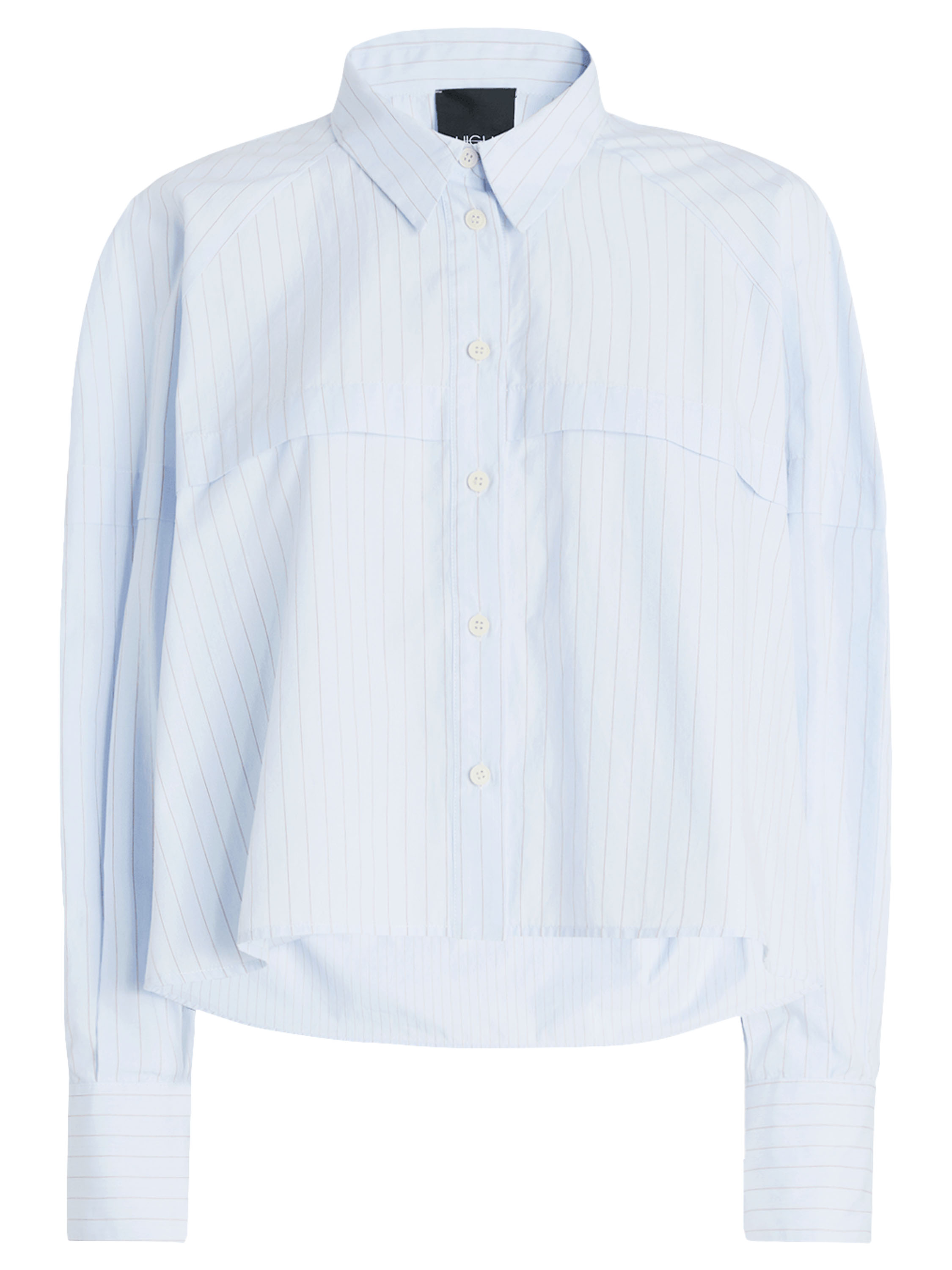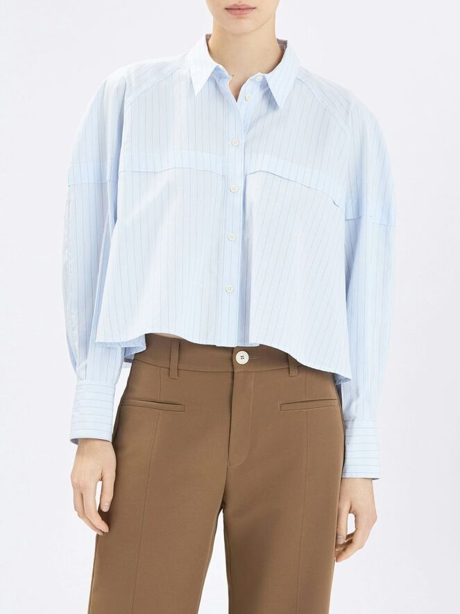Korte, wijde blouse van High in een verfijnd krijtstreeppatroon in lichtblauw met cognac. Net boven de buste loopt een stiknaad met een overslagdetail, dat via de mouwen doorloopt naar de achterzijde en zo een subtiel architectonisch effect creëert. Deze exclusieve designerblouse kan op 30 graden worden gewassen.