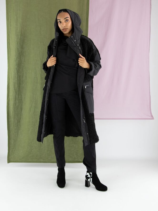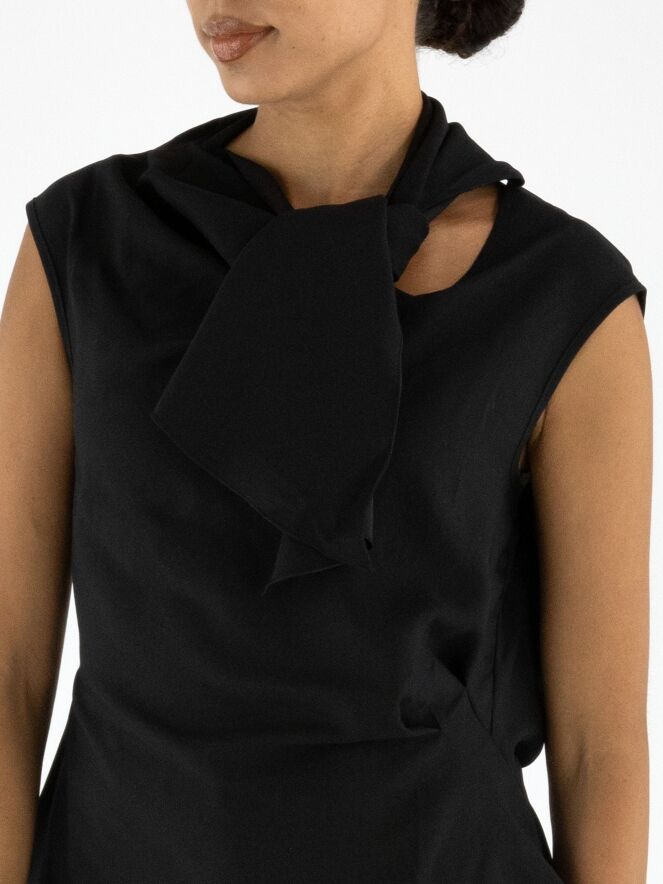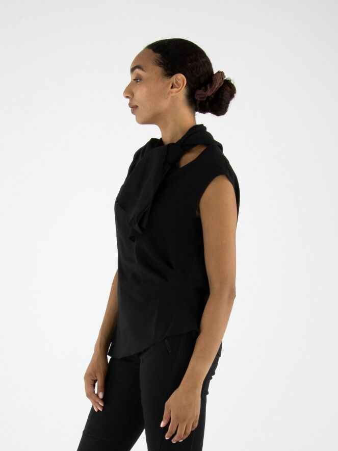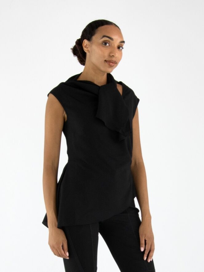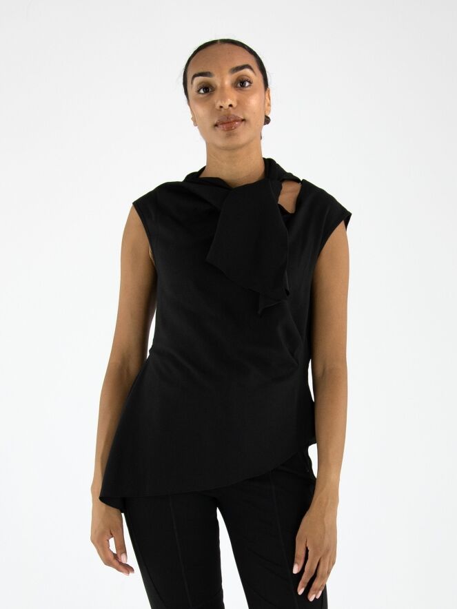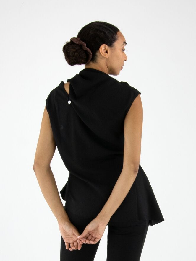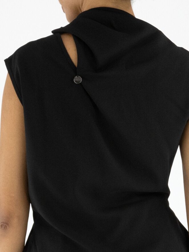 Een top van High in de kleur zwart. Zowel aan de voor- als achterkant is een dubbele stof verwerkt die vanuit de rechter schouder naar het midden loopt, waardoor de matte satijnen achterkant deels zichtbaar wordt langs de V-hals. Aan de linkerkant zit ter hoogte van de taille een ophaal die een plooi-effect creëert. Deze top mag op 30 graden worden gewassen.