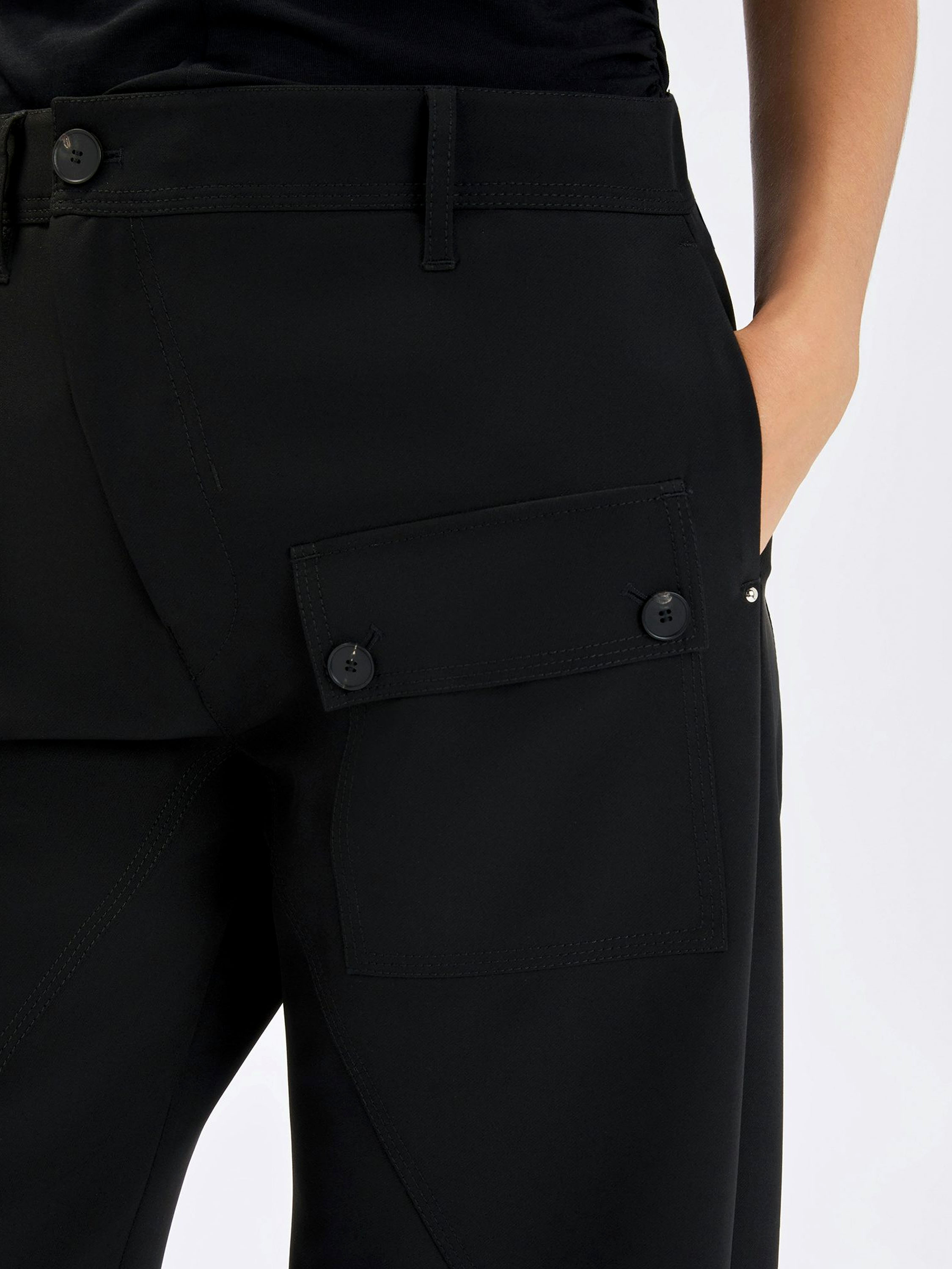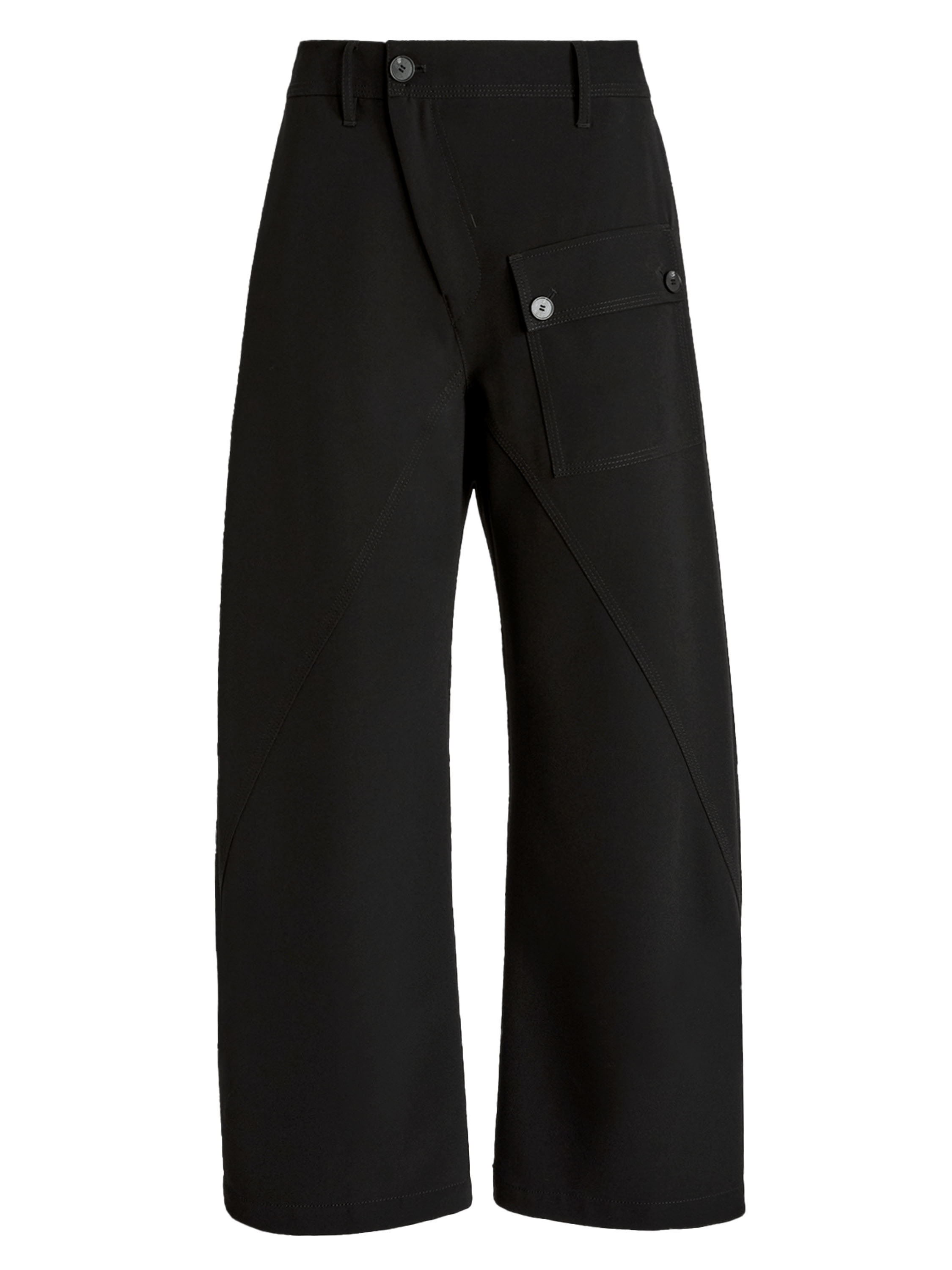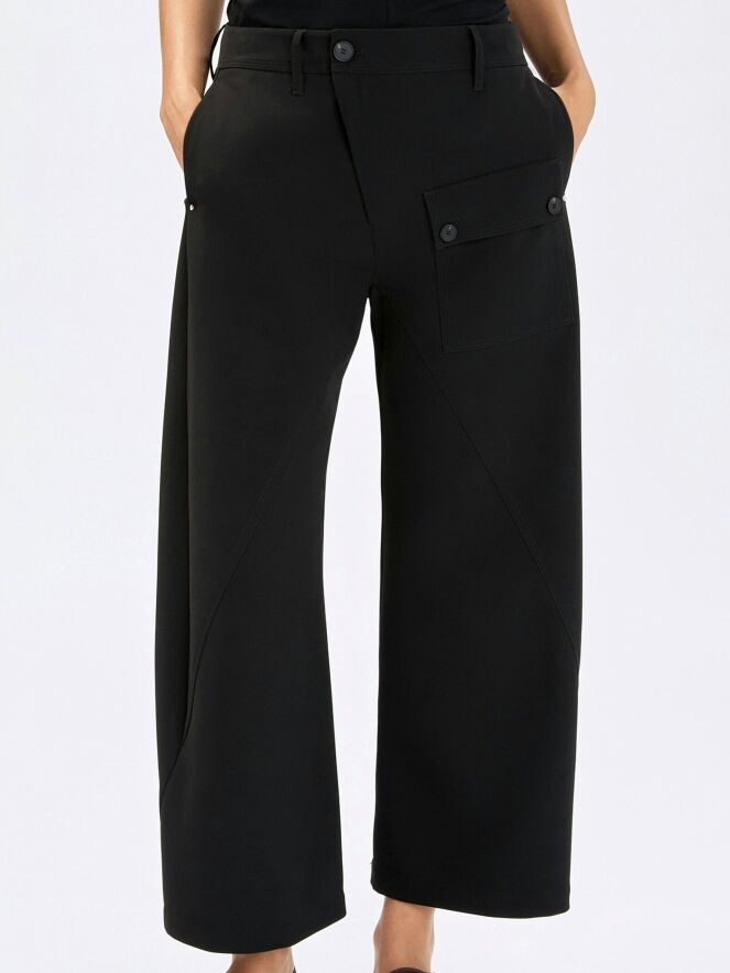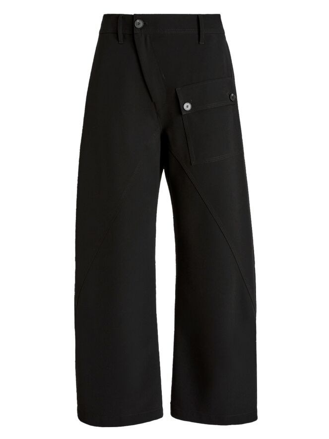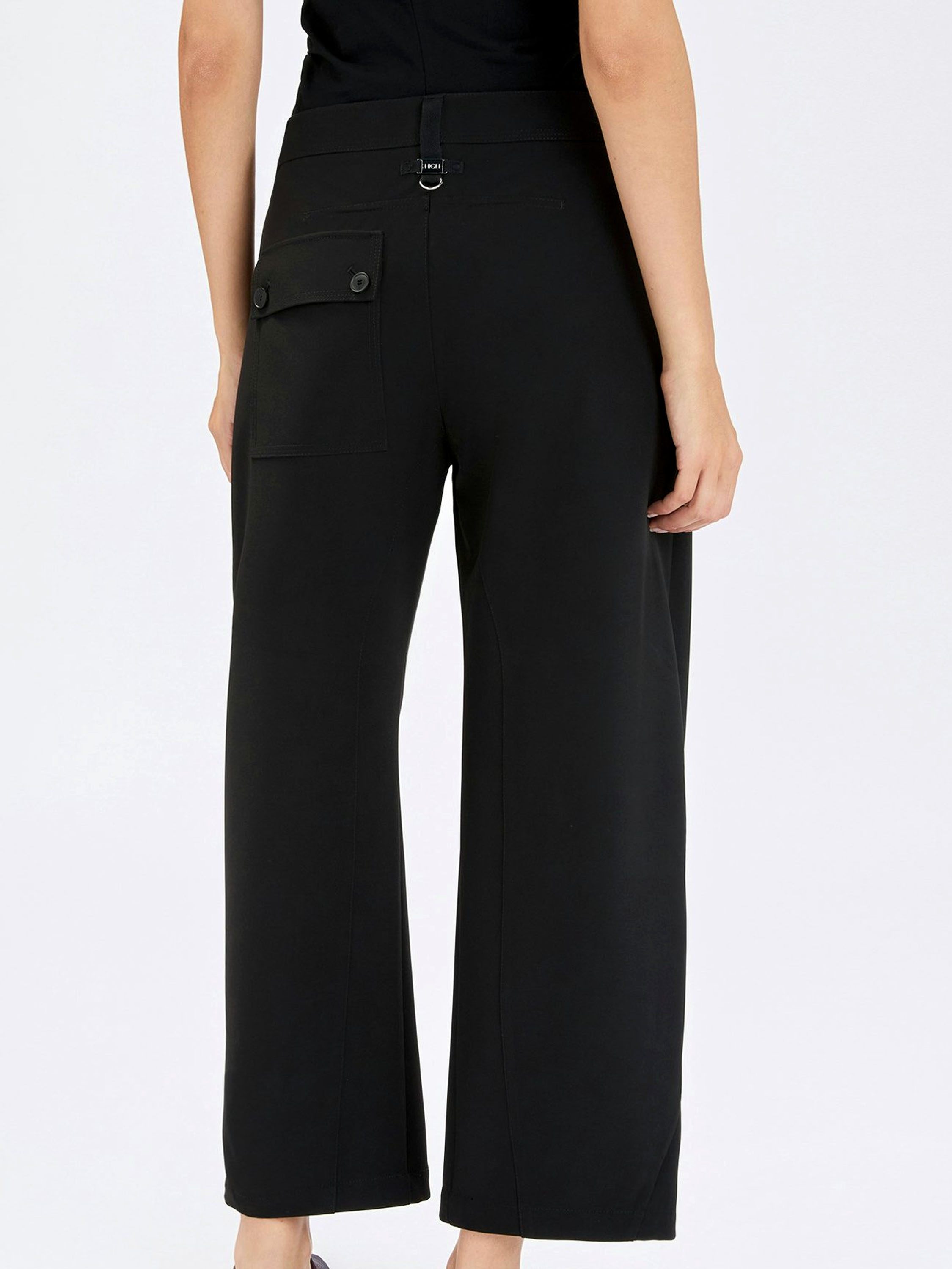 Een broek van High in de kleur zwart. De broek heeft een diagonale sluiting met een rits. Aan de onderkant van de steekzakken is een zilverkleurige stud geplaatst. Op het linker bovenbeen bevindt zich een zak. Aan de voorkant is een decoratieve diagonale stiknaad. Deze broek mag op de hand worden gewassen.