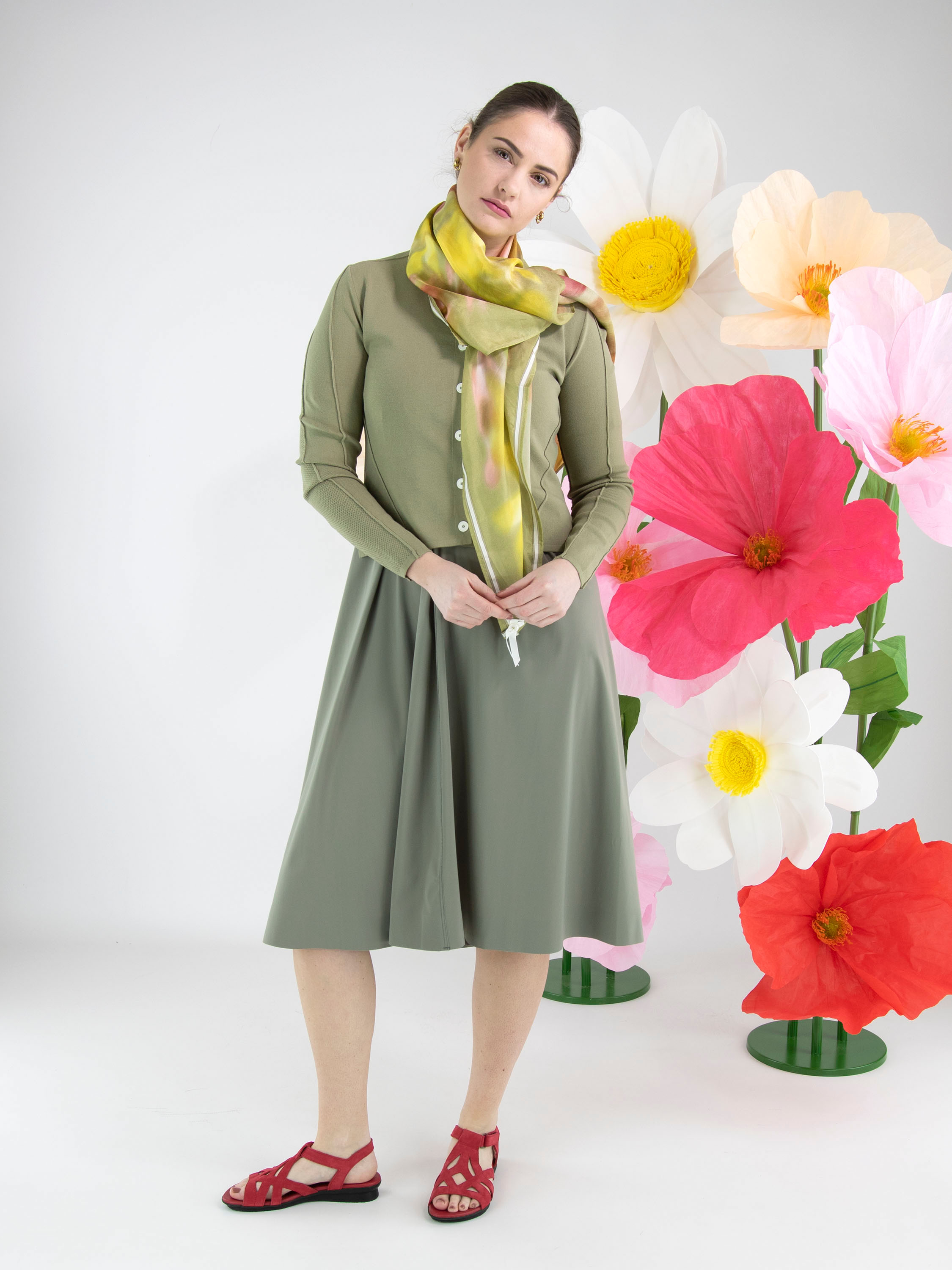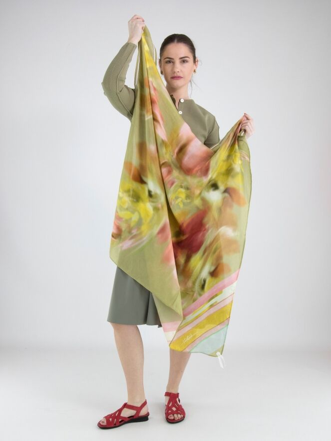 Een luxe, licht transparante shawl van High met een vervaagde bloemenprint in meerdere tinten rood en geel op een olijfgroene achtergrond. Deze shawl mag niet worden gewassen.