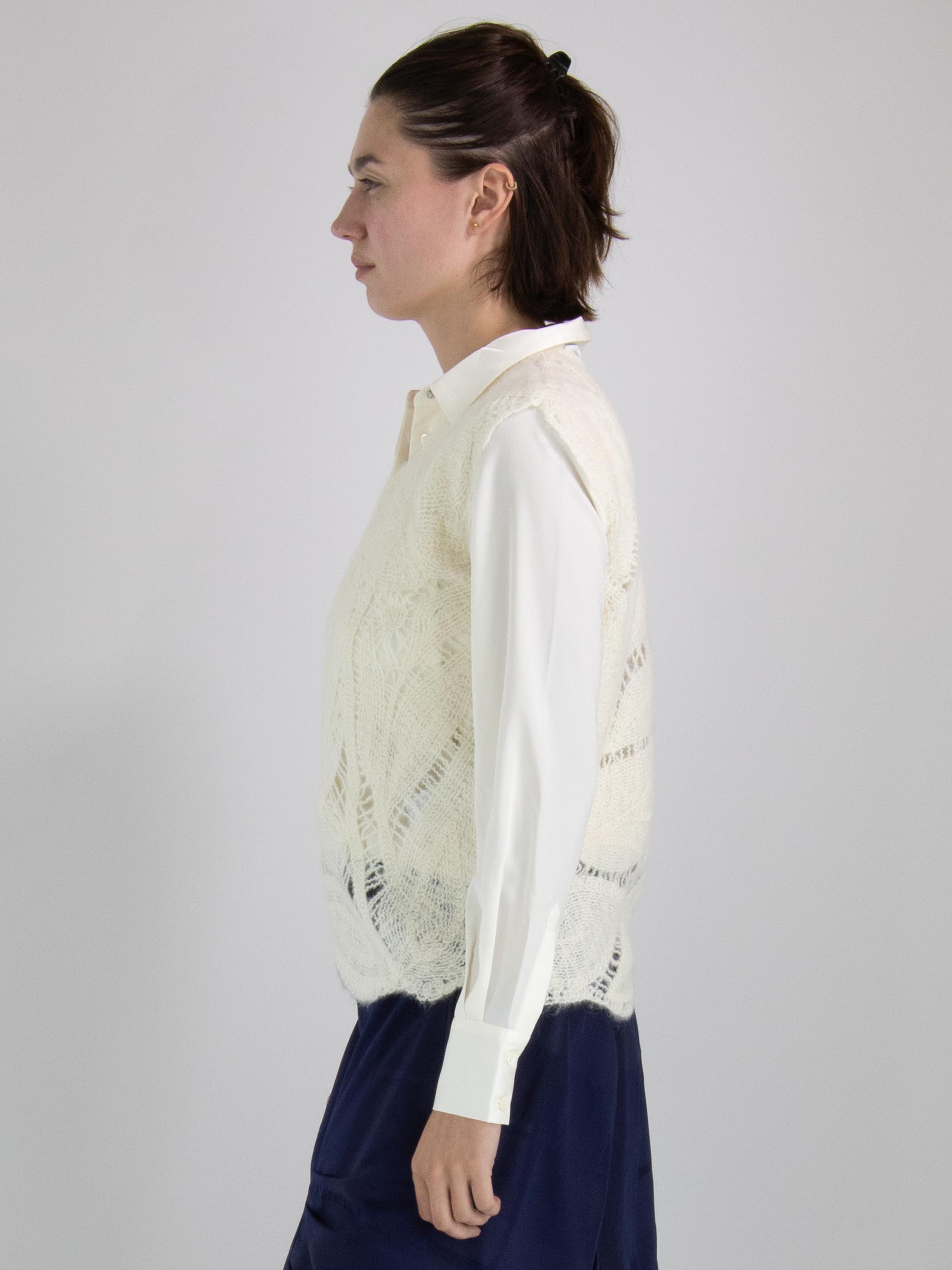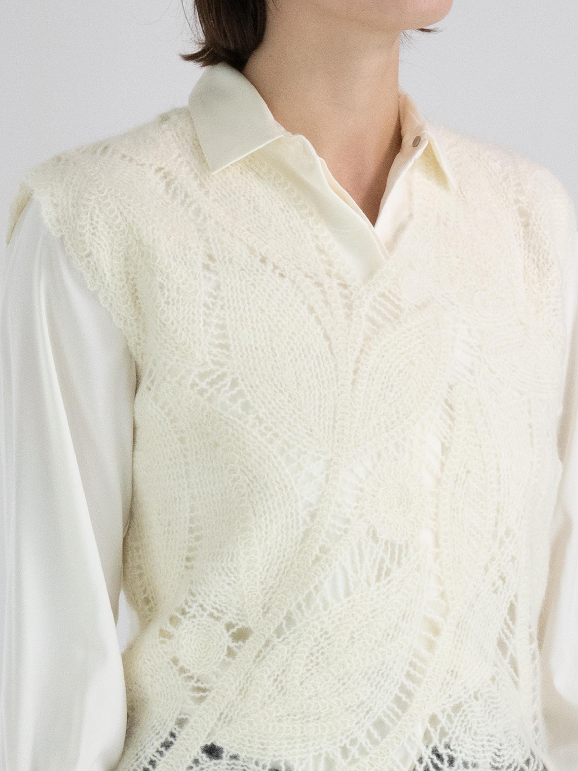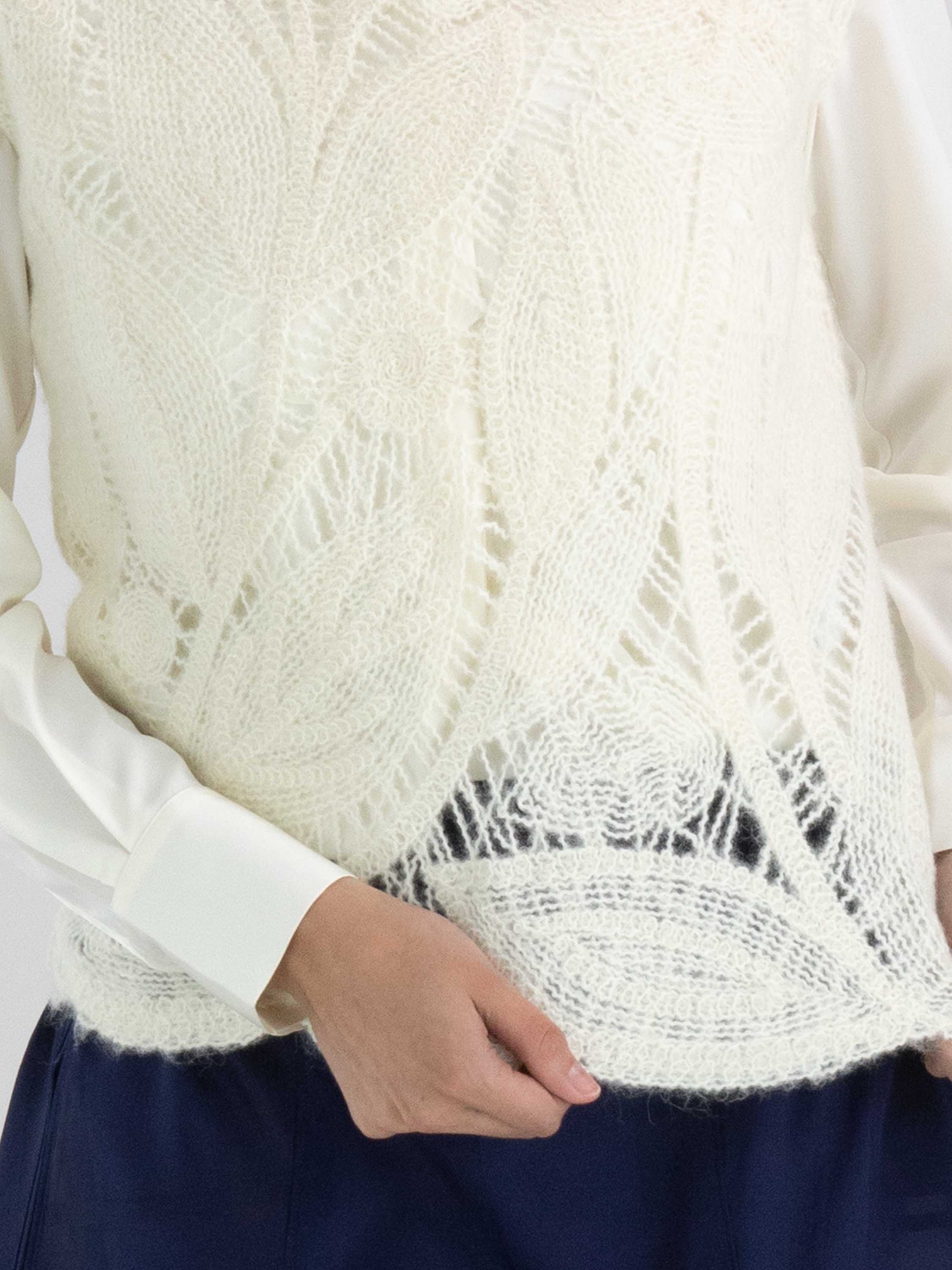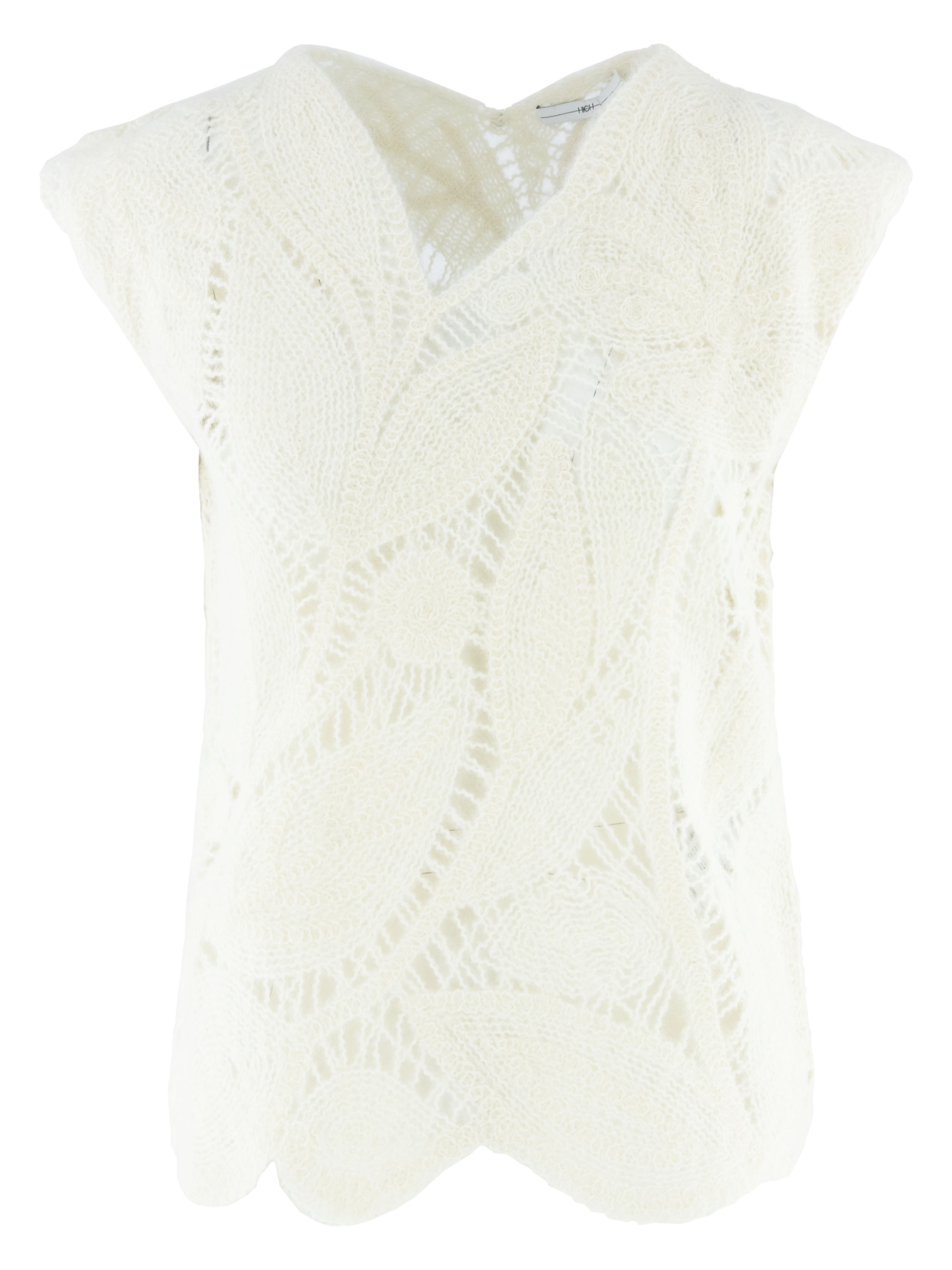 Een luxe open gebreide top van High in een patroon van bladeren in de kleur roomwit. Deze top mag op de hand worden gewassen.