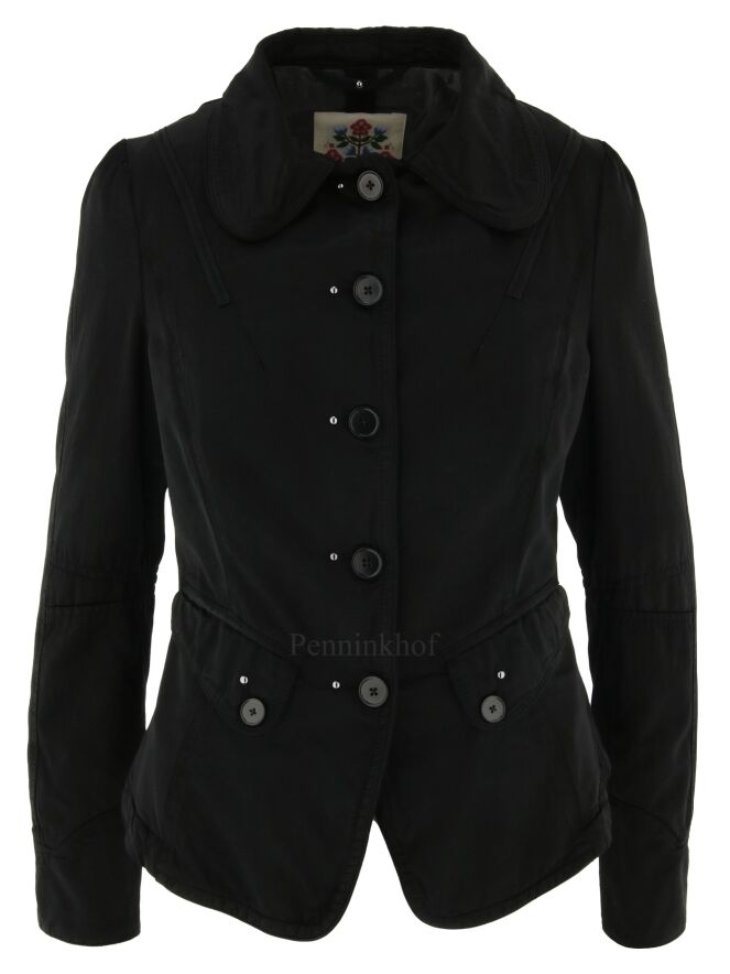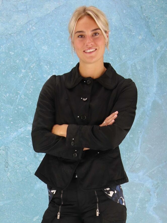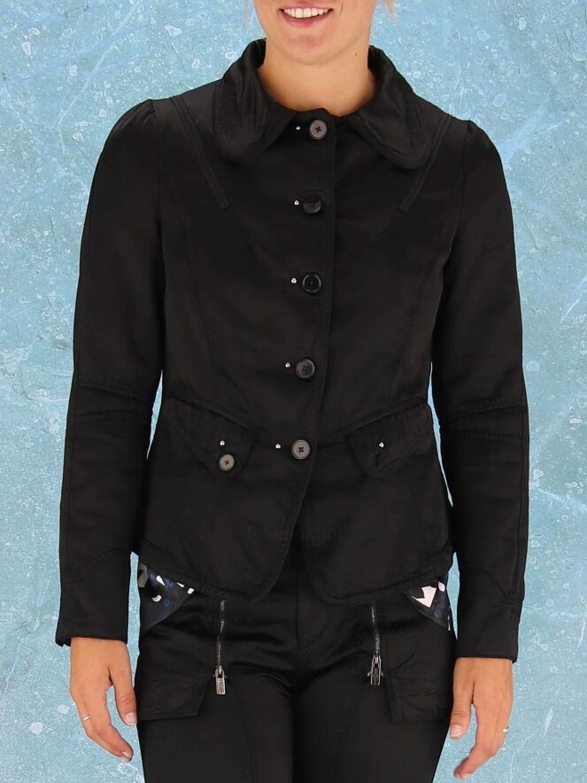 Een blazer van High in een zwarte mat satijnen stof. De blazer heeft pofmouwen en Aan de zijkant van de knopen van de sluiting zijn zilver kleurige ronde studs. De blazer heeft meerdere decoratieve stiknaden en op de kraag is de stof bij de uiteinden geruwd in een streeppatroon. De blazer is gevoerd en mag niet worden gewassen.