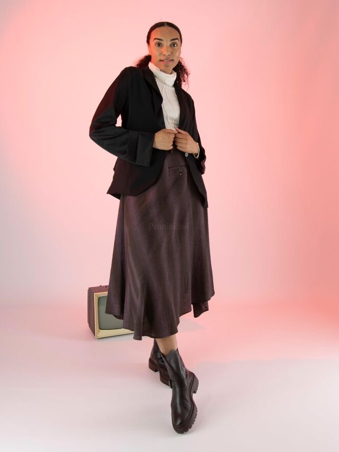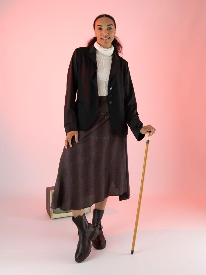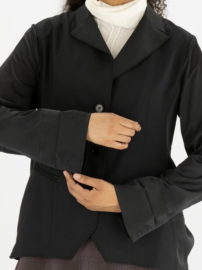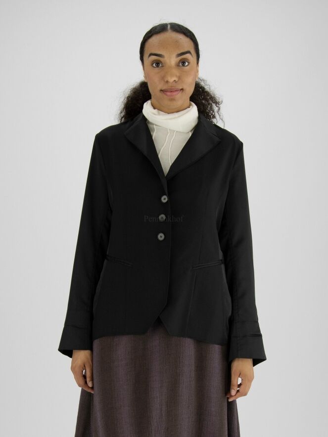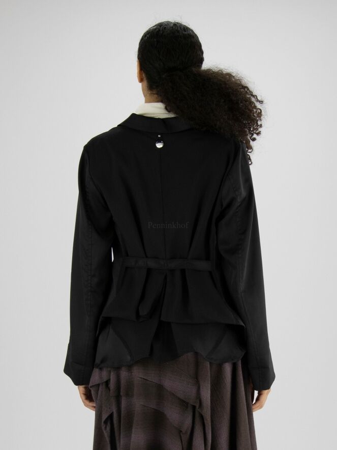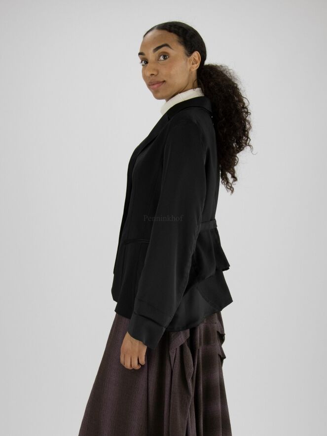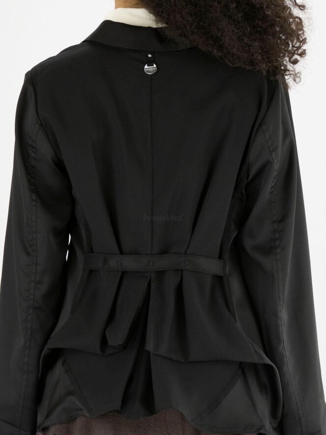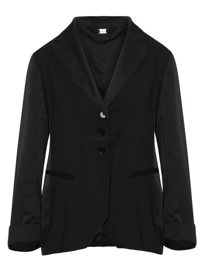 Een blazer van High in de kleur zwart. De blazer heeft een 3 knoops sluiting en de mouwen zijn in een mat satijnen stof. Deze blazer mag op de hand worden gewassen.